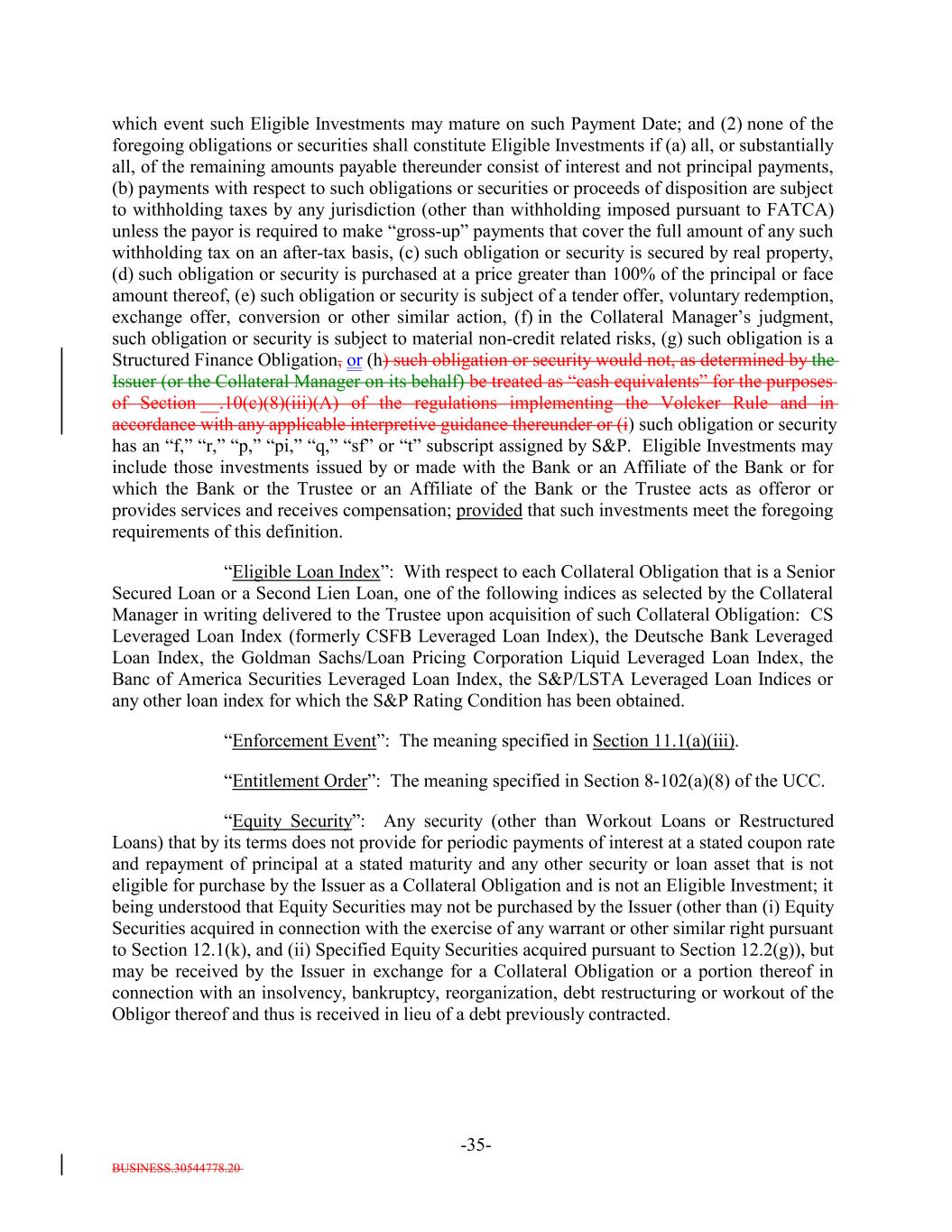 BUSINESS.30544778.20 -35- which event such Eligible Investments may mature on such Payment Date; and (2) none of the foregoing obligations or securities shall constitute Eligible Investments if (a) all, or substantially all, of the remaining amounts payable thereunder consist of interest and not principal payments, (b) payments with respect to such obligations or securities or proceeds of disposition are subject to withholding taxes by any jurisdiction (other than withholding imposed pursuant to FATCA) unless the payor is required to make “gross-up” payments that cover the full amount of any such withholding tax on an after-tax basis, (c) such obligation or security is secured by real property, (d) such obligation or security is purchased at a price greater than 100% of the principal or face amount thereof, (e) such obligation or security is subject of a tender offer, voluntary redemption, exchange offer, conversion or other similar action, (f) in the Collateral Manager’s judgment, such obligation or security is subject to material non-credit related risks, (g) such obligation is a Structured Finance Obligation, or (h) such obligation or security would not, as determined by the Issuer (or the Collateral Manager on its behalf) be treated as “cash equivalents” for the purposes of Section __.10(c)(8)(iii)(A) of the regulations implementing the Volcker Rule and in accordance with any applicable interpretive guidance thereunder or (i) such obligation or security has an “f,” “r,” “p,” “pi,” “q,” “sf” or “t” subscript assigned by S&P. Eligible Investments may include those investments issued by or made with the Bank or an Affiliate of the Bank or for which the Bank or the Trustee or an Affiliate of the Bank or the Trustee acts as offeror or provides services and receives compensation; provided that such investments meet the foregoing requirements of this definition. “Eligible Loan Index”: With respect to each Collateral Obligation that is a Senior Secured Loan or a Second Lien Loan, one of the following indices as selected by the Collateral Manager in writing delivered to the Trustee upon acquisition of such Collateral Obligation: CS Leveraged Loan Index (formerly CSFB Leveraged Loan Index), the Deutsche Bank Leveraged Loan Index, the Goldman Sachs/Loan Pricing Corporation Liquid Leveraged Loan Index, the Banc of America Securities Leveraged Loan Index, the S&P/LSTA Leveraged Loan Indices or any other loan index for which the S&P Rating Condition has been obtained. “Enforcement Event”: The meaning specified in Section 11.1(a)(iii). “Entitlement Order”: The meaning specified in Section 8-102(a)(8) of the UCC. “Equity Security”: Any security (other than Workout Loans or Restructured Loans) that by its terms does not provide for periodic payments of interest at a stated coupon rate and repayment of principal at a stated maturity and any other security or loan asset that is not eligible for purchase by the Issuer as a Collateral Obligation and is not an Eligible Investment; it being understood that Equity Securities may not be purchased by the Issuer (other than (i) Equity Securities acquired in connection with the exercise of any warrant or other similar right pursuant to Section 12.1(k), and (ii) Specified Equity Securities acquired pursuant to Section 12.2(g)), but may be received by the Issuer in exchange for a Collateral Obligation or a portion thereof in connection with an insolvency, bankruptcy, reorganization, debt restructuring or workout of the Obligor thereof and thus is received in lieu of a debt previously contracted.