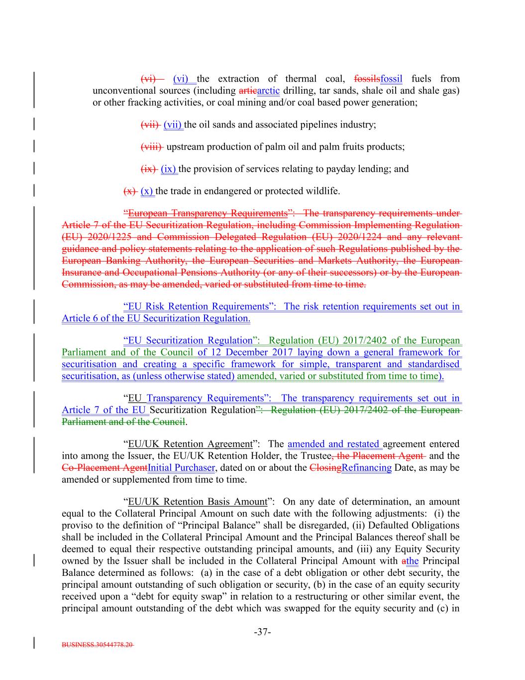 BUSINESS.30544778.20 -37- (vi) (vi) the extraction of thermal coal, fossilsfossil fuels from unconventional sources (including articarctic drilling, tar sands, shale oil and shale gas) or other fracking activities, or coal mining and/or coal based power generation; (vii) (vii) the oil sands and associated pipelines industry; (viii) upstream production of palm oil and palm fruits products; (ix) (ix) the provision of services relating to payday lending; and (x) (x) the trade in endangered or protected wildlife. “European Transparency Requirements”: The transparency requirements under Article 7 of the EU Securitization Regulation, including Commission Implementing Regulation (EU) 2020/1225 and Commission Delegated Regulation (EU) 2020/1224 and any relevant guidance and policy statements relating to the application of such Regulations published by the European Banking Authority, the European Securities and Markets Authority, the European Insurance and Occupational Pensions Authority (or any of their successors) or by the European Commission, as may be amended, varied or substituted from time to time. “EU Risk Retention Requirements”: The risk retention requirements set out in Article 6 of the EU Securitization Regulation. “EU Securitization Regulation”: Regulation (EU) 2017/2402 of the European Parliament and of the Council of 12 December 2017 laying down a general framework for securitisation and creating a specific framework for simple, transparent and standardised securitisation, as (unless otherwise stated) amended, varied or substituted from time to time). “EU Transparency Requirements”: The transparency requirements set out in Article 7 of the EU Securitization Regulation”: Regulation (EU) 2017/2402 of the European Parliament and of the Council. “EU/UK Retention Agreement”: The amended and restated agreement entered into among the Issuer, the EU/UK Retention Holder, the Trustee, the Placement Agent and the Co-Placement AgentInitial Purchaser, dated on or about the ClosingRefinancing Date, as may be amended or supplemented from time to time. “EU/UK Retention Basis Amount”: On any date of determination, an amount equal to the Collateral Principal Amount on such date with the following adjustments: (i) the proviso to the definition of “Principal Balance” shall be disregarded, (ii) Defaulted Obligations shall be included in the Collateral Principal Amount and the Principal Balances thereof shall be deemed to equal their respective outstanding principal amounts, and (iii) any Equity Security owned by the Issuer shall be included in the Collateral Principal Amount with athe Principal Balance determined as follows: (a) in the case of a debt obligation or other debt security, the principal amount outstanding of such obligation or security, (b) in the case of an equity security received upon a “debt for equity swap” in relation to a restructuring or other similar event, the principal amount outstanding of the debt which was swapped for the equity security and (c) in