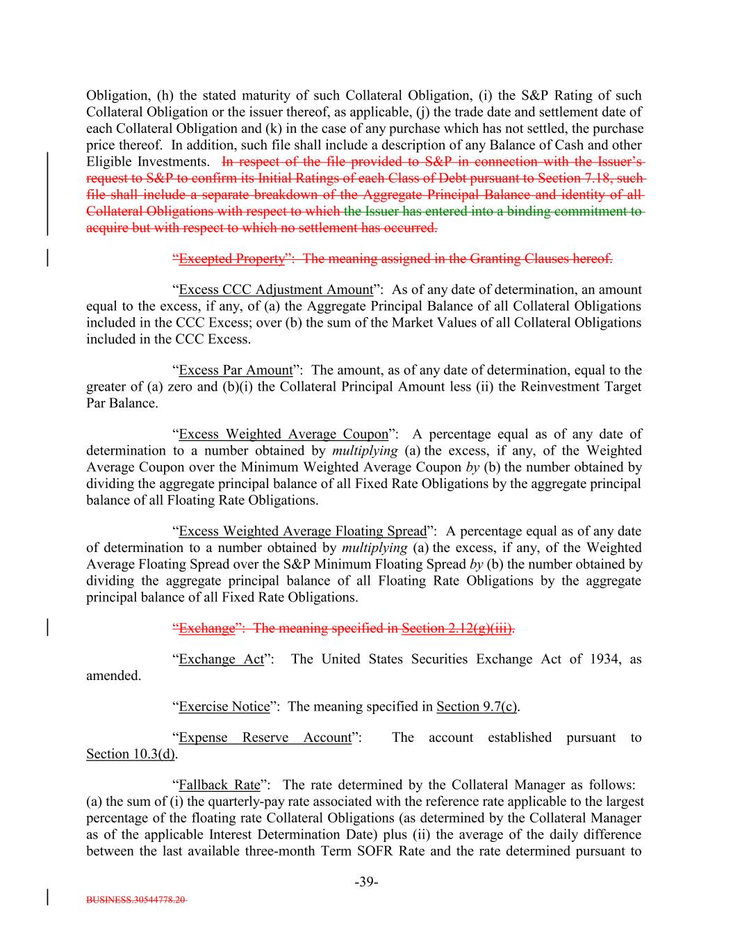 BUSINESS.30544778.20 -39- Obligation, (h) the stated maturity of such Collateral Obligation, (i) the S&P Rating of such Collateral Obligation or the issuer thereof, as applicable, (j) the trade date and settlement date of each Collateral Obligation and (k) in the case of any purchase which has not settled, the purchase price thereof. In addition, such file shall include a description of any Balance of Cash and other Eligible Investments. In respect of the file provided to S&P in connection with the Issuer’s request to S&P to confirm its Initial Ratings of each Class of Debt pursuant to Section 7.18, such file shall include a separate breakdown of the Aggregate Principal Balance and identity of all Collateral Obligations with respect to which the Issuer has entered into a binding commitment to acquire but with respect to which no settlement has occurred. “Excepted Property”: The meaning assigned in the Granting Clauses hereof. “Excess CCC Adjustment Amount”: As of any date of determination, an amount equal to the excess, if any, of (a) the Aggregate Principal Balance of all Collateral Obligations included in the CCC Excess; over (b) the sum of the Market Values of all Collateral Obligations included in the CCC Excess. “Excess Par Amount”: The amount, as of any date of determination, equal to the greater of (a) zero and (b)(i) the Collateral Principal Amount less (ii) the Reinvestment Target Par Balance. “Excess Weighted Average Coupon”: A percentage equal as of any date of determination to a number obtained by multiplying (a) the excess, if any, of the Weighted Average Coupon over the Minimum Weighted Average Coupon by (b) the number obtained by dividing the aggregate principal balance of all Fixed Rate Obligations by the aggregate principal balance of all Floating Rate Obligations. “Excess Weighted Average Floating Spread”: A percentage equal as of any date of determination to a number obtained by multiplying (a) the excess, if any, of the Weighted Average Floating Spread over the S&P Minimum Floating Spread by (b) the number obtained by dividing the aggregate principal balance of all Floating Rate Obligations by the aggregate principal balance of all Fixed Rate Obligations. “Exchange”: The meaning specified in Section 2.12(g)(iii). “Exchange Act”: The United States Securities Exchange Act of 1934, as amended. “Exercise Notice”: The meaning specified in Section 9.7(c). “Expense Reserve Account”: The account established pursuant to Section 10.3(d). “Fallback Rate”: The rate determined by the Collateral Manager as follows: (a) the sum of (i) the quarterly-pay rate associated with the reference rate applicable to the largest percentage of the floating rate Collateral Obligations (as determined by the Collateral Manager as of the applicable Interest Determination Date) plus (ii) the average of the daily difference between the last available three-month Term SOFR Rate and the rate determined pursuant to