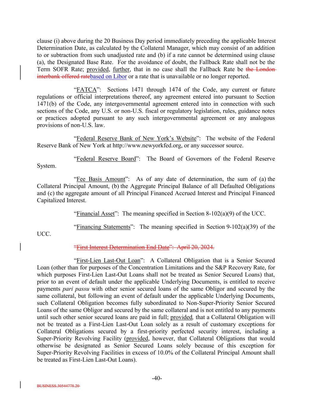 BUSINESS.30544778.20 -40- clause (i) above during the 20 Business Day period immediately preceding the applicable Interest Determination Date, as calculated by the Collateral Manager, which may consist of an addition to or subtraction from such unadjusted rate and (b) if a rate cannot be determined using clause (a), the Designated Base Rate. For the avoidance of doubt, the Fallback Rate shall not be the Term SOFR Rate; provided, further, that in no case shall the Fallback Rate be the London interbank offered ratebased on Libor or a rate that is unavailable or no longer reported. “FATCA”: Sections 1471 through 1474 of the Code, any current or future regulations or official interpretations thereof, any agreement entered into pursuant to Section 1471(b) of the Code, any intergovernmental agreement entered into in connection with such sections of the Code, any U.S. or non-U.S. fiscal or regulatory legislation, rules, guidance notes or practices adopted pursuant to any such intergovernmental agreement or any analogous provisions of non-U.S. law. “Federal Reserve Bank of New York’s Website”: The website of the Federal Reserve Bank of New York at http://www.newyorkfed.org, or any successor source. “Federal Reserve Board”: The Board of Governors of the Federal Reserve System. “Fee Basis Amount”: As of any date of determination, the sum of (a) the Collateral Principal Amount, (b) the Aggregate Principal Balance of all Defaulted Obligations and (c) the aggregate amount of all Principal Financed Accrued Interest and Principal Financed Capitalized Interest. “Financial Asset”: The meaning specified in Section 8-102(a)(9) of the UCC. “Financing Statements”: The meaning specified in Section 9-102(a)(39) of the UCC. “First Interest Determination End Date”: April 20, 2024. “First-Lien Last-Out Loan”: A Collateral Obligation that is a Senior Secured Loan (other than for purposes of the Concentration Limitations and the S&P Recovery Rate, for which purposes First-Lien Last-Out Loans shall not be treated as Senior Secured Loans) that, prior to an event of default under the applicable Underlying Documents, is entitled to receive payments pari passu with other senior secured loans of the same Obligor and secured by the same collateral, but following an event of default under the applicable Underlying Documents, such Collateral Obligation becomes fully subordinated to Non-Super-Priority Senior Secured Loans of the same Obligor and secured by the same collateral and is not entitled to any payments until such other senior secured loans are paid in full; provided, that a Collateral Obligation will not be treated as a First-Lien Last-Out Loan solely as a result of customary exceptions for Collateral Obligations secured by a first-priority perfected security interest, including a Super-Priority Revolving Facility (provided, however, that Collateral Obligations that would otherwise be designated as Senior Secured Loans solely because of this exception for Super-Priority Revolving Facilities in excess of 10.0% of the Collateral Principal Amount shall be treated as First-Lien Last-Out Loans).