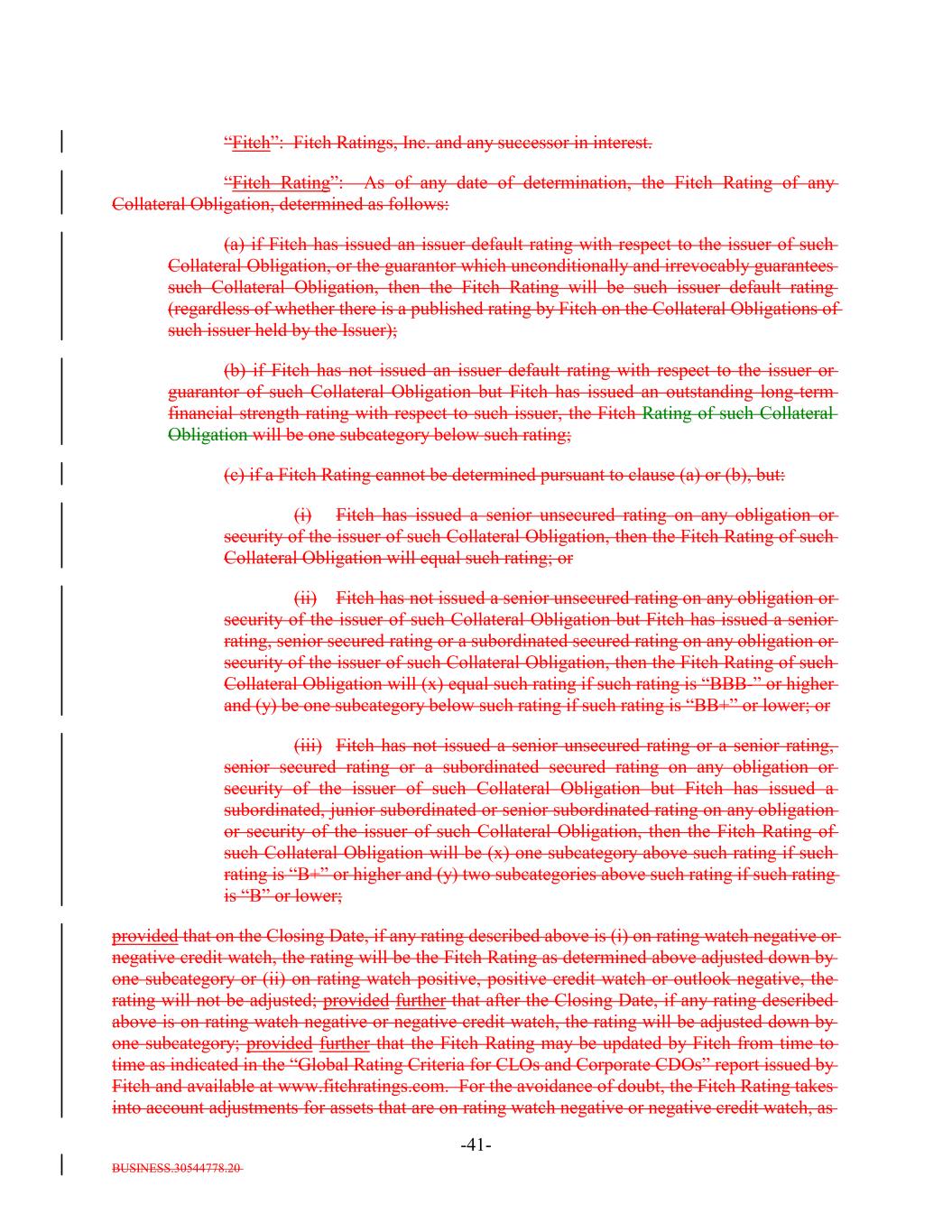 BUSINESS.30544778.20 -41- “Fitch”: Fitch Ratings, Inc. and any successor in interest. “Fitch Rating”: As of any date of determination, the Fitch Rating of any Collateral Obligation, determined as follows: (a) if Fitch has issued an issuer default rating with respect to the issuer of such Collateral Obligation, or the guarantor which unconditionally and irrevocably guarantees such Collateral Obligation, then the Fitch Rating will be such issuer default rating (regardless of whether there is a published rating by Fitch on the Collateral Obligations of such issuer held by the Issuer); (b) if Fitch has not issued an issuer default rating with respect to the issuer or guarantor of such Collateral Obligation but Fitch has issued an outstanding long-term financial strength rating with respect to such issuer, the Fitch Rating of such Collateral Obligation will be one subcategory below such rating; (c) if a Fitch Rating cannot be determined pursuant to clause (a) or (b), but: (i) Fitch has issued a senior unsecured rating on any obligation or security of the issuer of such Collateral Obligation, then the Fitch Rating of such Collateral Obligation will equal such rating; or (ii) Fitch has not issued a senior unsecured rating on any obligation or security of the issuer of such Collateral Obligation but Fitch has issued a senior rating, senior secured rating or a subordinated secured rating on any obligation or security of the issuer of such Collateral Obligation, then the Fitch Rating of such Collateral Obligation will (x) equal such rating if such rating is “BBB-” or higher and (y) be one subcategory below such rating if such rating is “BB+” or lower; or (iii) Fitch has not issued a senior unsecured rating or a senior rating, senior secured rating or a subordinated secured rating on any obligation or security of the issuer of such Collateral Obligation but Fitch has issued a subordinated, junior subordinated or senior subordinated rating on any obligation or security of the issuer of such Collateral Obligation, then the Fitch Rating of such Collateral Obligation will be (x) one subcategory above such rating if such rating is “B+” or higher and (y) two subcategories above such rating if such rating is “B” or lower; provided that on the Closing Date, if any rating described above is (i) on rating watch negative or negative credit watch, the rating will be the Fitch Rating as determined above adjusted down by one subcategory or (ii) on rating watch positive, positive credit watch or outlook negative, the rating will not be adjusted; provided further that after the Closing Date, if any rating described above is on rating watch negative or negative credit watch, the rating will be adjusted down by one subcategory; provided further that the Fitch Rating may be updated by Fitch from time to time as indicated in the “Global Rating Criteria for CLOs and Corporate CDOs” report issued by Fitch and available at www.fitchratings.com. For the avoidance of doubt, the Fitch Rating takes into account adjustments for assets that are on rating watch negative or negative credit watch, as