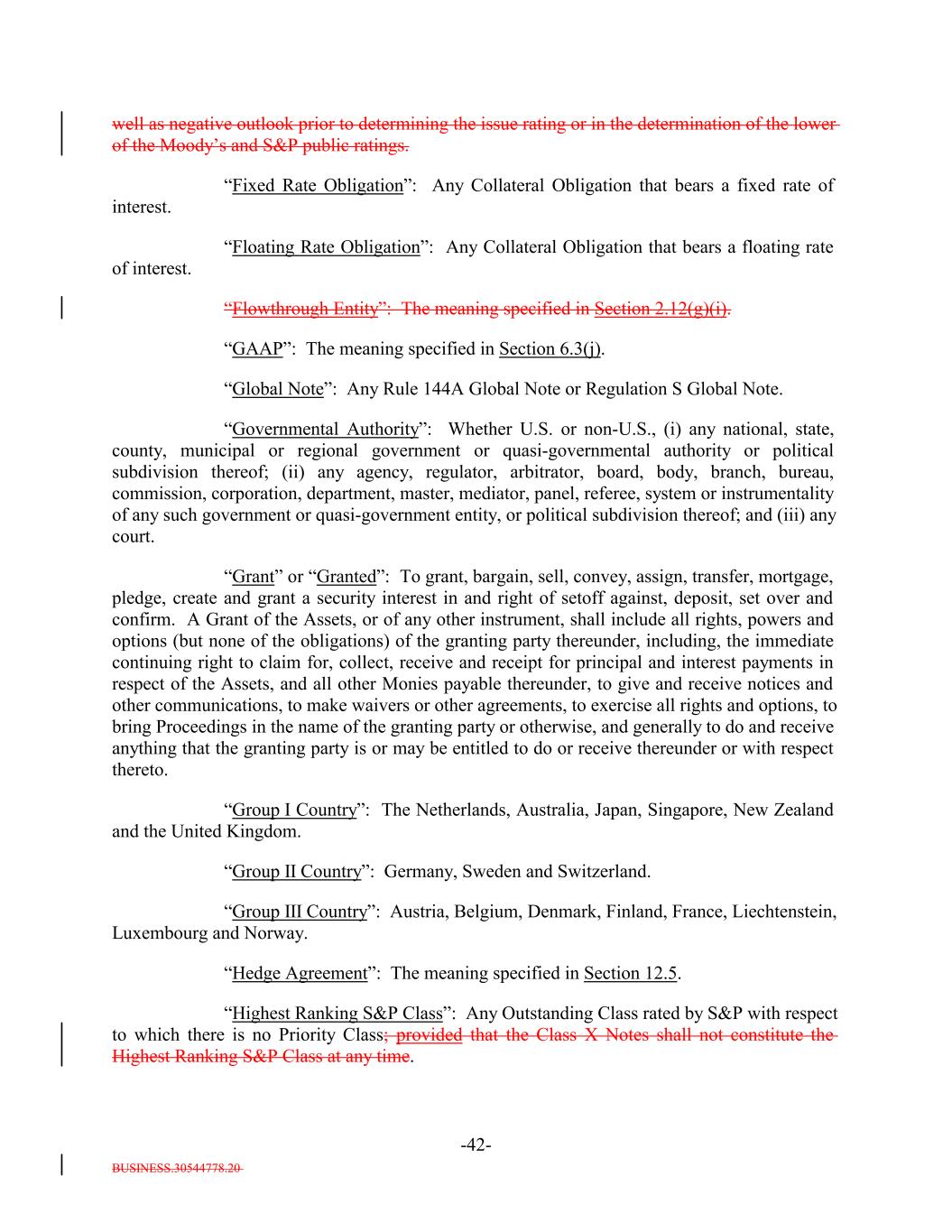 BUSINESS.30544778.20 -42- well as negative outlook prior to determining the issue rating or in the determination of the lower of the Moody’s and S&P public ratings. “Fixed Rate Obligation”: Any Collateral Obligation that bears a fixed rate of interest. “Floating Rate Obligation”: Any Collateral Obligation that bears a floating rate of interest. “Flowthrough Entity”: The meaning specified in Section 2.12(g)(i). “GAAP”: The meaning specified in Section 6.3(j). “Global Note”: Any Rule 144A Global Note or Regulation S Global Note. “Governmental Authority”: Whether U.S. or non-U.S., (i) any national, state, county, municipal or regional government or quasi-governmental authority or political subdivision thereof; (ii) any agency, regulator, arbitrator, board, body, branch, bureau, commission, corporation, department, master, mediator, panel, referee, system or instrumentality of any such government or quasi-government entity, or political subdivision thereof; and (iii) any court. “Grant” or “Granted”: To grant, bargain, sell, convey, assign, transfer, mortgage, pledge, create and grant a security interest in and right of setoff against, deposit, set over and confirm. A Grant of the Assets, or of any other instrument, shall include all rights, powers and options (but none of the obligations) of the granting party thereunder, including, the immediate continuing right to claim for, collect, receive and receipt for principal and interest payments in respect of the Assets, and all other Monies payable thereunder, to give and receive notices and other communications, to make waivers or other agreements, to exercise all rights and options, to bring Proceedings in the name of the granting party or otherwise, and generally to do and receive anything that the granting party is or may be entitled to do or receive thereunder or with respect thereto. “Group I Country”: The Netherlands, Australia, Japan, Singapore, New Zealand and the United Kingdom. “Group II Country”: Germany, Sweden and Switzerland. “Group III Country”: Austria, Belgium, Denmark, Finland, France, Liechtenstein, Luxembourg and Norway. “Hedge Agreement”: The meaning specified in Section 12.5. “Highest Ranking S&P Class”: Any Outstanding Class rated by S&P with respect to which there is no Priority Class; provided that the Class X Notes shall not constitute the Highest Ranking S&P Class at any time.