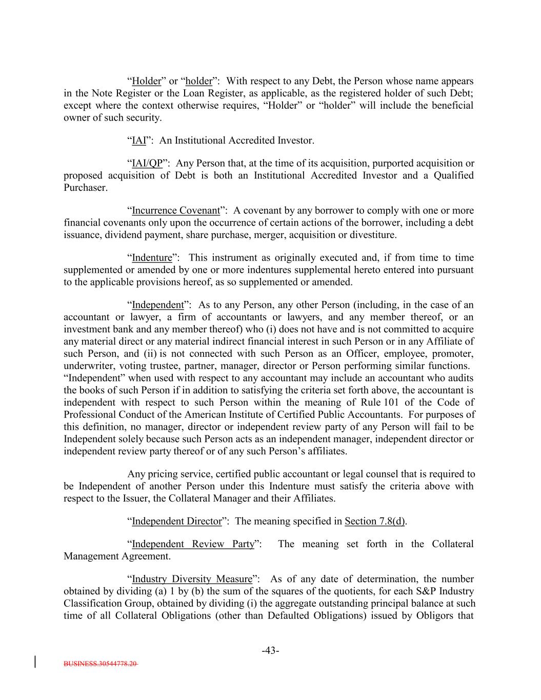 BUSINESS.30544778.20 -43- “Holder” or “holder”: With respect to any Debt, the Person whose name appears in the Note Register or the Loan Register, as applicable, as the registered holder of such Debt; except where the context otherwise requires, “Holder” or “holder” will include the beneficial owner of such security. “IAI”: An Institutional Accredited Investor. “IAI/QP”: Any Person that, at the time of its acquisition, purported acquisition or proposed acquisition of Debt is both an Institutional Accredited Investor and a Qualified Purchaser. “Incurrence Covenant”: A covenant by any borrower to comply with one or more financial covenants only upon the occurrence of certain actions of the borrower, including a debt issuance, dividend payment, share purchase, merger, acquisition or divestiture. “Indenture”: This instrument as originally executed and, if from time to time supplemented or amended by one or more indentures supplemental hereto entered into pursuant to the applicable provisions hereof, as so supplemented or amended. “Independent”: As to any Person, any other Person (including, in the case of an accountant or lawyer, a firm of accountants or lawyers, and any member thereof, or an investment bank and any member thereof) who (i) does not have and is not committed to acquire any material direct or any material indirect financial interest in such Person or in any Affiliate of such Person, and (ii) is not connected with such Person as an Officer, employee, promoter, underwriter, voting trustee, partner, manager, director or Person performing similar functions. “Independent” when used with respect to any accountant may include an accountant who audits the books of such Person if in addition to satisfying the criteria set forth above, the accountant is independent with respect to such Person within the meaning of Rule 101 of the Code of Professional Conduct of the American Institute of Certified Public Accountants. For purposes of this definition, no manager, director or independent review party of any Person will fail to be Independent solely because such Person acts as an independent manager, independent director or independent review party thereof or of any such Person’s affiliates. Any pricing service, certified public accountant or legal counsel that is required to be Independent of another Person under this Indenture must satisfy the criteria above with respect to the Issuer, the Collateral Manager and their Affiliates. “Independent Director”: The meaning specified in Section 7.8(d). “Independent Review Party”: The meaning set forth in the Collateral Management Agreement. “Industry Diversity Measure”: As of any date of determination, the number obtained by dividing (a) 1 by (b) the sum of the squares of the quotients, for each S&P Industry Classification Group, obtained by dividing (i) the aggregate outstanding principal balance at such time of all Collateral Obligations (other than Defaulted Obligations) issued by Obligors that