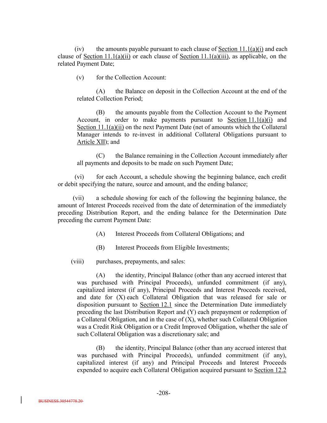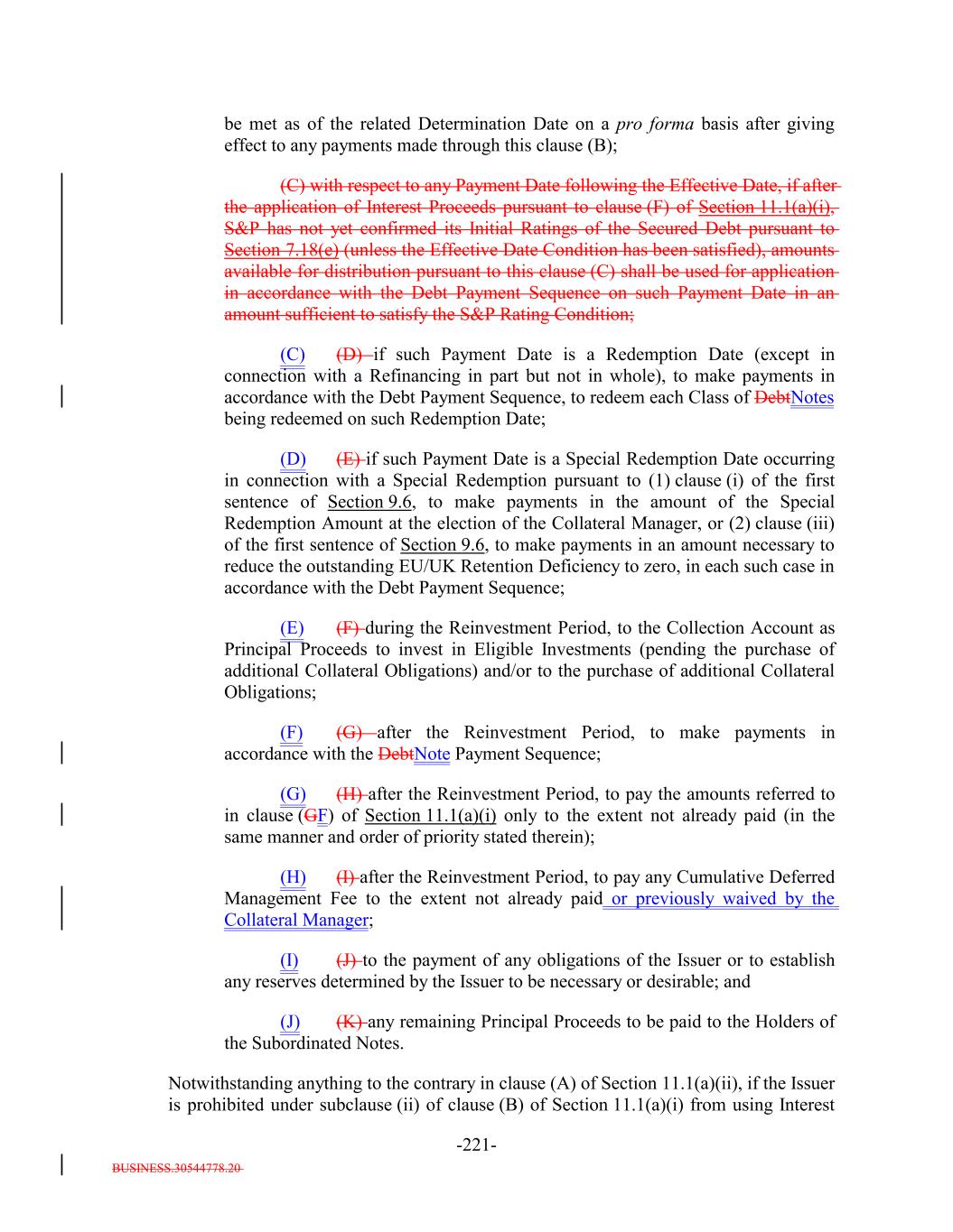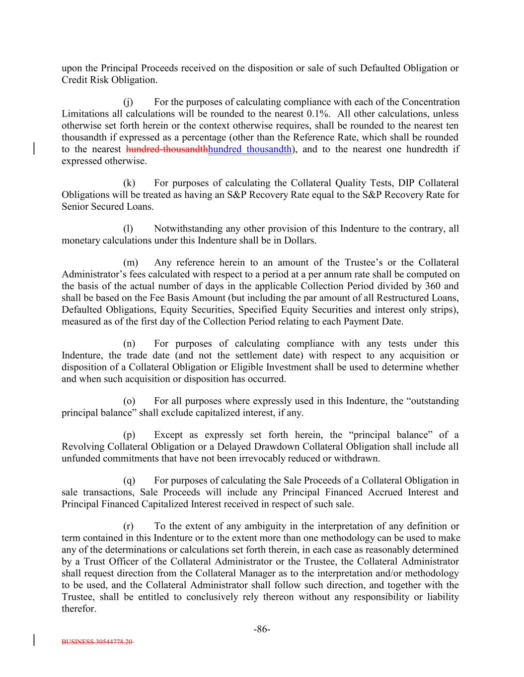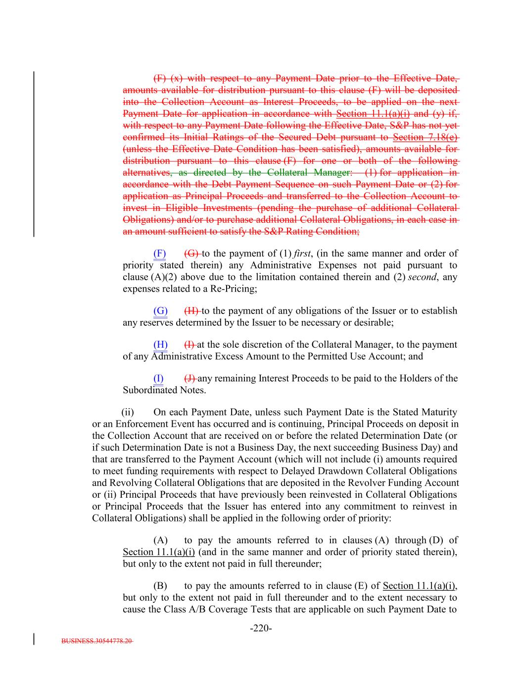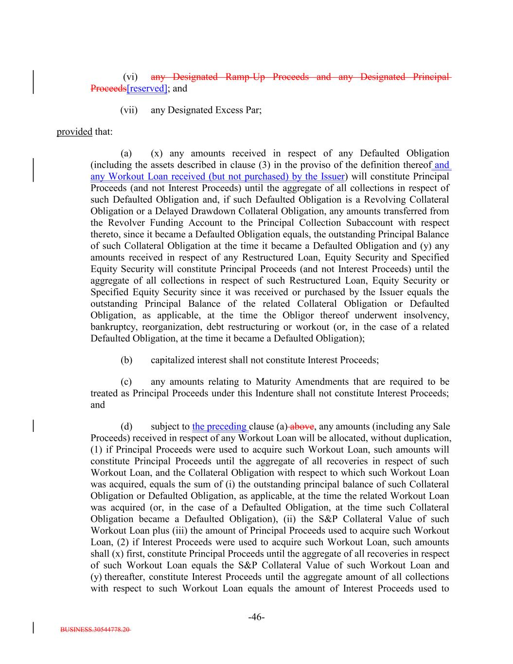 BUSINESS.30544778.20 -46- (vi) any Designated Ramp-Up Proceeds and any Designated Principal Proceeds[reserved]; and (vii) any Designated Excess Par; provided that: (a) (x) any amounts received in respect of any Defaulted Obligation (including the assets described in clause (3) in the proviso of the definition thereof and any Workout Loan received (but not purchased) by the Issuer) will constitute Principal Proceeds (and not Interest Proceeds) until the aggregate of all collections in respect of such Defaulted Obligation and, if such Defaulted Obligation is a Revolving Collateral Obligation or a Delayed Drawdown Collateral Obligation, any amounts transferred from the Revolver Funding Account to the Principal Collection Subaccount with respect thereto, since it became a Defaulted Obligation equals, the outstanding Principal Balance of such Collateral Obligation at the time it became a Defaulted Obligation and (y) any amounts received in respect of any Restructured Loan, Equity Security and Specified Equity Security will constitute Principal Proceeds (and not Interest Proceeds) until the aggregate of all collections in respect of such Restructured Loan, Equity Security or Specified Equity Security since it was received or purchased by the Issuer equals the outstanding Principal Balance of the related Collateral Obligation or Defaulted Obligation, as applicable, at the time the Obligor thereof underwent insolvency, bankruptcy, reorganization, debt restructuring or workout (or, in the case of a related Defaulted Obligation, at the time it became a Defaulted Obligation); (b) capitalized interest shall not constitute Interest Proceeds; (c) any amounts relating to Maturity Amendments that are required to be treated as Principal Proceeds under this Indenture shall not constitute Interest Proceeds; and (d) subject to the preceding clause (a) above, any amounts (including any Sale Proceeds) received in respect of any Workout Loan will be allocated, without duplication, (1) if Principal Proceeds were used to acquire such Workout Loan, such amounts will constitute Principal Proceeds until the aggregate of all recoveries in respect of such Workout Loan, and the Collateral Obligation with respect to which such Workout Loan was acquired, equals the sum of (i) the outstanding principal balance of such Collateral Obligation or Defaulted Obligation, as applicable, at the time the related Workout Loan was acquired (or, in the case of a Defaulted Obligation, at the time such Collateral Obligation became a Defaulted Obligation), (ii) the S&P Collateral Value of such Workout Loan plus (iii) the amount of Principal Proceeds used to acquire such Workout Loan, (2) if Interest Proceeds were used to acquire such Workout Loan, such amounts shall (x) first, constitute Principal Proceeds until the aggregate of all recoveries in respect of such Workout Loan equals the S&P Collateral Value of such Workout Loan and (y) thereafter, constitute Interest Proceeds until the aggregate amount of all collections with respect to such Workout Loan equals the amount of Interest Proceeds used to