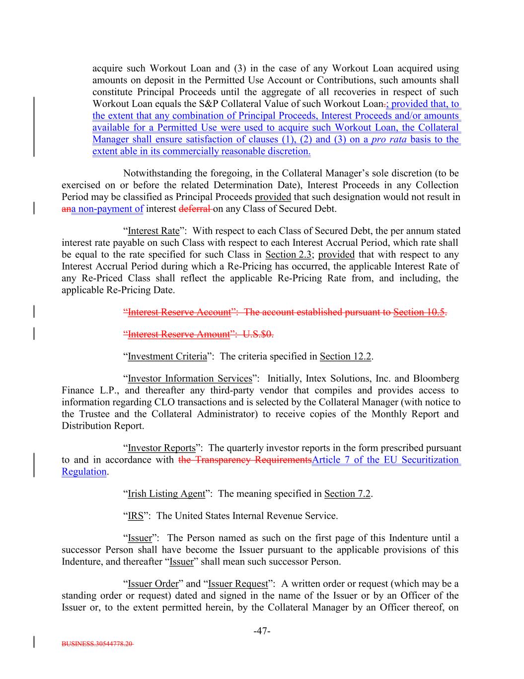 BUSINESS.30544778.20 -47- acquire such Workout Loan and (3) in the case of any Workout Loan acquired using amounts on deposit in the Permitted Use Account or Contributions, such amounts shall constitute Principal Proceeds until the aggregate of all recoveries in respect of such Workout Loan equals the S&P Collateral Value of such Workout Loan.; provided that, to the extent that any combination of Principal Proceeds, Interest Proceeds and/or amounts available for a Permitted Use were used to acquire such Workout Loan, the Collateral Manager shall ensure satisfaction of clauses (1), (2) and (3) on a pro rata basis to the extent able in its commercially reasonable discretion. Notwithstanding the foregoing, in the Collateral Manager’s sole discretion (to be exercised on or before the related Determination Date), Interest Proceeds in any Collection Period may be classified as Principal Proceeds provided that such designation would not result in ana non-payment of interest deferral on any Class of Secured Debt. “Interest Rate”: With respect to each Class of Secured Debt, the per annum stated interest rate payable on such Class with respect to each Interest Accrual Period, which rate shall be equal to the rate specified for such Class in Section 2.3; provided that with respect to any Interest Accrual Period during which a Re-Pricing has occurred, the applicable Interest Rate of any Re-Priced Class shall reflect the applicable Re-Pricing Rate from, and including, the applicable Re-Pricing Date. “Interest Reserve Account”: The account established pursuant to Section 10.5. “Interest Reserve Amount”: U.S.$0. “Investment Criteria”: The criteria specified in Section 12.2. “Investor Information Services”: Initially, Intex Solutions, Inc. and Bloomberg Finance L.P., and thereafter any third-party vendor that compiles and provides access to information regarding CLO transactions and is selected by the Collateral Manager (with notice to the Trustee and the Collateral Administrator) to receive copies of the Monthly Report and Distribution Report. “Investor Reports”: The quarterly investor reports in the form prescribed pursuant to and in accordance with the Transparency RequirementsArticle 7 of the EU Securitization Regulation. “Irish Listing Agent”: The meaning specified in Section 7.2. “IRS”: The United States Internal Revenue Service. “Issuer”: The Person named as such on the first page of this Indenture until a successor Person shall have become the Issuer pursuant to the applicable provisions of this Indenture, and thereafter “Issuer” shall mean such successor Person. “Issuer Order” and “Issuer Request”: A written order or request (which may be a standing order or request) dated and signed in the name of the Issuer or by an Officer of the Issuer or, to the extent permitted herein, by the Collateral Manager by an Officer thereof, on