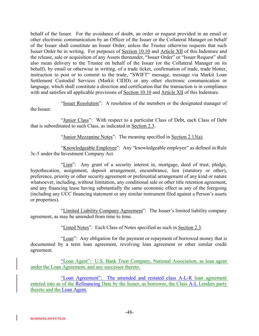BUSINESS.30544778.20 -48- behalf of the Issuer. For the avoidance of doubt, an order or request provided in an email or other electronic communication by an Officer of the Issuer or the Collateral Manager on behalf of the Issuer shall constitute an Issuer Order, unless the Trustee otherwise requests that such Issuer Order be in writing. For purposes of Section 10.10 and Article XII of this Indenture and the release, sale or acquisition of any Assets thereunder, “Issuer Order” or “Issuer Request” shall also mean delivery to the Trustee on behalf of the Issuer (or the Collateral Manager on its behalf), by email or otherwise in writing, of a trade ticket, confirmation of trade, trade blotter, instruction to post or to commit to the trade, “SWIFT” message, message via Markit Loan Settlement Custodial Services (Markit CIDD) or any other electronic communication or language, which shall constitute a direction and certification that the transaction is in compliance with and satisfies all applicable provisions of Section 10.10 and Article XII of this Indenture. “Issuer Resolution”: A resolution of the members or the designated manager of the Issuer. “Junior Class”: With respect to a particular Class of Debt, each Class of Debt that is subordinated to such Class, as indicated in Section 2.3. “Junior Mezzanine Notes”: The meaning specified in Section 2.13(a). “Knowledgeable Employee”: Any “knowledgeable employee” as defined in Rule 3c-5 under the Investment Company Act. “Lien”: Any grant of a security interest in, mortgage, deed of trust, pledge, hypothecation, assignment, deposit arrangement, encumbrance, lien (statutory or other), preference, priority or other security agreement or preferential arrangement of any kind or nature whatsoever, including, without limitation, any conditional sale or other title retention agreement, and any financing lease having substantially the same economic effect as any of the foregoing (including any UCC financing statement or any similar instrument filed against a Person’s assets or properties). “Limited Liability Company Agreement”: The Issuer’s limited liability company agreement, as may be amended from time to time. “Listed Notes”: Each Class of Notes specified as such in Section 2.3. “Loan”: Any obligation for the payment or repayment of borrowed money that is documented by a term loan agreement, revolving loan agreement or other similar credit agreement. “Loan Agent”: U.S. Bank Trust Company, National Association, as loan agent under the Loan Agreement, and any successor thereto. “Loan Agreement”: The amended and restated class A-L-R loan agreement entered into as of the Refinancing Date by the Issuer, as borrower, the Class A-L Lenders party thereto and the Loan Agent.