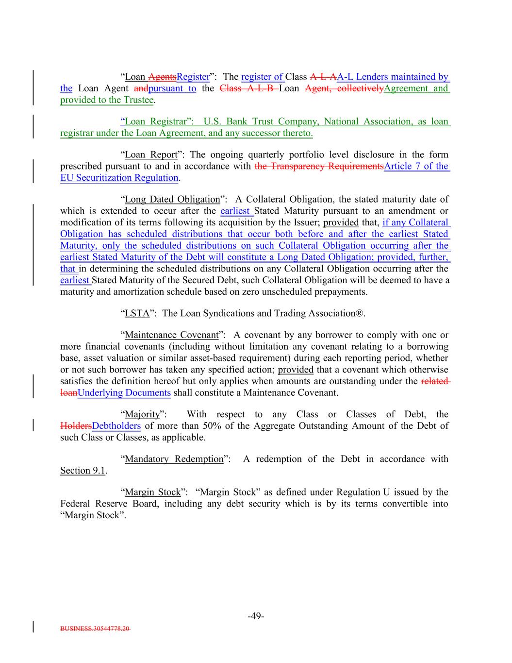 BUSINESS.30544778.20 -49- “Loan AgentsRegister”: The register of Class A-L-AA-L Lenders maintained by the Loan Agent andpursuant to the Class A-L-B Loan Agent, collectivelyAgreement and provided to the Trustee. “Loan Registrar”: U.S. Bank Trust Company, National Association, as loan registrar under the Loan Agreement, and any successor thereto. “Loan Report”: The ongoing quarterly portfolio level disclosure in the form prescribed pursuant to and in accordance with the Transparency RequirementsArticle 7 of the EU Securitization Regulation. “Long Dated Obligation”: A Collateral Obligation, the stated maturity date of which is extended to occur after the earliest Stated Maturity pursuant to an amendment or modification of its terms following its acquisition by the Issuer; provided that, if any Collateral Obligation has scheduled distributions that occur both before and after the earliest Stated Maturity, only the scheduled distributions on such Collateral Obligation occurring after the earliest Stated Maturity of the Debt will constitute a Long Dated Obligation; provided, further, that in determining the scheduled distributions on any Collateral Obligation occurring after the earliest Stated Maturity of the Secured Debt, such Collateral Obligation will be deemed to have a maturity and amortization schedule based on zero unscheduled prepayments. “LSTA”: The Loan Syndications and Trading Association®. “Maintenance Covenant”: A covenant by any borrower to comply with one or more financial covenants (including without limitation any covenant relating to a borrowing base, asset valuation or similar asset-based requirement) during each reporting period, whether or not such borrower has taken any specified action; provided that a covenant which otherwise satisfies the definition hereof but only applies when amounts are outstanding under the related loanUnderlying Documents shall constitute a Maintenance Covenant. “Majority”: With respect to any Class or Classes of Debt, the HoldersDebtholders of more than 50% of the Aggregate Outstanding Amount of the Debt of such Class or Classes, as applicable. “Mandatory Redemption”: A redemption of the Debt in accordance with Section 9.1. “Margin Stock”: “Margin Stock” as defined under Regulation U issued by the Federal Reserve Board, including any debt security which is by its terms convertible into “Margin Stock”.