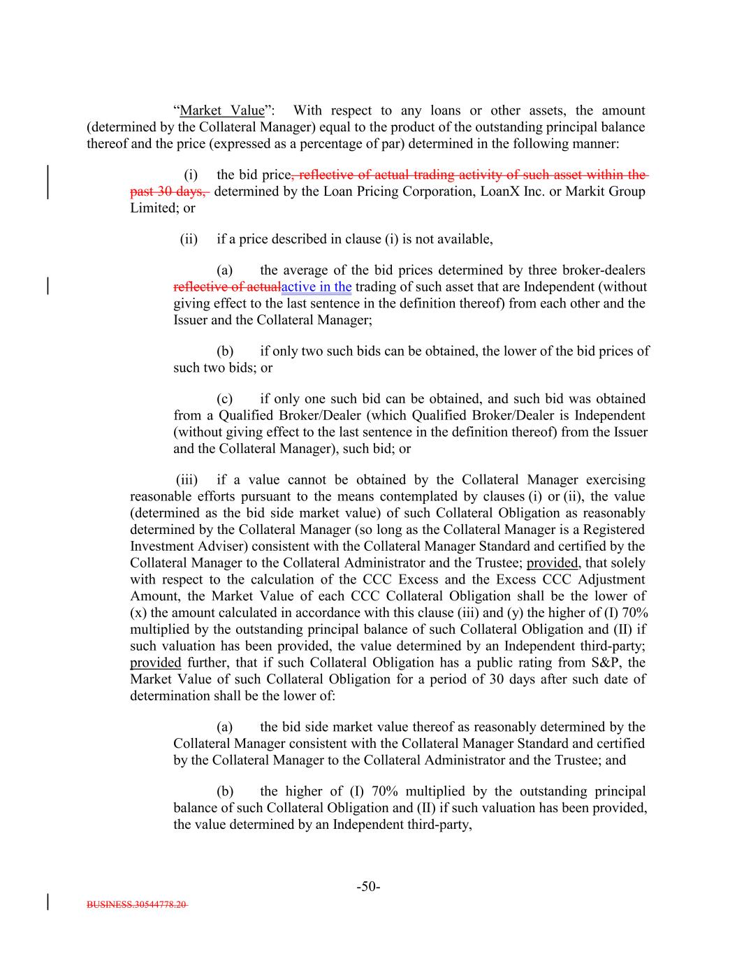 BUSINESS.30544778.20 -50- “Market Value”: With respect to any loans or other assets, the amount (determined by the Collateral Manager) equal to the product of the outstanding principal balance thereof and the price (expressed as a percentage of par) determined in the following manner: (i) the bid price, reflective of actual trading activity of such asset within the past 30 days, determined by the Loan Pricing Corporation, LoanX Inc. or Markit Group Limited; or (ii) if a price described in clause (i) is not available, (a) the average of the bid prices determined by three broker-dealers reflective of actualactive in the trading of such asset that are Independent (without giving effect to the last sentence in the definition thereof) from each other and the Issuer and the Collateral Manager; (b) if only two such bids can be obtained, the lower of the bid prices of such two bids; or (c) if only one such bid can be obtained, and such bid was obtained from a Qualified Broker/Dealer (which Qualified Broker/Dealer is Independent (without giving effect to the last sentence in the definition thereof) from the Issuer and the Collateral Manager), such bid; or (iii) if a value cannot be obtained by the Collateral Manager exercising reasonable efforts pursuant to the means contemplated by clauses (i) or (ii), the value (determined as the bid side market value) of such Collateral Obligation as reasonably determined by the Collateral Manager (so long as the Collateral Manager is a Registered Investment Adviser) consistent with the Collateral Manager Standard and certified by the Collateral Manager to the Collateral Administrator and the Trustee; provided, that solely with respect to the calculation of the CCC Excess and the Excess CCC Adjustment Amount, the Market Value of each CCC Collateral Obligation shall be the lower of (x) the amount calculated in accordance with this clause (iii) and (y) the higher of (I) 70% multiplied by the outstanding principal balance of such Collateral Obligation and (II) if such valuation has been provided, the value determined by an Independent third-party; provided further, that if such Collateral Obligation has a public rating from S&P, the Market Value of such Collateral Obligation for a period of 30 days after such date of determination shall be the lower of: (a) the bid side market value thereof as reasonably determined by the Collateral Manager consistent with the Collateral Manager Standard and certified by the Collateral Manager to the Collateral Administrator and the Trustee; and (b) the higher of (I) 70% multiplied by the outstanding principal balance of such Collateral Obligation and (II) if such valuation has been provided, the value determined by an Independent third-party,