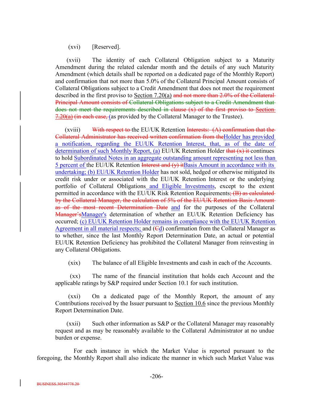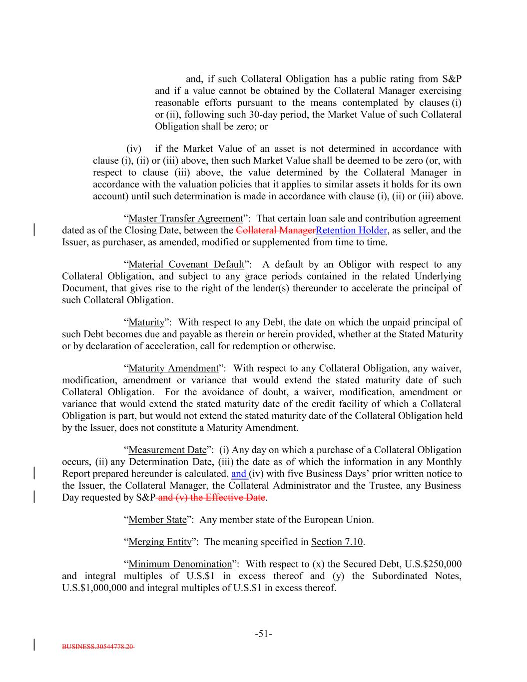 BUSINESS.30544778.20 -51- and, if such Collateral Obligation has a public rating from S&P and if a value cannot be obtained by the Collateral Manager exercising reasonable efforts pursuant to the means contemplated by clauses (i) or (ii), following such 30-day period, the Market Value of such Collateral Obligation shall be zero; or (iv) if the Market Value of an asset is not determined in accordance with clause (i), (ii) or (iii) above, then such Market Value shall be deemed to be zero (or, with respect to clause (iii) above, the value determined by the Collateral Manager in accordance with the valuation policies that it applies to similar assets it holds for its own account) until such determination is made in accordance with clause (i), (ii) or (iii) above. “Master Transfer Agreement”: That certain loan sale and contribution agreement dated as of the Closing Date, between the Collateral ManagerRetention Holder, as seller, and the Issuer, as purchaser, as amended, modified or supplemented from time to time. “Material Covenant Default”: A default by an Obligor with respect to any Collateral Obligation, and subject to any grace periods contained in the related Underlying Document, that gives rise to the right of the lender(s) thereunder to accelerate the principal of such Collateral Obligation. “Maturity”: With respect to any Debt, the date on which the unpaid principal of such Debt becomes due and payable as therein or herein provided, whether at the Stated Maturity or by declaration of acceleration, call for redemption or otherwise. “Maturity Amendment”: With respect to any Collateral Obligation, any waiver, modification, amendment or variance that would extend the stated maturity date of such Collateral Obligation. For the avoidance of doubt, a waiver, modification, amendment or variance that would extend the stated maturity date of the credit facility of which a Collateral Obligation is part, but would not extend the stated maturity date of the Collateral Obligation held by the Issuer, does not constitute a Maturity Amendment. “Measurement Date”: (i) Any day on which a purchase of a Collateral Obligation occurs, (ii) any Determination Date, (iii) the date as of which the information in any Monthly Report prepared hereunder is calculated, and (iv) with five Business Days’ prior written notice to the Issuer, the Collateral Manager, the Collateral Administrator and the Trustee, any Business Day requested by S&P and (v) the Effective Date. “Member State”: Any member state of the European Union. “Merging Entity”: The meaning specified in Section 7.10. “Minimum Denomination”: With respect to (x) the Secured Debt, U.S.$250,000 and integral multiples of U.S.$1 in excess thereof and (y) the Subordinated Notes, U.S.$1,000,000 and integral multiples of U.S.$1 in excess thereof.