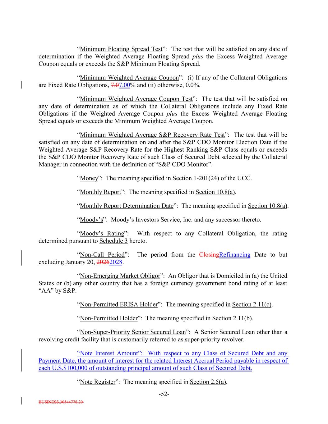 BUSINESS.30544778.20 -52- “Minimum Floating Spread Test”: The test that will be satisfied on any date of determination if the Weighted Average Floating Spread plus the Excess Weighted Average Coupon equals or exceeds the S&P Minimum Floating Spread. “Minimum Weighted Average Coupon”: (i) If any of the Collateral Obligations are Fixed Rate Obligations, 7.07.00% and (ii) otherwise, 0.0%. “Minimum Weighted Average Coupon Test”: The test that will be satisfied on any date of determination as of which the Collateral Obligations include any Fixed Rate Obligations if the Weighted Average Coupon plus the Excess Weighted Average Floating Spread equals or exceeds the Minimum Weighted Average Coupon. “Minimum Weighted Average S&P Recovery Rate Test”: The test that will be satisfied on any date of determination on and after the S&P CDO Monitor Election Date if the Weighted Average S&P Recovery Rate for the Highest Ranking S&P Class equals or exceeds the S&P CDO Monitor Recovery Rate of such Class of Secured Debt selected by the Collateral Manager in connection with the definition of “S&P CDO Monitor”. “Money”: The meaning specified in Section 1-201(24) of the UCC. “Monthly Report”: The meaning specified in Section 10.8(a). “Monthly Report Determination Date”: The meaning specified in Section 10.8(a). “Moody’s”: Moody’s Investors Service, Inc. and any successor thereto. “Moody’s Rating”: With respect to any Collateral Obligation, the rating determined pursuant to Schedule 3 hereto. “Non-Call Period”: The period from the ClosingRefinancing Date to but excluding January 20, 20262028. “Non-Emerging Market Obligor”: An Obligor that is Domiciled in (a) the United States or (b) any other country that has a foreign currency government bond rating of at least “AA” by S&P. “Non-Permitted ERISA Holder”: The meaning specified in Section 2.11(c). “Non-Permitted Holder”: The meaning specified in Section 2.11(b). “Non-Super-Priority Senior Secured Loan”: A Senior Secured Loan other than a revolving credit facility that is customarily referred to as super-priority revolver. “Note Interest Amount”: With respect to any Class of Secured Debt and any Payment Date, the amount of interest for the related Interest Accrual Period payable in respect of each U.S.$100,000 of outstanding principal amount of such Class of Secured Debt. “Note Register”: The meaning specified in Section 2.5(a).