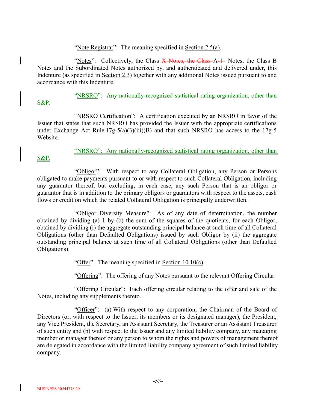 BUSINESS.30544778.20 -53- “Note Registrar”: The meaning specified in Section 2.5(a). “Notes”: Collectively, the Class X Notes, the Class A-1 Notes, the Class B Notes and the Subordinated Notes authorized by, and authenticated and delivered under, this Indenture (as specified in Section 2.3) together with any additional Notes issued pursuant to and accordance with this Indenture. “NRSRO”: Any nationally-recognized statistical rating organization, other than S&P. “NRSRO Certification”: A certification executed by an NRSRO in favor of the Issuer that states that such NRSRO has provided the Issuer with the appropriate certifications under Exchange Act Rule 17g-5(a)(3)(iii)(B) and that such NRSRO has access to the 17g-5 Website. “NRSRO”: Any nationally-recognized statistical rating organization, other than S&P. “Obligor”: With respect to any Collateral Obligation, any Person or Persons obligated to make payments pursuant to or with respect to such Collateral Obligation, including any guarantor thereof, but excluding, in each case, any such Person that is an obligor or guarantor that is in addition to the primary obligors or guarantors with respect to the assets, cash flows or credit on which the related Collateral Obligation is principally underwritten. “Obligor Diversity Measure”: As of any date of determination, the number obtained by dividing (a) 1 by (b) the sum of the squares of the quotients, for each Obligor, obtained by dividing (i) the aggregate outstanding principal balance at such time of all Collateral Obligations (other than Defaulted Obligations) issued by such Obligor by (ii) the aggregate outstanding principal balance at such time of all Collateral Obligations (other than Defaulted Obligations). “Offer”: The meaning specified in Section 10.10(c). “Offering”: The offering of any Notes pursuant to the relevant Offering Circular. “Offering Circular”: Each offering circular relating to the offer and sale of the Notes, including any supplements thereto. “Officer”: (a) With respect to any corporation, the Chairman of the Board of Directors (or, with respect to the Issuer, its members or its designated manager), the President, any Vice President, the Secretary, an Assistant Secretary, the Treasurer or an Assistant Treasurer of such entity and (b) with respect to the Issuer and any limited liability company, any managing member or manager thereof or any person to whom the rights and powers of management thereof are delegated in accordance with the limited liability company agreement of such limited liability company.