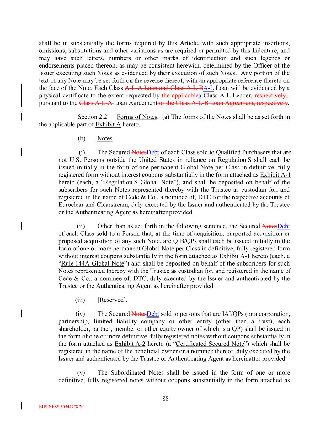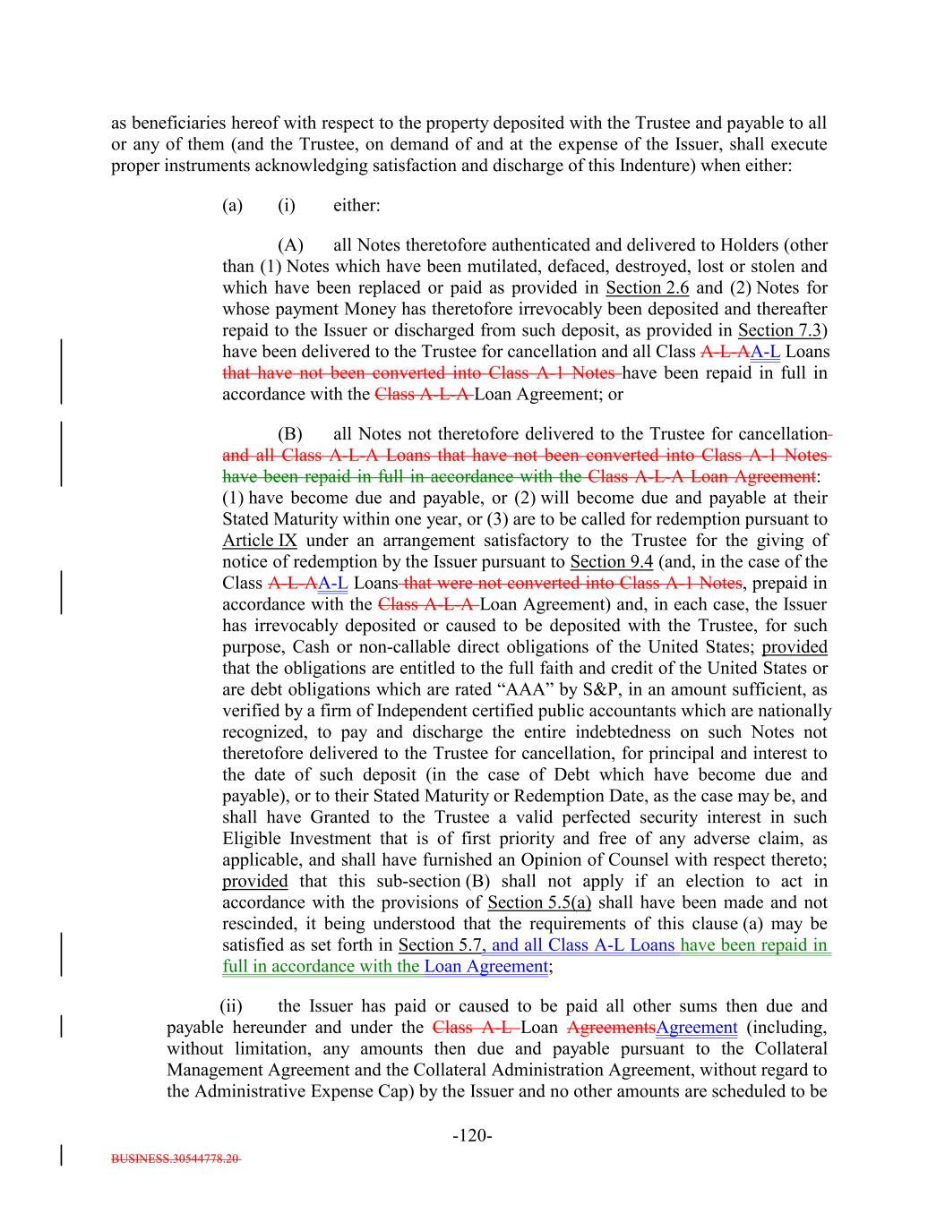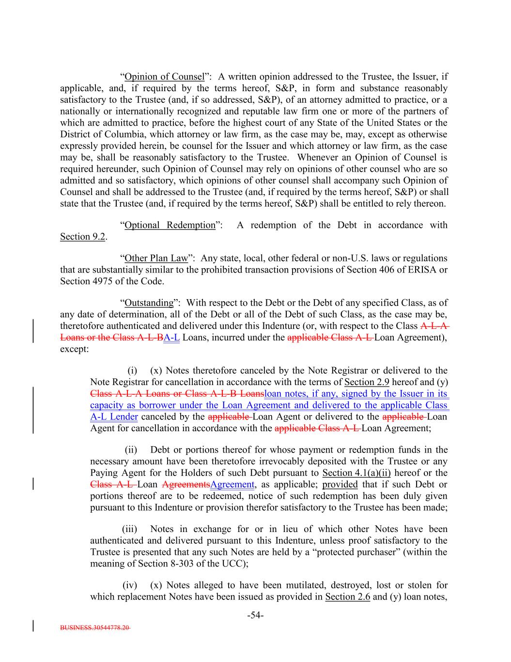 BUSINESS.30544778.20 -54- “Opinion of Counsel”: A written opinion addressed to the Trustee, the Issuer, if applicable, and, if required by the terms hereof, S&P, in form and substance reasonably satisfactory to the Trustee (and, if so addressed, S&P), of an attorney admitted to practice, or a nationally or internationally recognized and reputable law firm one or more of the partners of which are admitted to practice, before the highest court of any State of the United States or the District of Columbia, which attorney or law firm, as the case may be, may, except as otherwise expressly provided herein, be counsel for the Issuer and which attorney or law firm, as the case may be, shall be reasonably satisfactory to the Trustee. Whenever an Opinion of Counsel is required hereunder, such Opinion of Counsel may rely on opinions of other counsel who are so admitted and so satisfactory, which opinions of other counsel shall accompany such Opinion of Counsel and shall be addressed to the Trustee (and, if required by the terms hereof, S&P) or shall state that the Trustee (and, if required by the terms hereof, S&P) shall be entitled to rely thereon. “Optional Redemption”: A redemption of the Debt in accordance with Section 9.2. “Other Plan Law”: Any state, local, other federal or non-U.S. laws or regulations that are substantially similar to the prohibited transaction provisions of Section 406 of ERISA or Section 4975 of the Code. “Outstanding”: With respect to the Debt or the Debt of any specified Class, as of any date of determination, all of the Debt or all of the Debt of such Class, as the case may be, theretofore authenticated and delivered under this Indenture (or, with respect to the Class A-L-A Loans or the Class A-L-BA-L Loans, incurred under the applicable Class A-L Loan Agreement), except: (i) (x) Notes theretofore canceled by the Note Registrar or delivered to the Note Registrar for cancellation in accordance with the terms of Section 2.9 hereof and (y) Class A-L-A Loans or Class A-L-B Loansloan notes, if any, signed by the Issuer in its capacity as borrower under the Loan Agreement and delivered to the applicable Class A-L Lender canceled by the applicable Loan Agent or delivered to the applicable Loan Agent for cancellation in accordance with the applicable Class A-L Loan Agreement; (ii) Debt or portions thereof for whose payment or redemption funds in the necessary amount have been theretofore irrevocably deposited with the Trustee or any Paying Agent for the Holders of such Debt pursuant to Section 4.1(a)(ii) hereof or the Class A-L Loan AgreementsAgreement, as applicable; provided that if such Debt or portions thereof are to be redeemed, notice of such redemption has been duly given pursuant to this Indenture or provision therefor satisfactory to the Trustee has been made; (iii) Notes in exchange for or in lieu of which other Notes have been authenticated and delivered pursuant to this Indenture, unless proof satisfactory to the Trustee is presented that any such Notes are held by a “protected purchaser” (within the meaning of Section 8-303 of the UCC); (iv) (x) Notes alleged to have been mutilated, destroyed, lost or stolen for which replacement Notes have been issued as provided in Section 2.6 and (y) loan notes,