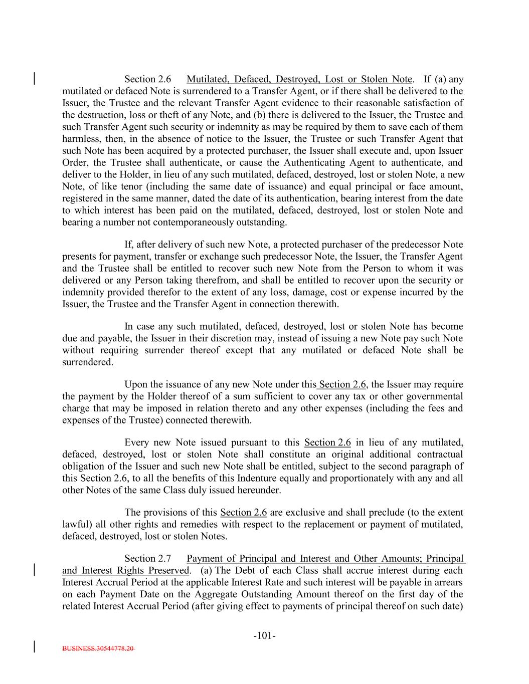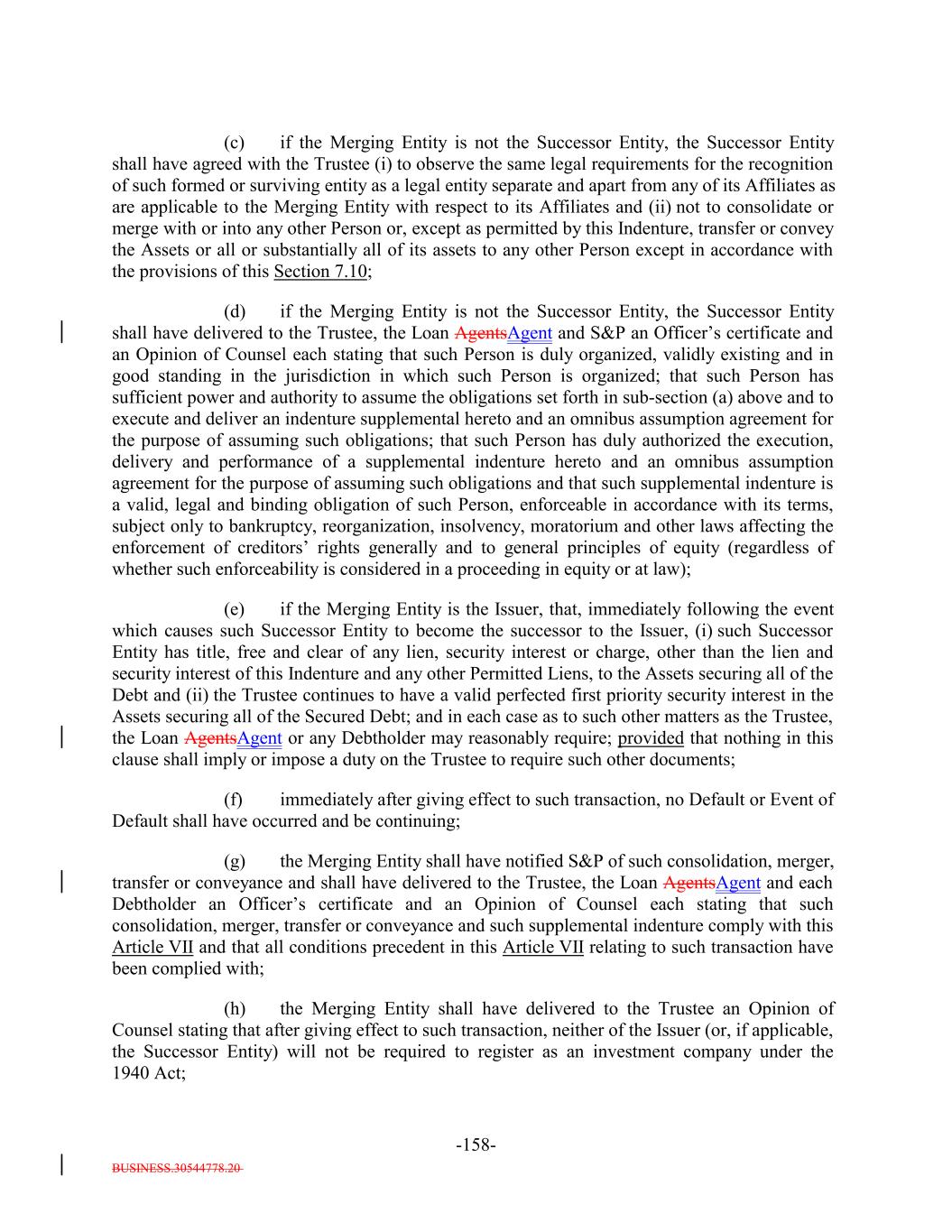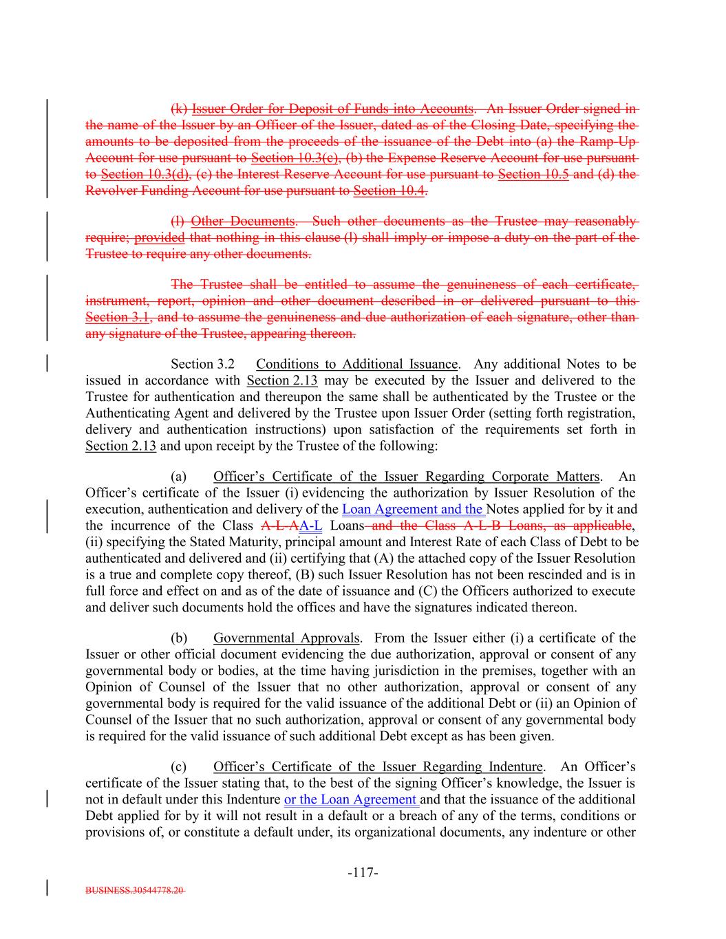 BUSINESS.30544778.20 -54- “Opinion of Counsel”: A written opinion addressed to the Trustee, the Issuer, if applicable, and, if required by the terms hereof, S&P, in form and substance reasonably satisfactory to the Trustee (and, if so addressed, S&P), of an attorney admitted to practice, or a nationally or internationally recognized and reputable law firm one or more of the partners of which are admitted to practice, before the highest court of any State of the United States or the District of Columbia, which attorney or law firm, as the case may be, may, except as otherwise expressly provided herein, be counsel for the Issuer and which attorney or law firm, as the case may be, shall be reasonably satisfactory to the Trustee. Whenever an Opinion of Counsel is required hereunder, such Opinion of Counsel may rely on opinions of other counsel who are so admitted and so satisfactory, which opinions of other counsel shall accompany such Opinion of Counsel and shall be addressed to the Trustee (and, if required by the terms hereof, S&P) or shall state that the Trustee (and, if required by the terms hereof, S&P) shall be entitled to rely thereon. “Optional Redemption”: A redemption of the Debt in accordance with Section 9.2. “Other Plan Law”: Any state, local, other federal or non-U.S. laws or regulations that are substantially similar to the prohibited transaction provisions of Section 406 of ERISA or Section 4975 of the Code. “Outstanding”: With respect to the Debt or the Debt of any specified Class, as of any date of determination, all of the Debt or all of the Debt of such Class, as the case may be, theretofore authenticated and delivered under this Indenture (or, with respect to the Class A-L-A Loans or the Class A-L-BA-L Loans, incurred under the applicable Class A-L Loan Agreement), except: (i) (x) Notes theretofore canceled by the Note Registrar or delivered to the Note Registrar for cancellation in accordance with the terms of Section 2.9 hereof and (y) Class A-L-A Loans or Class A-L-B Loansloan notes, if any, signed by the Issuer in its capacity as borrower under the Loan Agreement and delivered to the applicable Class A-L Lender canceled by the applicable Loan Agent or delivered to the applicable Loan Agent for cancellation in accordance with the applicable Class A-L Loan Agreement; (ii) Debt or portions thereof for whose payment or redemption funds in the necessary amount have been theretofore irrevocably deposited with the Trustee or any Paying Agent for the Holders of such Debt pursuant to Section 4.1(a)(ii) hereof or the Class A-L Loan AgreementsAgreement, as applicable; provided that if such Debt or portions thereof are to be redeemed, notice of such redemption has been duly given pursuant to this Indenture or provision therefor satisfactory to the Trustee has been made; (iii) Notes in exchange for or in lieu of which other Notes have been authenticated and delivered pursuant to this Indenture, unless proof satisfactory to the Trustee is presented that any such Notes are held by a “protected purchaser” (within the meaning of Section 8-303 of the UCC); (iv) (x) Notes alleged to have been mutilated, destroyed, lost or stolen for which replacement Notes have been issued as provided in Section 2.6 and (y) loan notes,