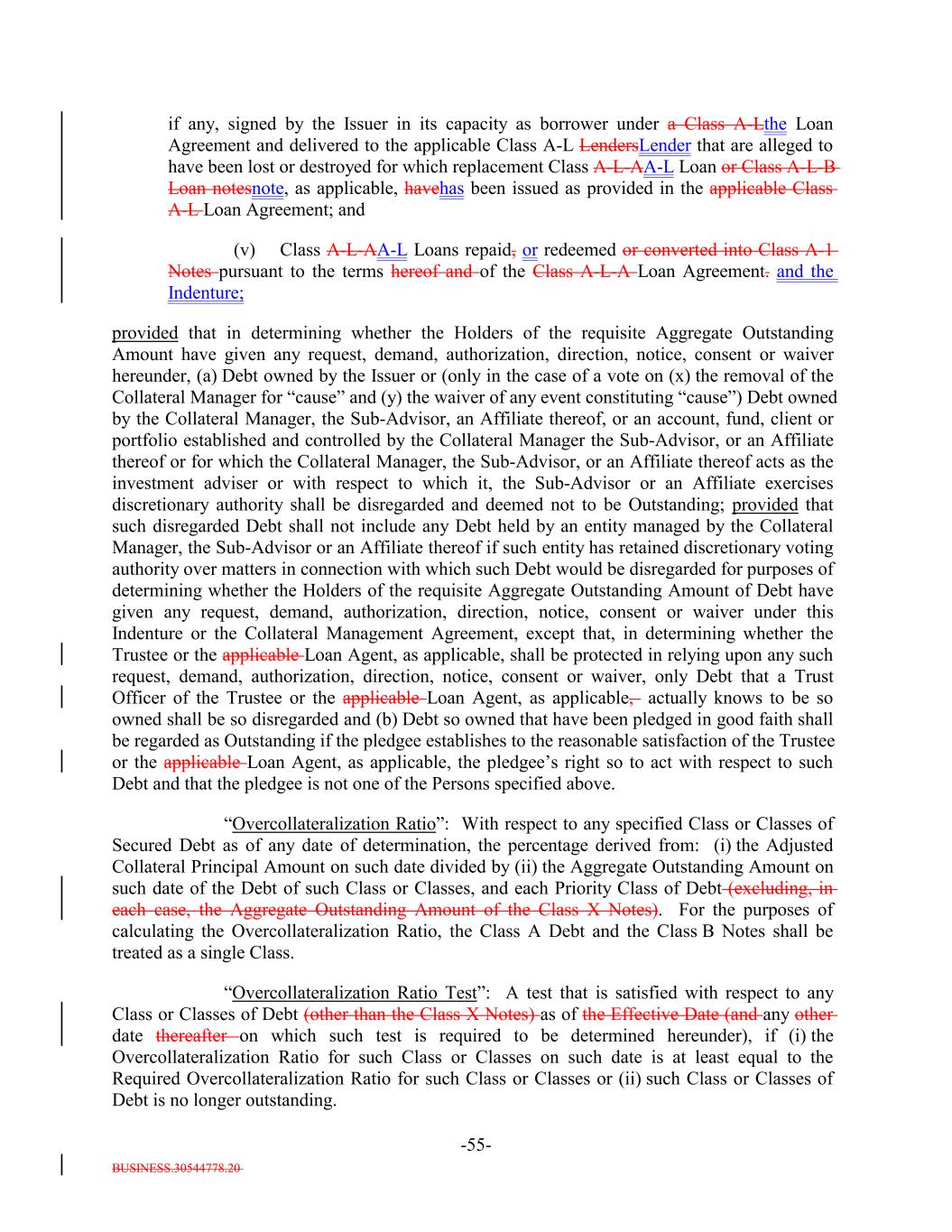 BUSINESS.30544778.20 -55- if any, signed by the Issuer in its capacity as borrower under a Class A-Lthe Loan Agreement and delivered to the applicable Class A-L LendersLender that are alleged to have been lost or destroyed for which replacement Class A-L-AA-L Loan or Class A-L-B Loan notesnote, as applicable, havehas been issued as provided in the applicable Class A-L Loan Agreement; and (v) Class A-L-AA-L Loans repaid, or redeemed or converted into Class A-1 Notes pursuant to the terms hereof and of the Class A-L-A Loan Agreement. and the Indenture; provided that in determining whether the Holders of the requisite Aggregate Outstanding Amount have given any request, demand, authorization, direction, notice, consent or waiver hereunder, (a) Debt owned by the Issuer or (only in the case of a vote on (x) the removal of the Collateral Manager for “cause” and (y) the waiver of any event constituting “cause”) Debt owned by the Collateral Manager, the Sub-Advisor, an Affiliate thereof, or an account, fund, client or portfolio established and controlled by the Collateral Manager the Sub-Advisor, or an Affiliate thereof or for which the Collateral Manager, the Sub-Advisor, or an Affiliate thereof acts as the investment adviser or with respect to which it, the Sub-Advisor or an Affiliate exercises discretionary authority shall be disregarded and deemed not to be Outstanding; provided that such disregarded Debt shall not include any Debt held by an entity managed by the Collateral Manager, the Sub-Advisor or an Affiliate thereof if such entity has retained discretionary voting authority over matters in connection with which such Debt would be disregarded for purposes of determining whether the Holders of the requisite Aggregate Outstanding Amount of Debt have given any request, demand, authorization, direction, notice, consent or waiver under this Indenture or the Collateral Management Agreement, except that, in determining whether the Trustee or the applicable Loan Agent, as applicable, shall be protected in relying upon any such request, demand, authorization, direction, notice, consent or waiver, only Debt that a Trust Officer of the Trustee or the applicable Loan Agent, as applicable, actually knows to be so owned shall be so disregarded and (b) Debt so owned that have been pledged in good faith shall be regarded as Outstanding if the pledgee establishes to the reasonable satisfaction of the Trustee or the applicable Loan Agent, as applicable, the pledgee’s right so to act with respect to such Debt and that the pledgee is not one of the Persons specified above. “Overcollateralization Ratio”: With respect to any specified Class or Classes of Secured Debt as of any date of determination, the percentage derived from: (i) the Adjusted Collateral Principal Amount on such date divided by (ii) the Aggregate Outstanding Amount on such date of the Debt of such Class or Classes, and each Priority Class of Debt (excluding, in each case, the Aggregate Outstanding Amount of the Class X Notes). For the purposes of calculating the Overcollateralization Ratio, the Class A Debt and the Class B Notes shall be treated as a single Class. “Overcollateralization Ratio Test”: A test that is satisfied with respect to any Class or Classes of Debt (other than the Class X Notes) as of the Effective Date (and any other date thereafter on which such test is required to be determined hereunder), if (i) the Overcollateralization Ratio for such Class or Classes on such date is at least equal to the Required Overcollateralization Ratio for such Class or Classes or (ii) such Class or Classes of Debt is no longer outstanding.