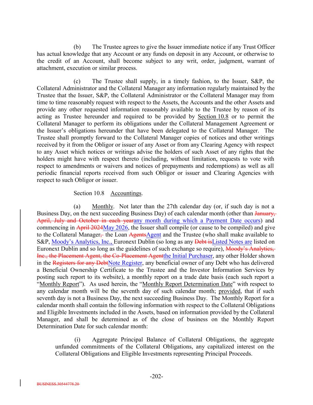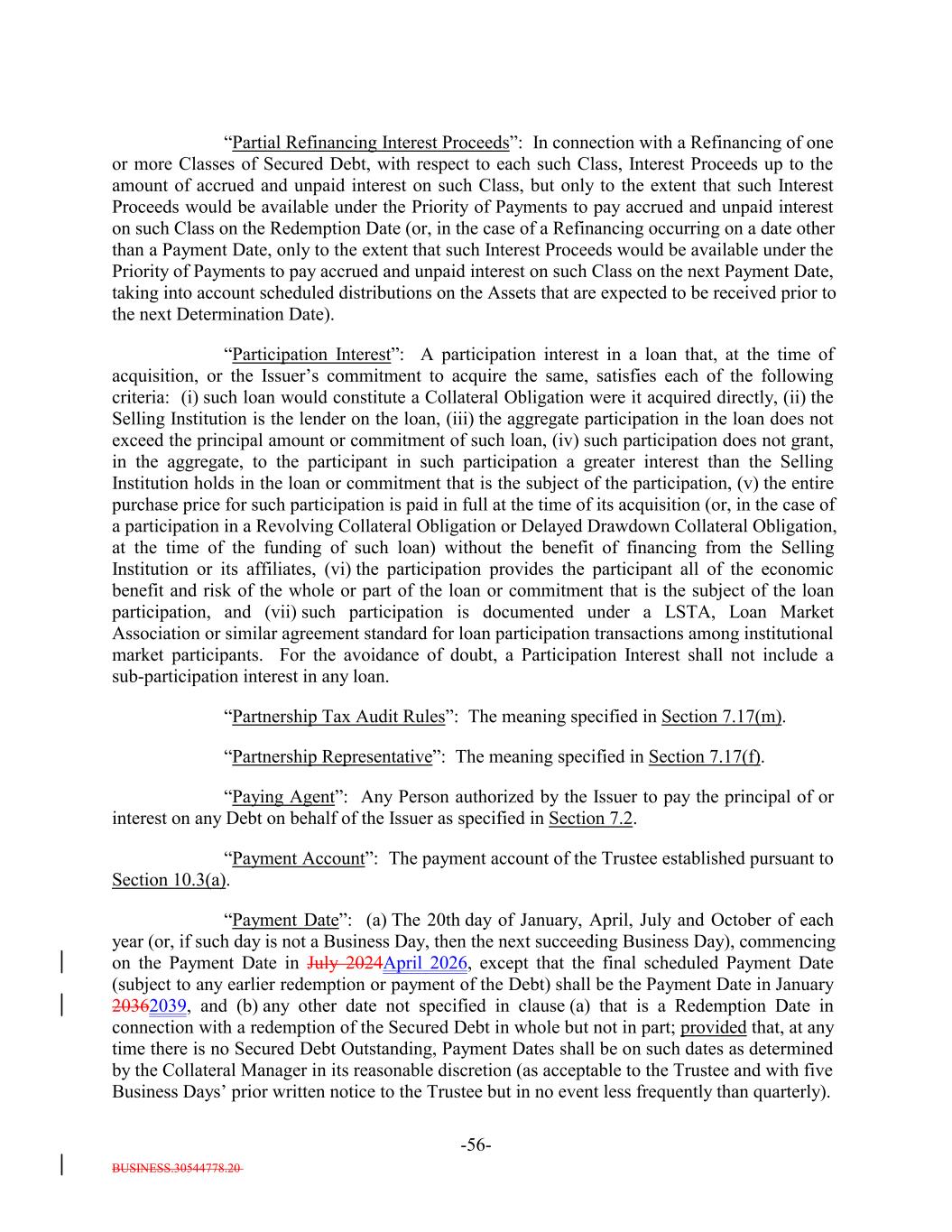 BUSINESS.30544778.20 -56- “Partial Refinancing Interest Proceeds”: In connection with a Refinancing of one or more Classes of Secured Debt, with respect to each such Class, Interest Proceeds up to the amount of accrued and unpaid interest on such Class, but only to the extent that such Interest Proceeds would be available under the Priority of Payments to pay accrued and unpaid interest on such Class on the Redemption Date (or, in the case of a Refinancing occurring on a date other than a Payment Date, only to the extent that such Interest Proceeds would be available under the Priority of Payments to pay accrued and unpaid interest on such Class on the next Payment Date, taking into account scheduled distributions on the Assets that are expected to be received prior to the next Determination Date). “Participation Interest”: A participation interest in a loan that, at the time of acquisition, or the Issuer’s commitment to acquire the same, satisfies each of the following criteria: (i) such loan would constitute a Collateral Obligation were it acquired directly, (ii) the Selling Institution is the lender on the loan, (iii) the aggregate participation in the loan does not exceed the principal amount or commitment of such loan, (iv) such participation does not grant, in the aggregate, to the participant in such participation a greater interest than the Selling Institution holds in the loan or commitment that is the subject of the participation, (v) the entire purchase price for such participation is paid in full at the time of its acquisition (or, in the case of a participation in a Revolving Collateral Obligation or Delayed Drawdown Collateral Obligation, at the time of the funding of such loan) without the benefit of financing from the Selling Institution or its affiliates, (vi) the participation provides the participant all of the economic benefit and risk of the whole or part of the loan or commitment that is the subject of the loan participation, and (vii) such participation is documented under a LSTA, Loan Market Association or similar agreement standard for loan participation transactions among institutional market participants. For the avoidance of doubt, a Participation Interest shall not include a sub-participation interest in any loan. “Partnership Tax Audit Rules”: The meaning specified in Section 7.17(m). “Partnership Representative”: The meaning specified in Section 7.17(f). “Paying Agent”: Any Person authorized by the Issuer to pay the principal of or interest on any Debt on behalf of the Issuer as specified in Section 7.2. “Payment Account”: The payment account of the Trustee established pursuant to Section 10.3(a). “Payment Date”: (a) The 20th day of January, April, July and October of each year (or, if such day is not a Business Day, then the next succeeding Business Day), commencing on the Payment Date in July 2024April 2026, except that the final scheduled Payment Date (subject to any earlier redemption or payment of the Debt) shall be the Payment Date in January 20362039, and (b) any other date not specified in clause (a) that is a Redemption Date in connection with a redemption of the Secured Debt in whole but not in part; provided that, at any time there is no Secured Debt Outstanding, Payment Dates shall be on such dates as determined by the Collateral Manager in its reasonable discretion (as acceptable to the Trustee and with five Business Days’ prior written notice to the Trustee but in no event less frequently than quarterly).