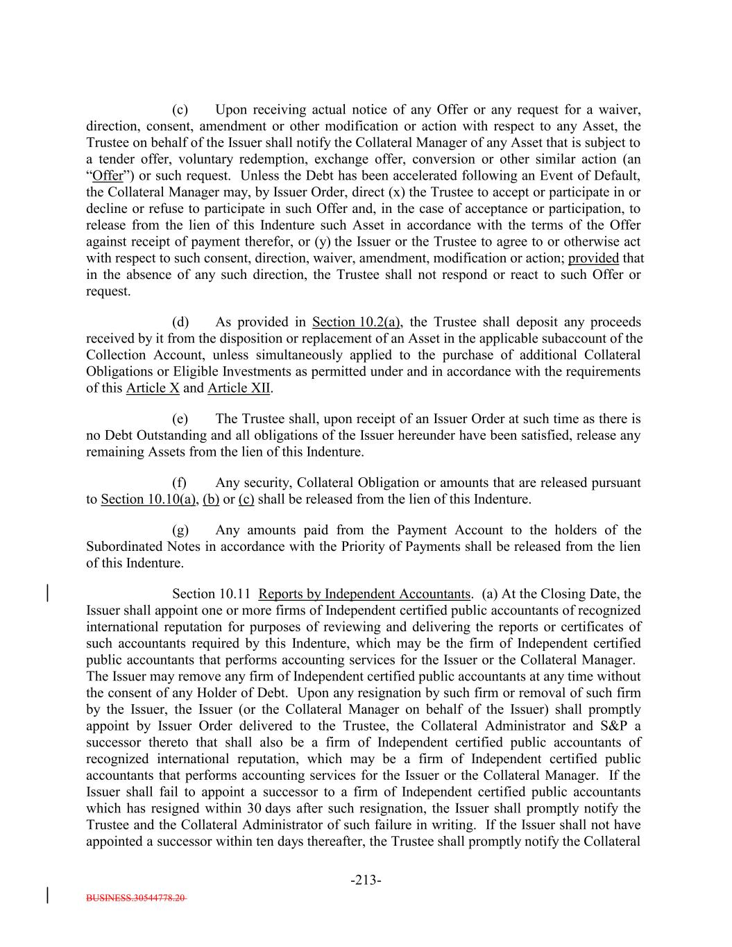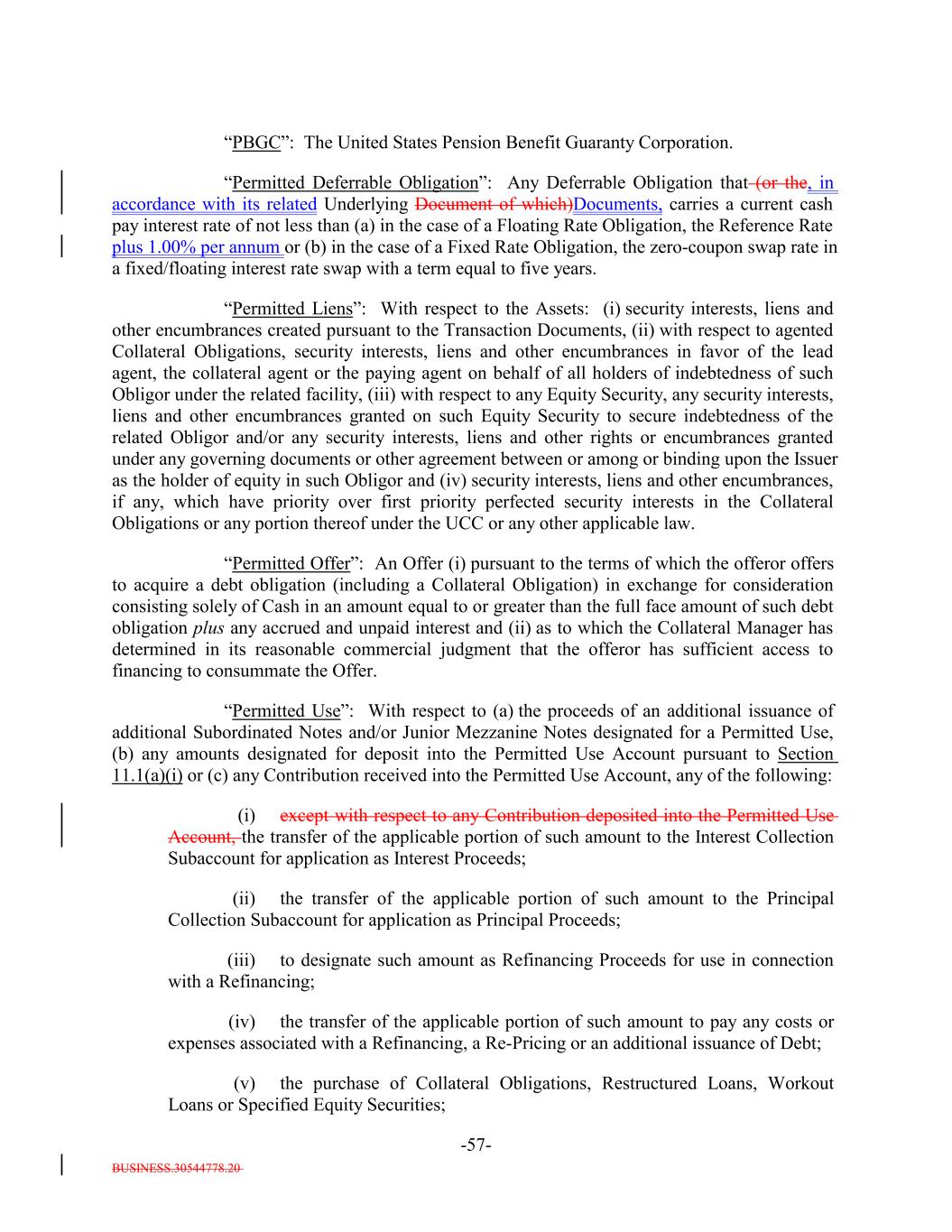 BUSINESS.30544778.20 -57- “PBGC”: The United States Pension Benefit Guaranty Corporation. “Permitted Deferrable Obligation”: Any Deferrable Obligation that (or the, in accordance with its related Underlying Document of which)Documents, carries a current cash pay interest rate of not less than (a) in the case of a Floating Rate Obligation, the Reference Rate plus 1.00% per annum or (b) in the case of a Fixed Rate Obligation, the zero-coupon swap rate in a fixed/floating interest rate swap with a term equal to five years. “Permitted Liens”: With respect to the Assets: (i) security interests, liens and other encumbrances created pursuant to the Transaction Documents, (ii) with respect to agented Collateral Obligations, security interests, liens and other encumbrances in favor of the lead agent, the collateral agent or the paying agent on behalf of all holders of indebtedness of such Obligor under the related facility, (iii) with respect to any Equity Security, any security interests, liens and other encumbrances granted on such Equity Security to secure indebtedness of the related Obligor and/or any security interests, liens and other rights or encumbrances granted under any governing documents or other agreement between or among or binding upon the Issuer as the holder of equity in such Obligor and (iv) security interests, liens and other encumbrances, if any, which have priority over first priority perfected security interests in the Collateral Obligations or any portion thereof under the UCC or any other applicable law. “Permitted Offer”: An Offer (i) pursuant to the terms of which the offeror offers to acquire a debt obligation (including a Collateral Obligation) in exchange for consideration consisting solely of Cash in an amount equal to or greater than the full face amount of such debt obligation plus any accrued and unpaid interest and (ii) as to which the Collateral Manager has determined in its reasonable commercial judgment that the offeror has sufficient access to financing to consummate the Offer. “Permitted Use”: With respect to (a) the proceeds of an additional issuance of additional Subordinated Notes and/or Junior Mezzanine Notes designated for a Permitted Use, (b) any amounts designated for deposit into the Permitted Use Account pursuant to Section 11.1(a)(i) or (c) any Contribution received into the Permitted Use Account, any of the following: (i) except with respect to any Contribution deposited into the Permitted Use Account, the transfer of the applicable portion of such amount to the Interest Collection Subaccount for application as Interest Proceeds; (ii) the transfer of the applicable portion of such amount to the Principal Collection Subaccount for application as Principal Proceeds; (iii) to designate such amount as Refinancing Proceeds for use in connection with a Refinancing; (iv) the transfer of the applicable portion of such amount to pay any costs or expenses associated with a Refinancing, a Re-Pricing or an additional issuance of Debt; (v) the purchase of Collateral Obligations, Restructured Loans, Workout Loans or Specified Equity Securities;