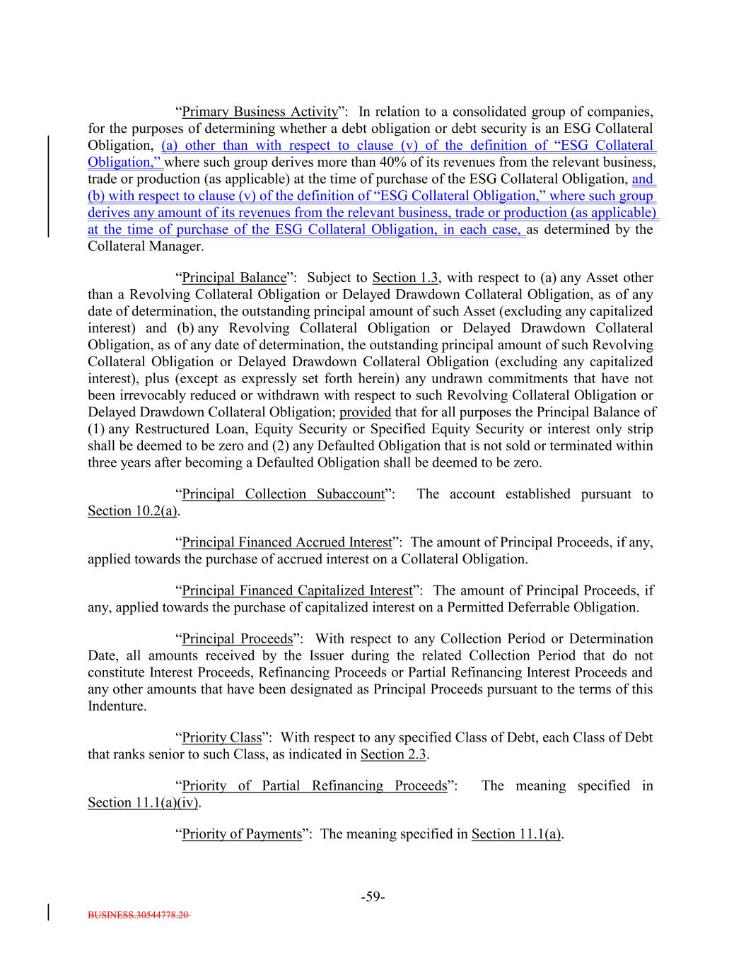 BUSINESS.30544778.20 -59- “Primary Business Activity”: In relation to a consolidated group of companies, for the purposes of determining whether a debt obligation or debt security is an ESG Collateral Obligation, (a) other than with respect to clause (v) of the definition of “ESG Collateral Obligation,” where such group derives more than 40% of its revenues from the relevant business, trade or production (as applicable) at the time of purchase of the ESG Collateral Obligation, and (b) with respect to clause (v) of the definition of “ESG Collateral Obligation,” where such group derives any amount of its revenues from the relevant business, trade or production (as applicable) at the time of purchase of the ESG Collateral Obligation, in each case, as determined by the Collateral Manager. “Principal Balance”: Subject to Section 1.3, with respect to (a) any Asset other than a Revolving Collateral Obligation or Delayed Drawdown Collateral Obligation, as of any date of determination, the outstanding principal amount of such Asset (excluding any capitalized interest) and (b) any Revolving Collateral Obligation or Delayed Drawdown Collateral Obligation, as of any date of determination, the outstanding principal amount of such Revolving Collateral Obligation or Delayed Drawdown Collateral Obligation (excluding any capitalized interest), plus (except as expressly set forth herein) any undrawn commitments that have not been irrevocably reduced or withdrawn with respect to such Revolving Collateral Obligation or Delayed Drawdown Collateral Obligation; provided that for all purposes the Principal Balance of (1) any Restructured Loan, Equity Security or Specified Equity Security or interest only strip shall be deemed to be zero and (2) any Defaulted Obligation that is not sold or terminated within three years after becoming a Defaulted Obligation shall be deemed to be zero. “Principal Collection Subaccount”: The account established pursuant to Section 10.2(a). “Principal Financed Accrued Interest”: The amount of Principal Proceeds, if any, applied towards the purchase of accrued interest on a Collateral Obligation. “Principal Financed Capitalized Interest”: The amount of Principal Proceeds, if any, applied towards the purchase of capitalized interest on a Permitted Deferrable Obligation. “Principal Proceeds”: With respect to any Collection Period or Determination Date, all amounts received by the Issuer during the related Collection Period that do not constitute Interest Proceeds, Refinancing Proceeds or Partial Refinancing Interest Proceeds and any other amounts that have been designated as Principal Proceeds pursuant to the terms of this Indenture. “Priority Class”: With respect to any specified Class of Debt, each Class of Debt that ranks senior to such Class, as indicated in Section 2.3. “Priority of Partial Refinancing Proceeds”: The meaning specified in Section 11.1(a)(iv). “Priority of Payments”: The meaning specified in Section 11.1(a).