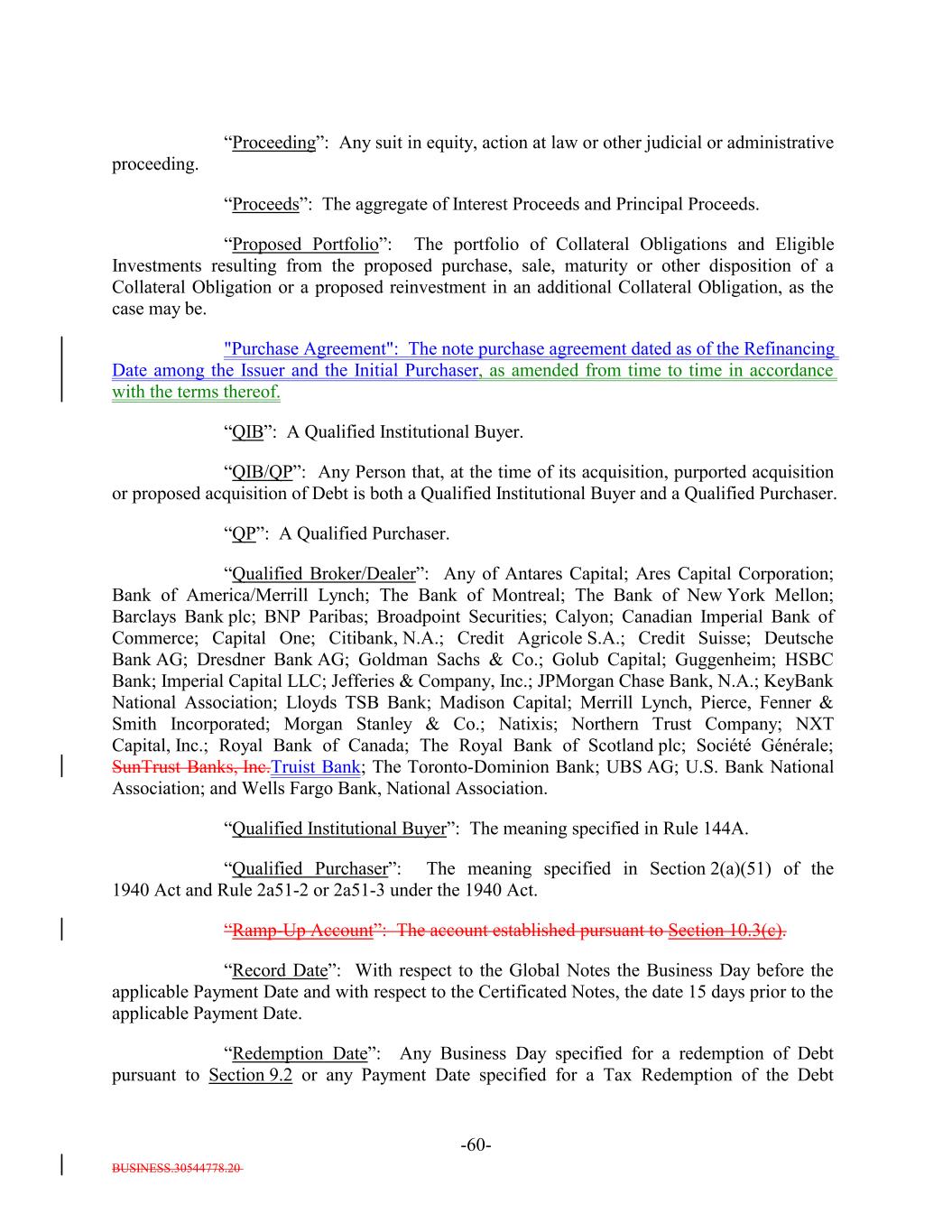 BUSINESS.30544778.20 -60- “Proceeding”: Any suit in equity, action at law or other judicial or administrative proceeding. “Proceeds”: The aggregate of Interest Proceeds and Principal Proceeds. “Proposed Portfolio”: The portfolio of Collateral Obligations and Eligible Investments resulting from the proposed purchase, sale, maturity or other disposition of a Collateral Obligation or a proposed reinvestment in an additional Collateral Obligation, as the case may be. "Purchase Agreement": The note purchase agreement dated as of the Refinancing Date among the Issuer and the Initial Purchaser, as amended from time to time in accordance with the terms thereof. “QIB”: A Qualified Institutional Buyer. “QIB/QP”: Any Person that, at the time of its acquisition, purported acquisition or proposed acquisition of Debt is both a Qualified Institutional Buyer and a Qualified Purchaser. “QP”: A Qualified Purchaser. “Qualified Broker/Dealer”: Any of Antares Capital; Ares Capital Corporation; Bank of America/Merrill Lynch; The Bank of Montreal; The Bank of New York Mellon; Barclays Bank plc; BNP Paribas; Broadpoint Securities; Calyon; Canadian Imperial Bank of Commerce; Capital One; Citibank, N.A.; Credit Agricole S.A.; Credit Suisse; Deutsche Bank AG; Dresdner Bank AG; Goldman Sachs & Co.; Golub Capital; Guggenheim; HSBC Bank; Imperial Capital LLC; Jefferies & Company, Inc.; JPMorgan Chase Bank, N.A.; KeyBank National Association; Lloyds TSB Bank; Madison Capital; Merrill Lynch, Pierce, Fenner & Smith Incorporated; Morgan Stanley & Co.; Natixis; Northern Trust Company; NXT Capital, Inc.; Royal Bank of Canada; The Royal Bank of Scotland plc; Société Générale; SunTrust Banks, Inc.Truist Bank; The Toronto-Dominion Bank; UBS AG; U.S. Bank National Association; and Wells Fargo Bank, National Association. “Qualified Institutional Buyer”: The meaning specified in Rule 144A. “Qualified Purchaser”: The meaning specified in Section 2(a)(51) of the 1940 Act and Rule 2a51-2 or 2a51-3 under the 1940 Act. “Ramp-Up Account”: The account established pursuant to Section 10.3(c). “Record Date”: With respect to the Global Notes the Business Day before the applicable Payment Date and with respect to the Certificated Notes, the date 15 days prior to the applicable Payment Date. “Redemption Date”: Any Business Day specified for a redemption of Debt pursuant to Section 9.2 or any Payment Date specified for a Tax Redemption of the Debt