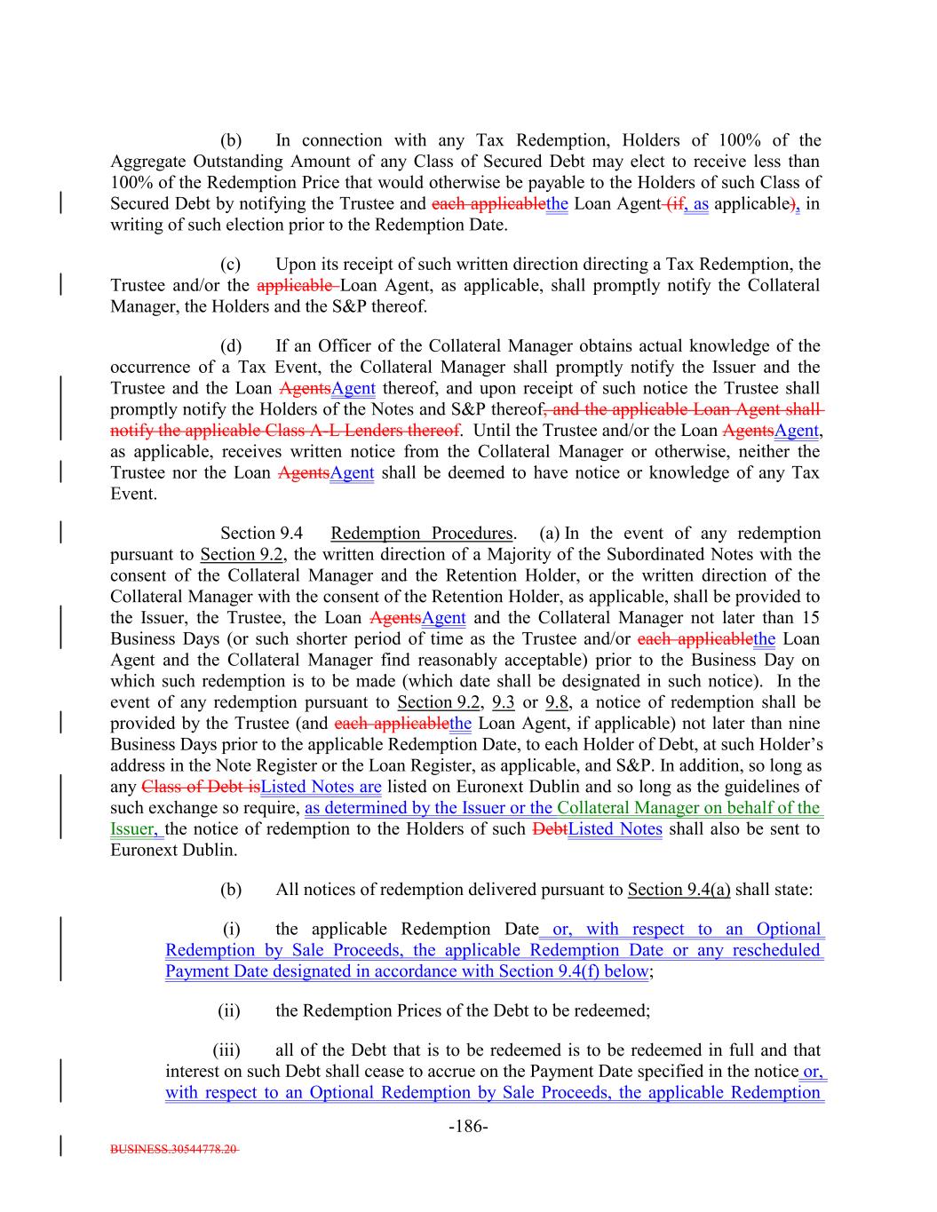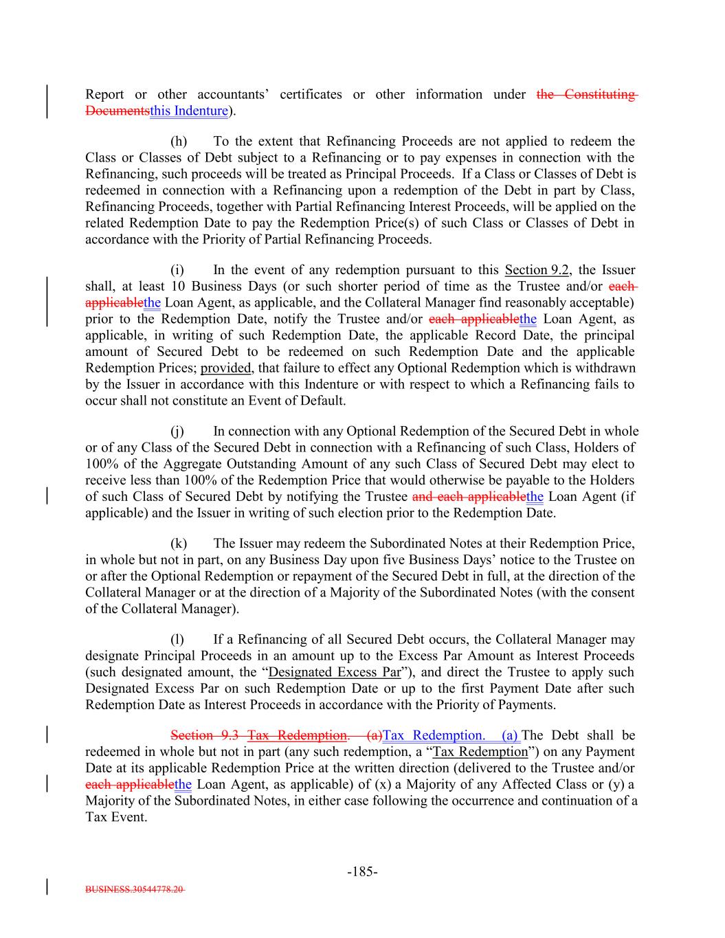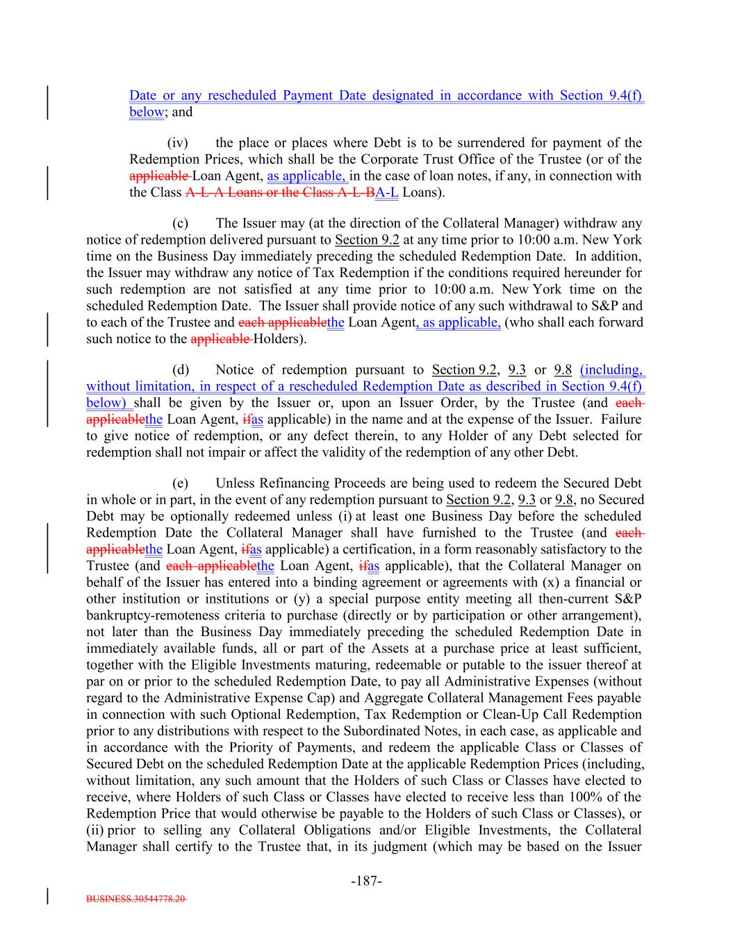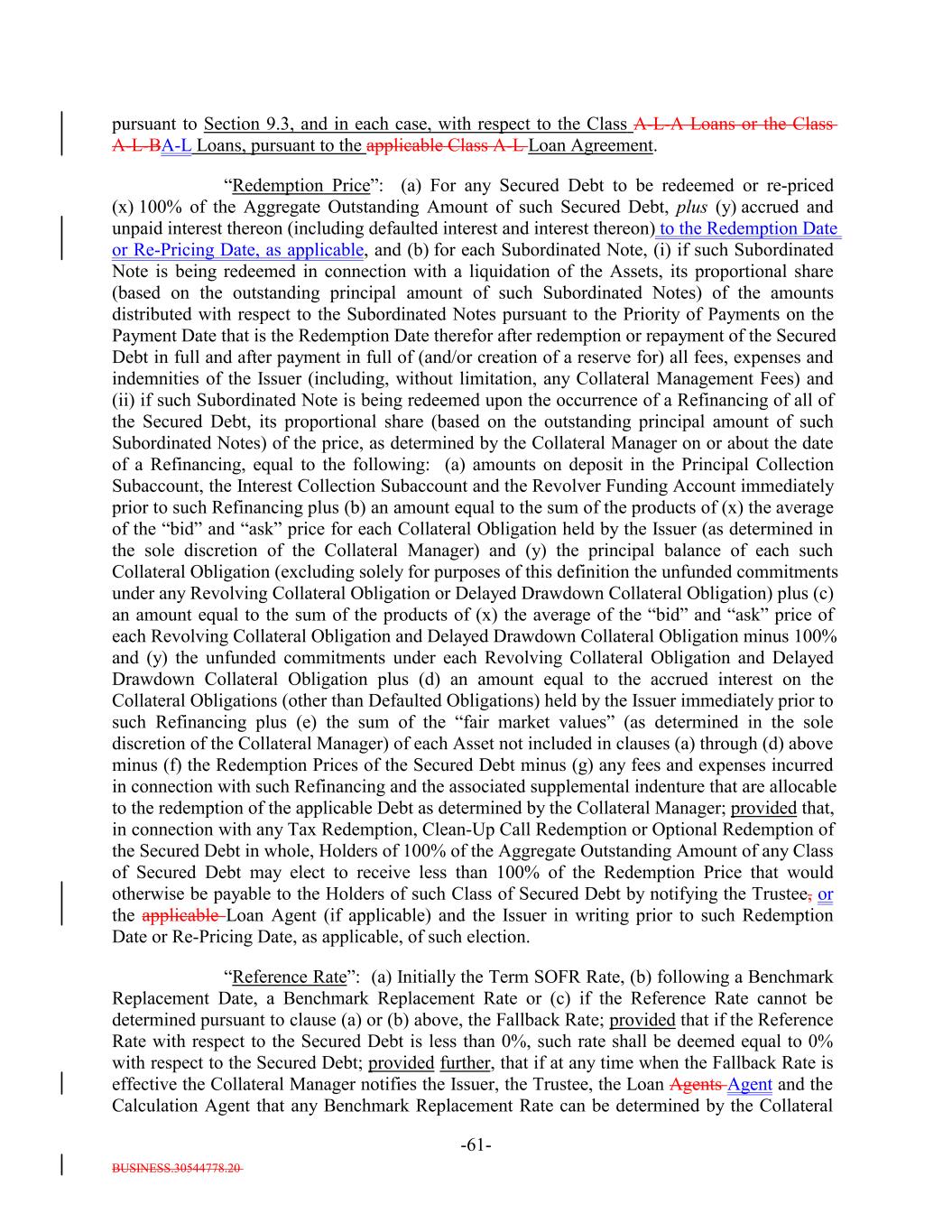 BUSINESS.30544778.20 -61- pursuant to Section 9.3, and in each case, with respect to the Class A-L-A Loans or the Class A-L-BA-L Loans, pursuant to the applicable Class A-L Loan Agreement. “Redemption Price”: (a) For any Secured Debt to be redeemed or re-priced (x) 100% of the Aggregate Outstanding Amount of such Secured Debt, plus (y) accrued and unpaid interest thereon (including defaulted interest and interest thereon) to the Redemption Date or Re-Pricing Date, as applicable, and (b) for each Subordinated Note, (i) if such Subordinated Note is being redeemed in connection with a liquidation of the Assets, its proportional share (based on the outstanding principal amount of such Subordinated Notes) of the amounts distributed with respect to the Subordinated Notes pursuant to the Priority of Payments on the Payment Date that is the Redemption Date therefor after redemption or repayment of the Secured Debt in full and after payment in full of (and/or creation of a reserve for) all fees, expenses and indemnities of the Issuer (including, without limitation, any Collateral Management Fees) and (ii) if such Subordinated Note is being redeemed upon the occurrence of a Refinancing of all of the Secured Debt, its proportional share (based on the outstanding principal amount of such Subordinated Notes) of the price, as determined by the Collateral Manager on or about the date of a Refinancing, equal to the following: (a) amounts on deposit in the Principal Collection Subaccount, the Interest Collection Subaccount and the Revolver Funding Account immediately prior to such Refinancing plus (b) an amount equal to the sum of the products of (x) the average of the “bid” and “ask” price for each Collateral Obligation held by the Issuer (as determined in the sole discretion of the Collateral Manager) and (y) the principal balance of each such Collateral Obligation (excluding solely for purposes of this definition the unfunded commitments under any Revolving Collateral Obligation or Delayed Drawdown Collateral Obligation) plus (c) an amount equal to the sum of the products of (x) the average of the “bid” and “ask” price of each Revolving Collateral Obligation and Delayed Drawdown Collateral Obligation minus 100% and (y) the unfunded commitments under each Revolving Collateral Obligation and Delayed Drawdown Collateral Obligation plus (d) an amount equal to the accrued interest on the Collateral Obligations (other than Defaulted Obligations) held by the Issuer immediately prior to such Refinancing plus (e) the sum of the “fair market values” (as determined in the sole discretion of the Collateral Manager) of each Asset not included in clauses (a) through (d) above minus (f) the Redemption Prices of the Secured Debt minus (g) any fees and expenses incurred in connection with such Refinancing and the associated supplemental indenture that are allocable to the redemption of the applicable Debt as determined by the Collateral Manager; provided that, in connection with any Tax Redemption, Clean-Up Call Redemption or Optional Redemption of the Secured Debt in whole, Holders of 100% of the Aggregate Outstanding Amount of any Class of Secured Debt may elect to receive less than 100% of the Redemption Price that would otherwise be payable to the Holders of such Class of Secured Debt by notifying the Trustee, or the applicable Loan Agent (if applicable) and the Issuer in writing prior to such Redemption Date or Re-Pricing Date, as applicable, of such election. “Reference Rate”: (a) Initially the Term SOFR Rate, (b) following a Benchmark Replacement Date, a Benchmark Replacement Rate or (c) if the Reference Rate cannot be determined pursuant to clause (a) or (b) above, the Fallback Rate; provided that if the Reference Rate with respect to the Secured Debt is less than 0%, such rate shall be deemed equal to 0% with respect to the Secured Debt; provided further, that if at any time when the Fallback Rate is effective the Collateral Manager notifies the Issuer, the Trustee, the Loan Agents Agent and the Calculation Agent that any Benchmark Replacement Rate can be determined by the Collateral