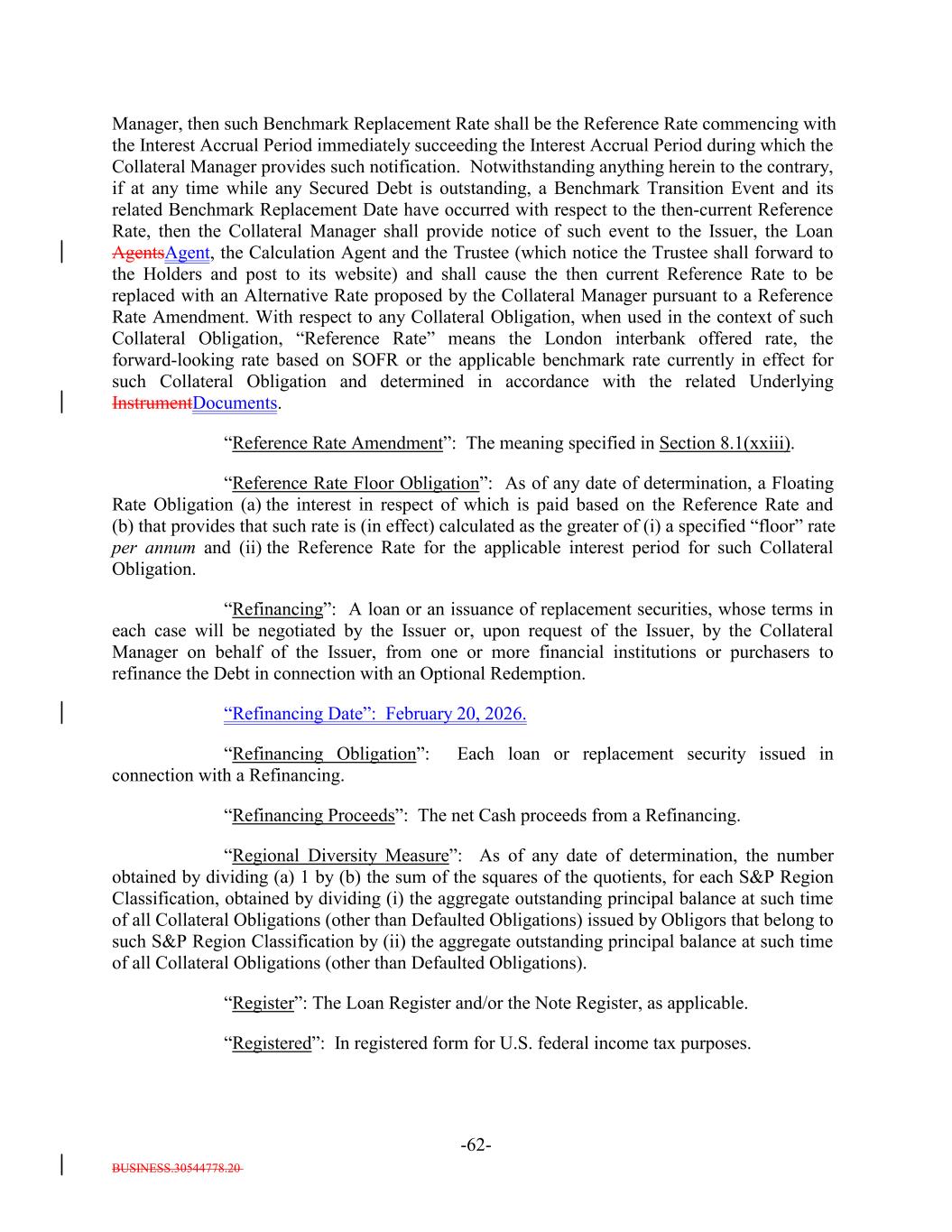 BUSINESS.30544778.20 -62- Manager, then such Benchmark Replacement Rate shall be the Reference Rate commencing with the Interest Accrual Period immediately succeeding the Interest Accrual Period during which the Collateral Manager provides such notification. Notwithstanding anything herein to the contrary, if at any time while any Secured Debt is outstanding, a Benchmark Transition Event and its related Benchmark Replacement Date have occurred with respect to the then-current Reference Rate, then the Collateral Manager shall provide notice of such event to the Issuer, the Loan AgentsAgent, the Calculation Agent and the Trustee (which notice the Trustee shall forward to the Holders and post to its website) and shall cause the then current Reference Rate to be replaced with an Alternative Rate proposed by the Collateral Manager pursuant to a Reference Rate Amendment. With respect to any Collateral Obligation, when used in the context of such Collateral Obligation, “Reference Rate” means the London interbank offered rate, the forward-looking rate based on SOFR or the applicable benchmark rate currently in effect for such Collateral Obligation and determined in accordance with the related Underlying InstrumentDocuments. “Reference Rate Amendment”: The meaning specified in Section 8.1(xxiii). “Reference Rate Floor Obligation”: As of any date of determination, a Floating Rate Obligation (a) the interest in respect of which is paid based on the Reference Rate and (b) that provides that such rate is (in effect) calculated as the greater of (i) a specified “floor” rate per annum and (ii) the Reference Rate for the applicable interest period for such Collateral Obligation. “Refinancing”: A loan or an issuance of replacement securities, whose terms in each case will be negotiated by the Issuer or, upon request of the Issuer, by the Collateral Manager on behalf of the Issuer, from one or more financial institutions or purchasers to refinance the Debt in connection with an Optional Redemption. “Refinancing Date”: February 20, 2026. “Refinancing Obligation”: Each loan or replacement security issued in connection with a Refinancing. “Refinancing Proceeds”: The net Cash proceeds from a Refinancing. “Regional Diversity Measure”: As of any date of determination, the number obtained by dividing (a) 1 by (b) the sum of the squares of the quotients, for each S&P Region Classification, obtained by dividing (i) the aggregate outstanding principal balance at such time of all Collateral Obligations (other than Defaulted Obligations) issued by Obligors that belong to such S&P Region Classification by (ii) the aggregate outstanding principal balance at such time of all Collateral Obligations (other than Defaulted Obligations). “Register”: The Loan Register and/or the Note Register, as applicable. “Registered”: In registered form for U.S. federal income tax purposes.