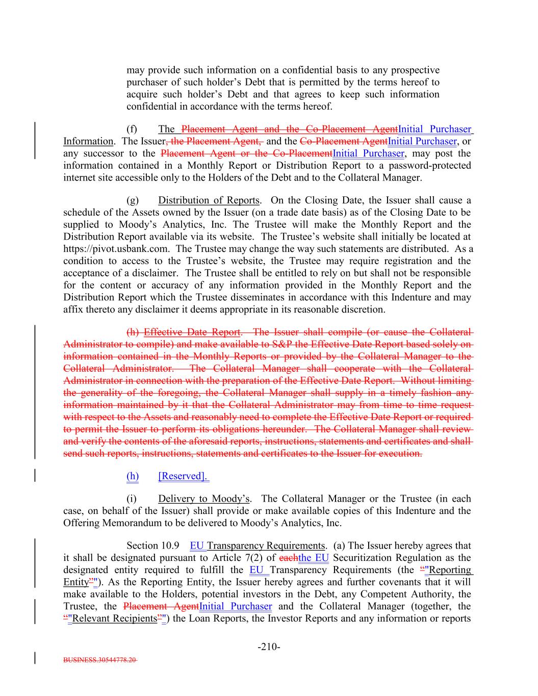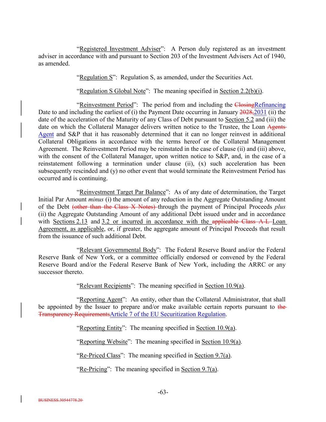 BUSINESS.30544778.20 -63- “Registered Investment Adviser”: A Person duly registered as an investment adviser in accordance with and pursuant to Section 203 of the Investment Advisers Act of 1940, as amended. “Regulation S”: Regulation S, as amended, under the Securities Act. “Regulation S Global Note”: The meaning specified in Section 2.2(b)(i). “Reinvestment Period”: The period from and including the ClosingRefinancing Date to and including the earliest of (i) the Payment Date occurring in January 2028,2031 (ii) the date of the acceleration of the Maturity of any Class of Debt pursuant to Section 5.2 and (iii) the date on which the Collateral Manager delivers written notice to the Trustee, the Loan Agents Agent and S&P that it has reasonably determined that it can no longer reinvest in additional Collateral Obligations in accordance with the terms hereof or the Collateral Management Agreement. The Reinvestment Period may be reinstated in the case of clause (ii) and (iii) above, with the consent of the Collateral Manager, upon written notice to S&P, and, in the case of a reinstatement following a termination under clause (ii), (x) such acceleration has been subsequently rescinded and (y) no other event that would terminate the Reinvestment Period has occurred and is continuing. “Reinvestment Target Par Balance”: As of any date of determination, the Target Initial Par Amount minus (i) the amount of any reduction in the Aggregate Outstanding Amount of the Debt (other than the Class X Notes) through the payment of Principal Proceeds plus (ii) the Aggregate Outstanding Amount of any additional Debt issued under and in accordance with Sections 2.13 and 3.2 or incurred in accordance with the applicable Class A-L Loan Agreement, as applicable, or, if greater, the aggregate amount of Principal Proceeds that result from the issuance of such additional Debt. “Relevant Governmental Body”: The Federal Reserve Board and/or the Federal Reserve Bank of New York, or a committee officially endorsed or convened by the Federal Reserve Board and/or the Federal Reserve Bank of New York, including the ARRC or any successor thereto. “Relevant Recipients”: The meaning specified in Section 10.9(a). “Reporting Agent”: An entity, other than the Collateral Administrator, that shall be appointed by the Issuer to prepare and/or make available certain reports pursuant to the Transparency RequirementsArticle 7 of the EU Securitization Regulation. “Reporting Entity”: The meaning specified in Section 10.9(a). “Reporting Website”: The meaning specified in Section 10.9(a). “Re-Priced Class”: The meaning specified in Section 9.7(a). “Re-Pricing”: The meaning specified in Section 9.7(a).