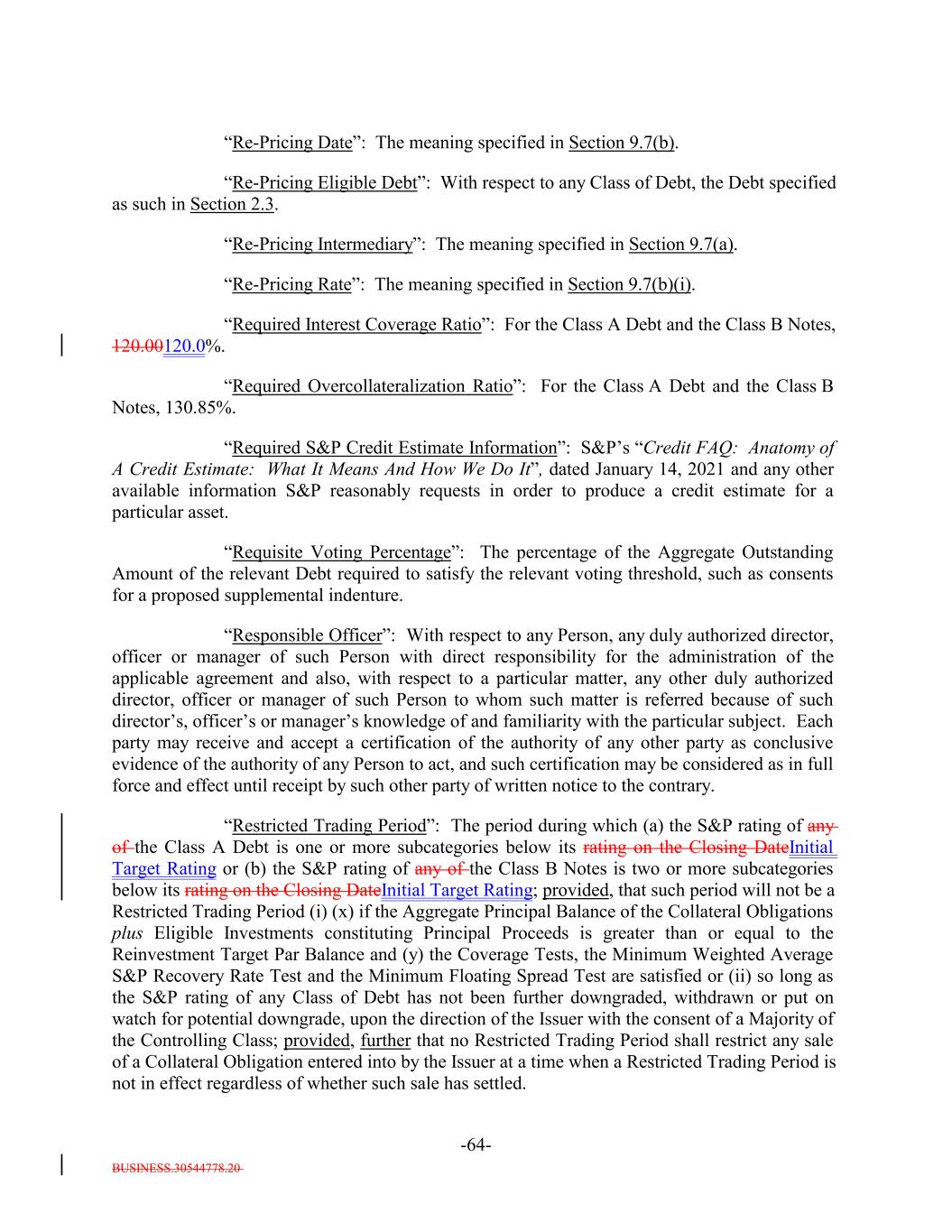 BUSINESS.30544778.20 -64- “Re-Pricing Date”: The meaning specified in Section 9.7(b). “Re-Pricing Eligible Debt”: With respect to any Class of Debt, the Debt specified as such in Section 2.3. “Re-Pricing Intermediary”: The meaning specified in Section 9.7(a). “Re-Pricing Rate”: The meaning specified in Section 9.7(b)(i). “Required Interest Coverage Ratio”: For the Class A Debt and the Class B Notes, 120.00120.0%. “Required Overcollateralization Ratio”: For the Class A Debt and the Class B Notes, 130.85%. “Required S&P Credit Estimate Information”: S&P’s “Credit FAQ: Anatomy of A Credit Estimate: What It Means And How We Do It”, dated January 14, 2021 and any other available information S&P reasonably requests in order to produce a credit estimate for a particular asset. “Requisite Voting Percentage”: The percentage of the Aggregate Outstanding Amount of the relevant Debt required to satisfy the relevant voting threshold, such as consents for a proposed supplemental indenture. “Responsible Officer”: With respect to any Person, any duly authorized director, officer or manager of such Person with direct responsibility for the administration of the applicable agreement and also, with respect to a particular matter, any other duly authorized director, officer or manager of such Person to whom such matter is referred because of such director’s, officer’s or manager’s knowledge of and familiarity with the particular subject. Each party may receive and accept a certification of the authority of any other party as conclusive evidence of the authority of any Person to act, and such certification may be considered as in full force and effect until receipt by such other party of written notice to the contrary. “Restricted Trading Period”: The period during which (a) the S&P rating of any of the Class A Debt is one or more subcategories below its rating on the Closing DateInitial Target Rating or (b) the S&P rating of any of the Class B Notes is two or more subcategories below its rating on the Closing DateInitial Target Rating; provided, that such period will not be a Restricted Trading Period (i) (x) if the Aggregate Principal Balance of the Collateral Obligations plus Eligible Investments constituting Principal Proceeds is greater than or equal to the Reinvestment Target Par Balance and (y) the Coverage Tests, the Minimum Weighted Average S&P Recovery Rate Test and the Minimum Floating Spread Test are satisfied or (ii) so long as the S&P rating of any Class of Debt has not been further downgraded, withdrawn or put on watch for potential downgrade, upon the direction of the Issuer with the consent of a Majority of the Controlling Class; provided, further that no Restricted Trading Period shall restrict any sale of a Collateral Obligation entered into by the Issuer at a time when a Restricted Trading Period is not in effect regardless of whether such sale has settled.