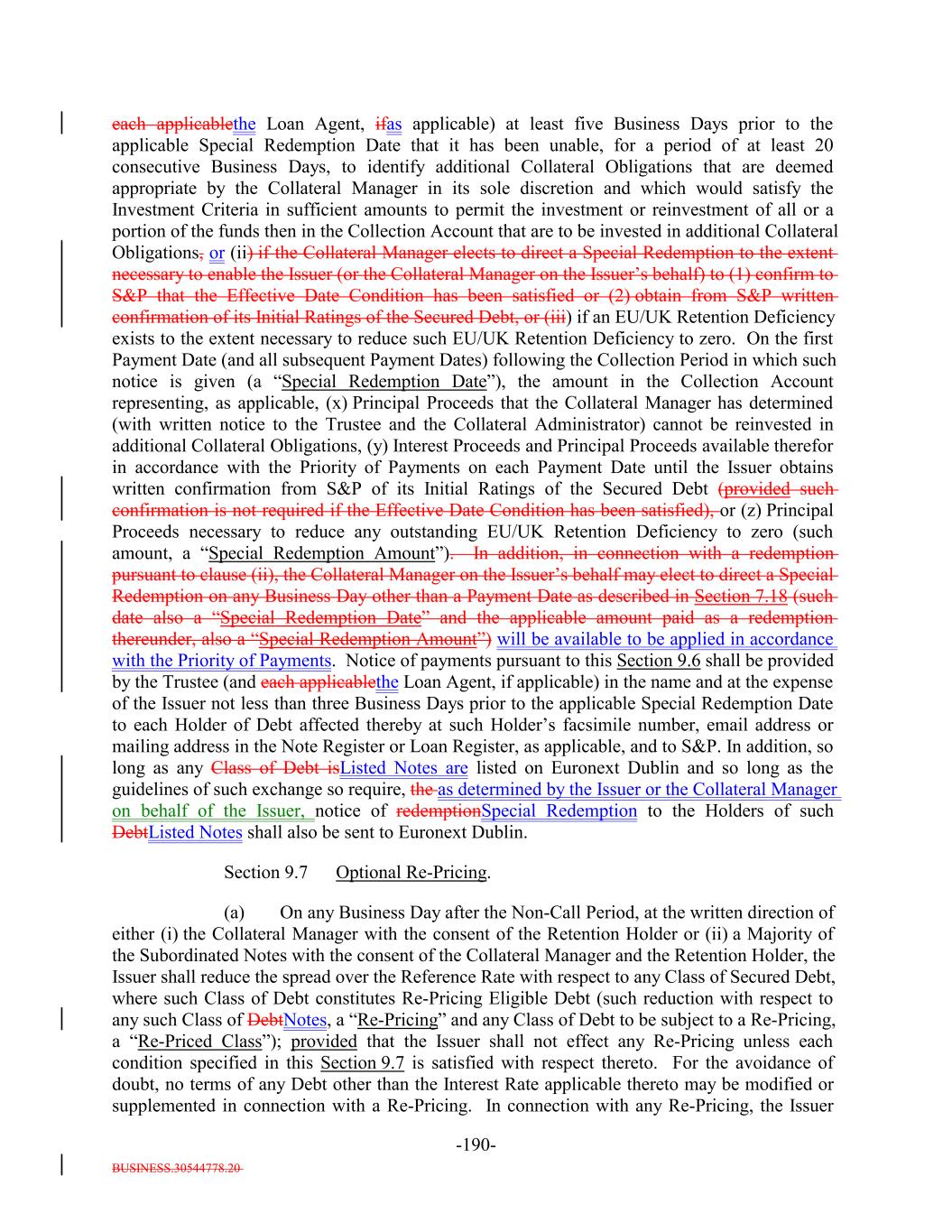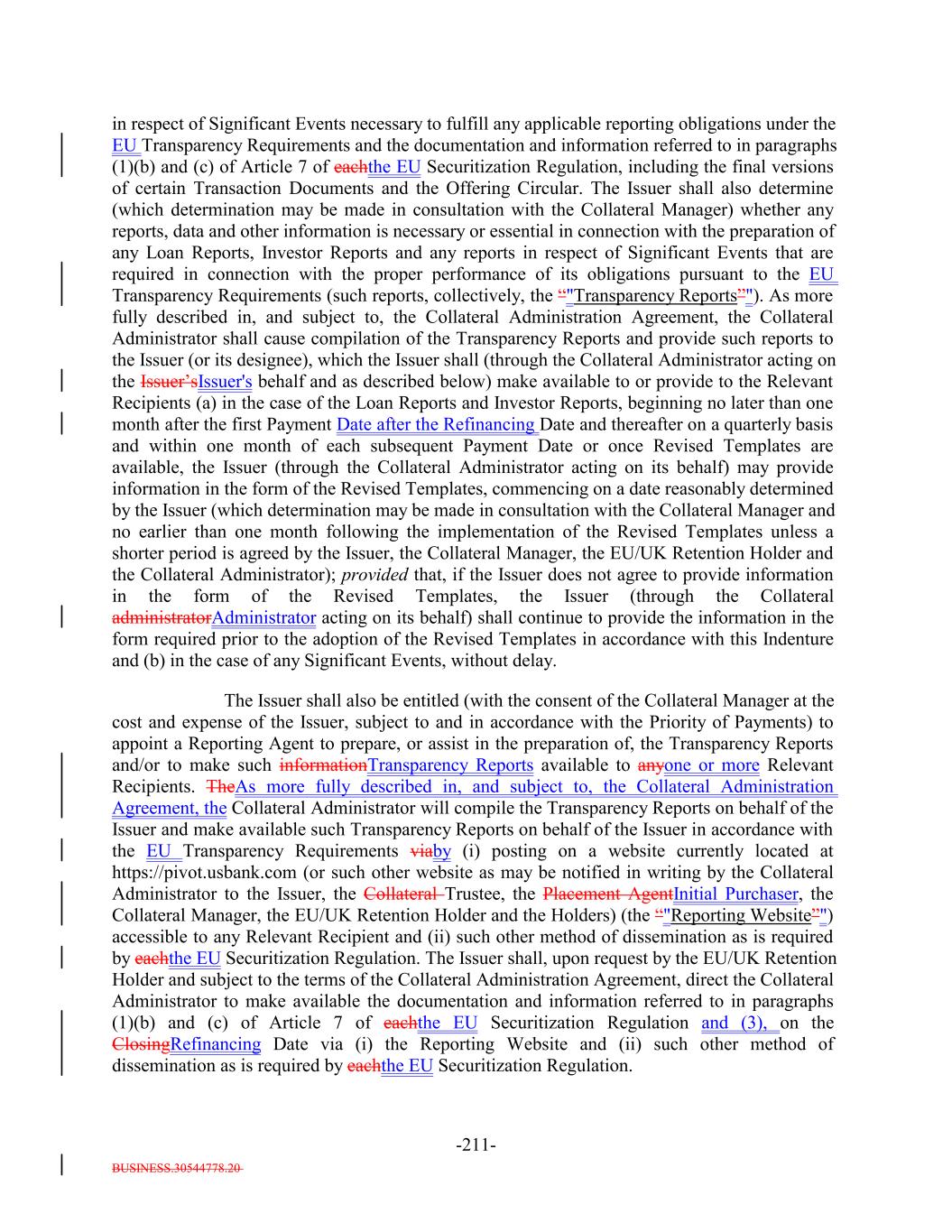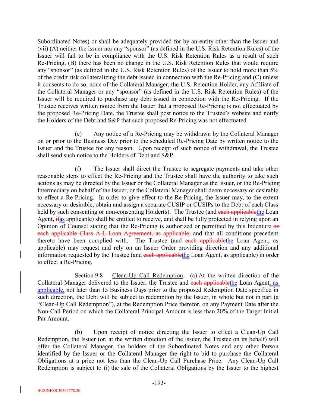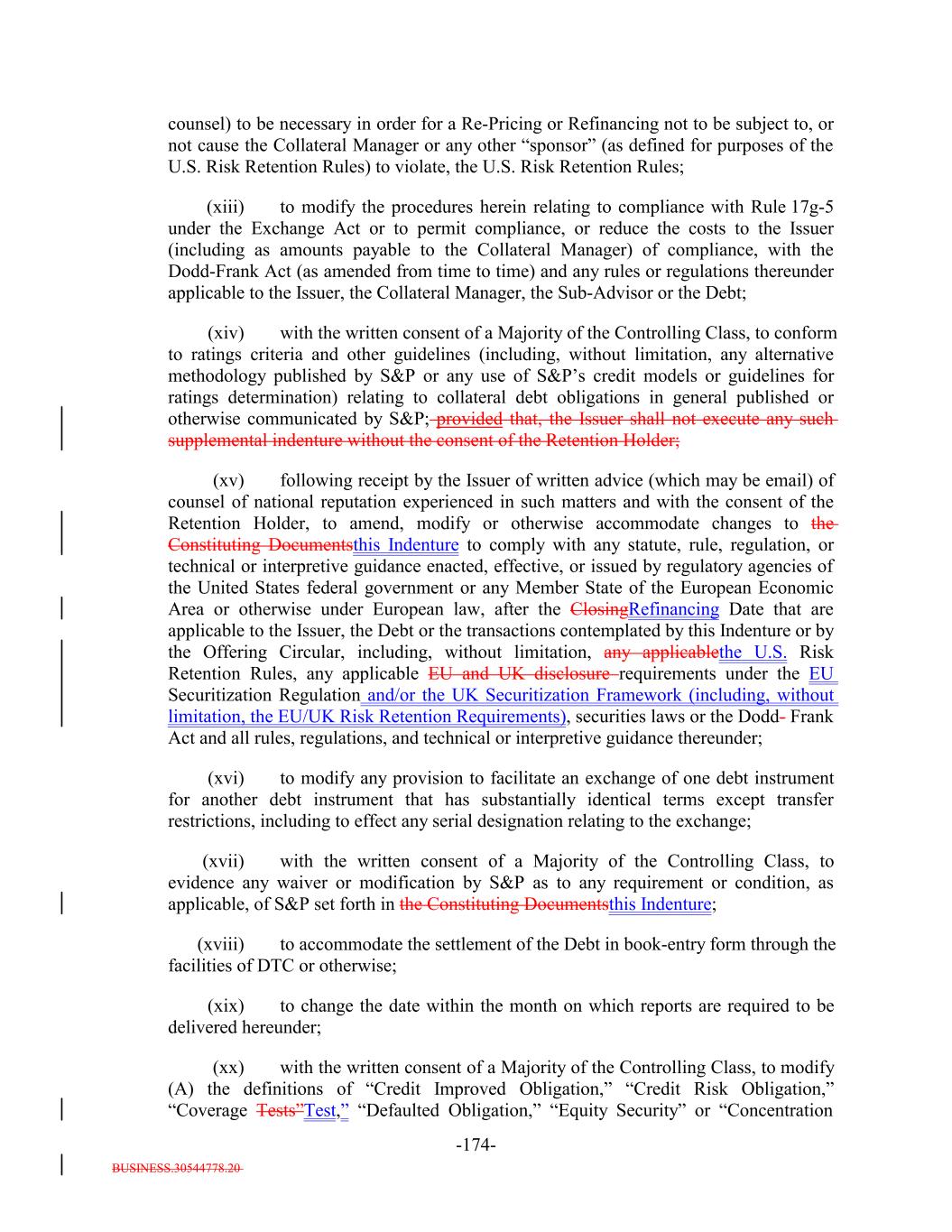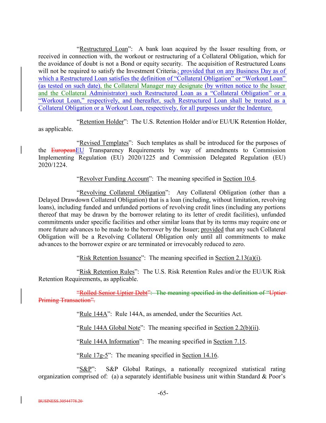BUSINESS.30544778.20 -65- “Restructured Loan”: A bank loan acquired by the Issuer resulting from, or received in connection with, the workout or restructuring of a Collateral Obligation, which for the avoidance of doubt is not a Bond or equity security. The acquisition of Restructured Loans will not be required to satisfy the Investment Criteria.; provided that on any Business Day as of which a Restructured Loan satisfies the definition of “Collateral Obligation” or “Workout Loan” (as tested on such date), the Collateral Manager may designate (by written notice to the Issuer and the Collateral Administrator) such Restructured Loan as a “Collateral Obligation” or a “Workout Loan,” respectively, and thereafter, such Restructured Loan shall be treated as a Collateral Obligation or a Workout Loan, respectively, for all purposes under the Indenture. “Retention Holder”: The U.S. Retention Holder and/or EU/UK Retention Holder, as applicable. “Revised Templates”: Such templates as shall be introduced for the purposes of the EuropeanEU Transparency Requirements by way of amendments to Commission Implementing Regulation (EU) 2020/1225 and Commission Delegated Regulation (EU) 2020/1224. “Revolver Funding Account”: The meaning specified in Section 10.4. “Revolving Collateral Obligation”: Any Collateral Obligation (other than a Delayed Drawdown Collateral Obligation) that is a loan (including, without limitation, revolving loans), including funded and unfunded portions of revolving credit lines (including any portions thereof that may be drawn by the borrower relating to its letter of credit facilities), unfunded commitments under specific facilities and other similar loans that by its terms may require one or more future advances to be made to the borrower by the Issuer; provided that any such Collateral Obligation will be a Revolving Collateral Obligation only until all commitments to make advances to the borrower expire or are terminated or irrevocably reduced to zero. “Risk Retention Issuance”: The meaning specified in Section 2.13(a)(i). “Risk Retention Rules”: The U.S. Risk Retention Rules and/or the EU/UK Risk Retention Requirements, as applicable. “Rolled Senior Uptier Debt”: The meaning specified in the definition of “Uptier Priming Transaction”. “Rule 144A”: Rule 144A, as amended, under the Securities Act. “Rule 144A Global Note”: The meaning specified in Section 2.2(b)(ii). “Rule 144A Information”: The meaning specified in Section 7.15. “Rule 17g-5”: The meaning specified in Section 14.16. “S&P”: S&P Global Ratings, a nationally recognized statistical rating organization comprised of: (a) a separately identifiable business unit within Standard & Poor’s