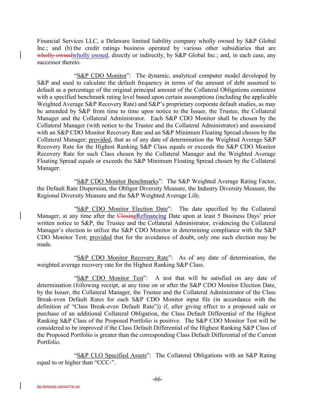 BUSINESS.30544778.20 -66- Financial Services LLC, a Delaware limited liability company wholly owned by S&P Global Inc.; and (b) the credit ratings business operated by various other subsidiaries that are wholly-ownedwholly owned, directly or indirectly, by S&P Global Inc.; and, in each case, any successor thereto. “S&P CDO Monitor”: The dynamic, analytical computer model developed by S&P and used to calculate the default frequency in terms of the amount of debt assumed to default as a percentage of the original principal amount of the Collateral Obligations consistent with a specified benchmark rating level based upon certain assumptions (including the applicable Weighted Average S&P Recovery Rate) and S&P’s proprietary corporate default studies, as may be amended by S&P from time to time upon notice to the Issuer, the Trustee, the Collateral Manager and the Collateral Administrator. Each S&P CDO Monitor shall be chosen by the Collateral Manager (with notice to the Trustee and the Collateral Administrator) and associated with an S&P CDO Monitor Recovery Rate and an S&P Minimum Floating Spread chosen by the Collateral Manager; provided, that as of any date of determination the Weighted Average S&P Recovery Rate for the Highest Ranking S&P Class equals or exceeds the S&P CDO Monitor Recovery Rate for such Class chosen by the Collateral Manager and the Weighted Average Floating Spread equals or exceeds the S&P Minimum Floating Spread chosen by the Collateral Manager. “S&P CDO Monitor Benchmarks”: The S&P Weighted Average Rating Factor, the Default Rate Dispersion, the Obligor Diversity Measure, the Industry Diversity Measure, the Regional Diversity Measure and the S&P Weighted Average Life. “S&P CDO Monitor Election Date”: The date specified by the Collateral Manager, at any time after the ClosingRefinancing Date upon at least 5 Business Days’ prior written notice to S&P, the Trustee and the Collateral Administrator, evidencing the Collateral Manager’s election to utilize the S&P CDO Monitor in determining compliance with the S&P CDO Monitor Test; provided that for the avoidance of doubt, only one such election may be made. “S&P CDO Monitor Recovery Rate”: As of any date of determination, the weighted average recovery rate for the Highest Ranking S&P Class. “S&P CDO Monitor Test”: A test that will be satisfied on any date of determination (following receipt, at any time on or after the S&P CDO Monitor Election Date, by the Issuer, the Collateral Manager, the Trustee and the Collateral Administrator of the Class Break-even Default Rates for each S&P CDO Monitor input file (in accordance with the definition of “Class Break-even Default Rate”)) if, after giving effect to a proposed sale or purchase of an additional Collateral Obligation, the Class Default Differential of the Highest Ranking S&P Class of the Proposed Portfolio is positive. The S&P CDO Monitor Test will be considered to be improved if the Class Default Differential of the Highest Ranking S&P Class of the Proposed Portfolio is greater than the corresponding Class Default Differential of the Current Portfolio. “S&P CLO Specified Assets”: The Collateral Obligations with an S&P Rating equal to or higher than “CCC-”.