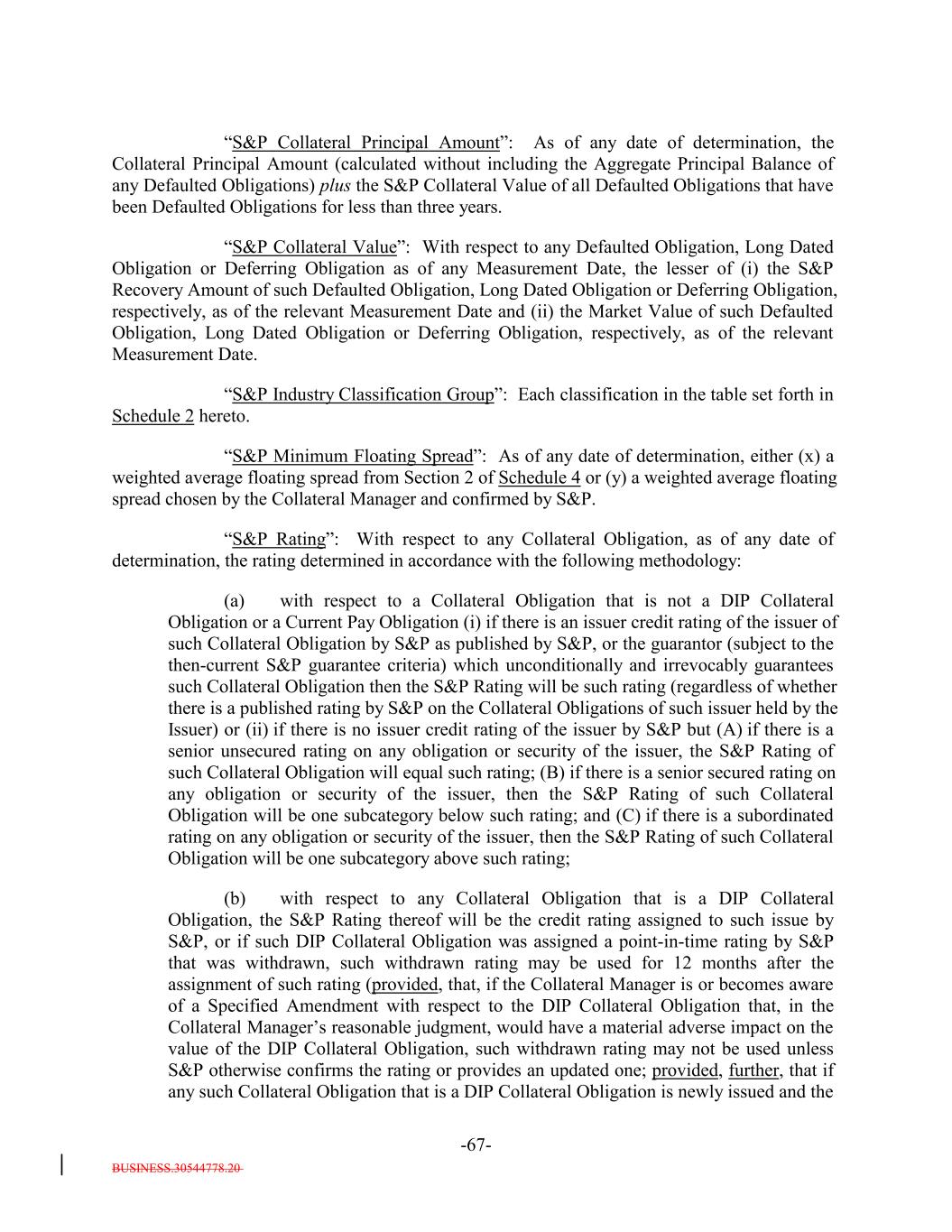 BUSINESS.30544778.20 -67- “S&P Collateral Principal Amount”: As of any date of determination, the Collateral Principal Amount (calculated without including the Aggregate Principal Balance of any Defaulted Obligations) plus the S&P Collateral Value of all Defaulted Obligations that have been Defaulted Obligations for less than three years. “S&P Collateral Value”: With respect to any Defaulted Obligation, Long Dated Obligation or Deferring Obligation as of any Measurement Date, the lesser of (i) the S&P Recovery Amount of such Defaulted Obligation, Long Dated Obligation or Deferring Obligation, respectively, as of the relevant Measurement Date and (ii) the Market Value of such Defaulted Obligation, Long Dated Obligation or Deferring Obligation, respectively, as of the relevant Measurement Date. “S&P Industry Classification Group”: Each classification in the table set forth in Schedule 2 hereto. “S&P Minimum Floating Spread”: As of any date of determination, either (x) a weighted average floating spread from Section 2 of Schedule 4 or (y) a weighted average floating spread chosen by the Collateral Manager and confirmed by S&P. “S&P Rating”: With respect to any Collateral Obligation, as of any date of determination, the rating determined in accordance with the following methodology: (a) with respect to a Collateral Obligation that is not a DIP Collateral Obligation or a Current Pay Obligation (i) if there is an issuer credit rating of the issuer of such Collateral Obligation by S&P as published by S&P, or the guarantor (subject to the then-current S&P guarantee criteria) which unconditionally and irrevocably guarantees such Collateral Obligation then the S&P Rating will be such rating (regardless of whether there is a published rating by S&P on the Collateral Obligations of such issuer held by the Issuer) or (ii) if there is no issuer credit rating of the issuer by S&P but (A) if there is a senior unsecured rating on any obligation or security of the issuer, the S&P Rating of such Collateral Obligation will equal such rating; (B) if there is a senior secured rating on any obligation or security of the issuer, then the S&P Rating of such Collateral Obligation will be one subcategory below such rating; and (C) if there is a subordinated rating on any obligation or security of the issuer, then the S&P Rating of such Collateral Obligation will be one subcategory above such rating; (b) with respect to any Collateral Obligation that is a DIP Collateral Obligation, the S&P Rating thereof will be the credit rating assigned to such issue by S&P, or if such DIP Collateral Obligation was assigned a point-in-time rating by S&P that was withdrawn, such withdrawn rating may be used for 12 months after the assignment of such rating (provided, that, if the Collateral Manager is or becomes aware of a Specified Amendment with respect to the DIP Collateral Obligation that, in the Collateral Manager’s reasonable judgment, would have a material adverse impact on the value of the DIP Collateral Obligation, such withdrawn rating may not be used unless S&P otherwise confirms the rating or provides an updated one; provided, further, that if any such Collateral Obligation that is a DIP Collateral Obligation is newly issued and the
