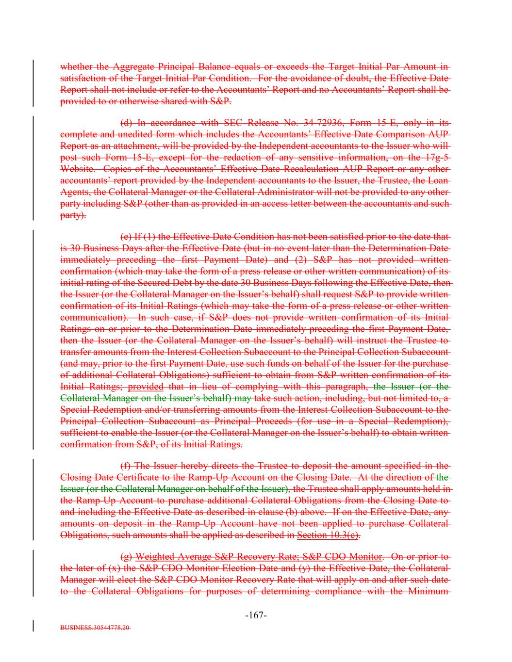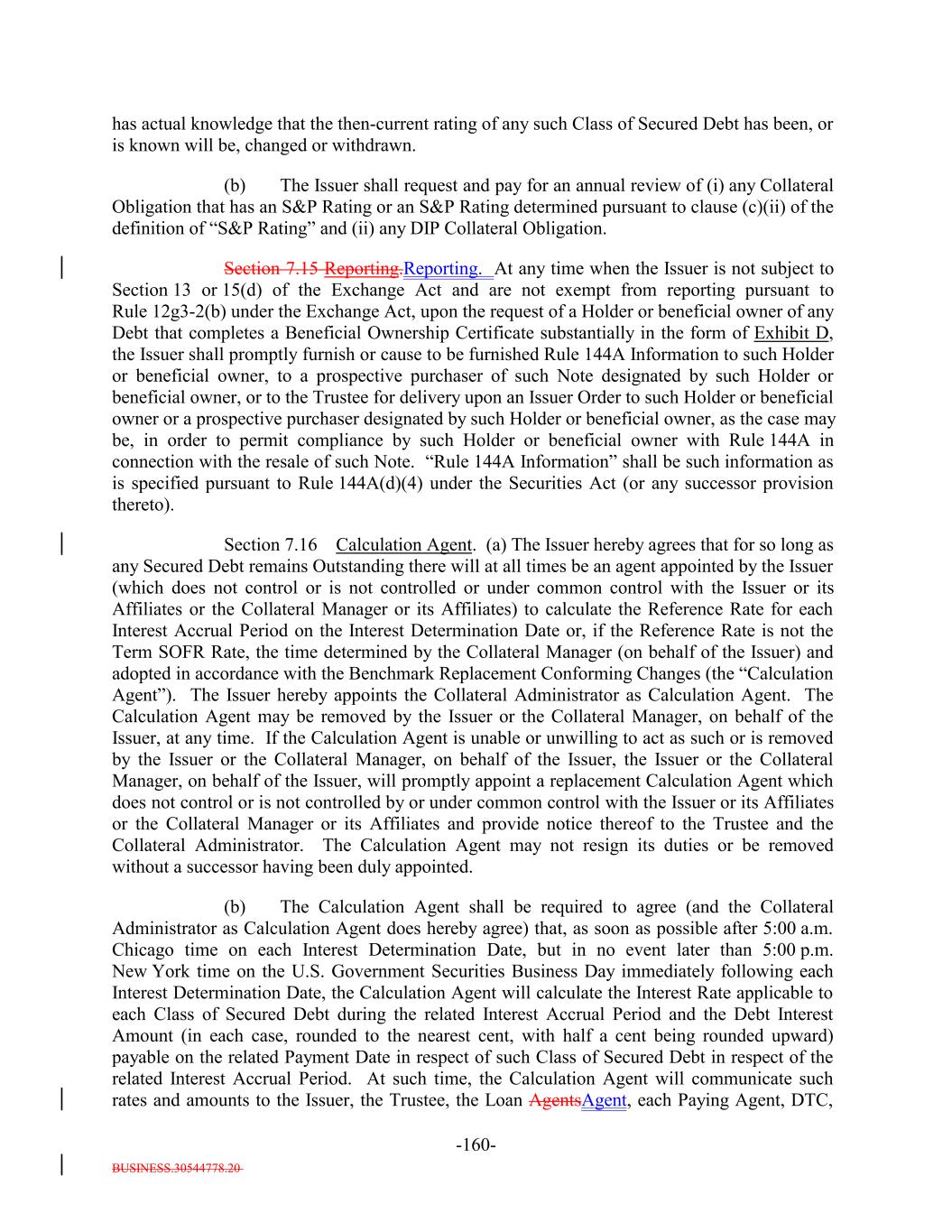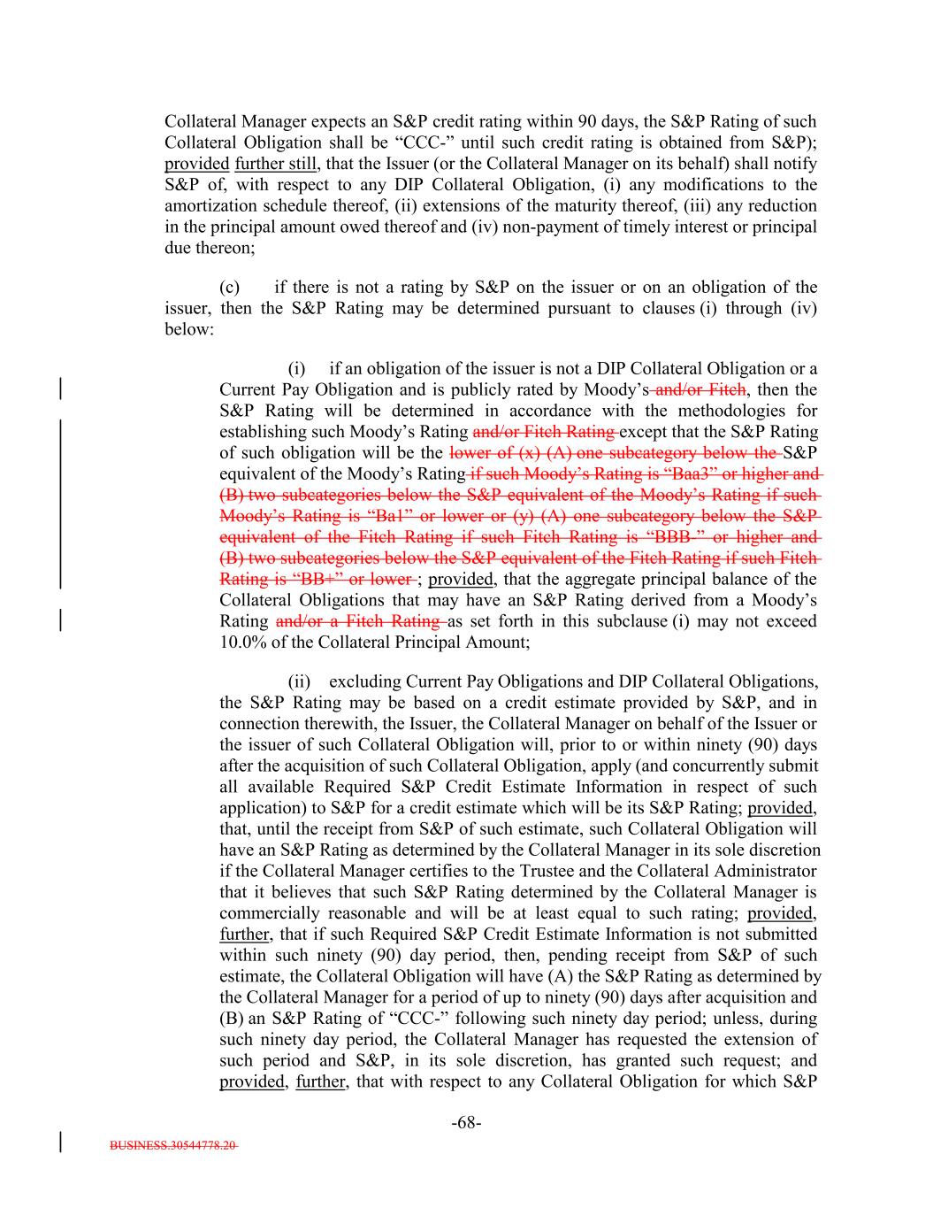 BUSINESS.30544778.20 -68- Collateral Manager expects an S&P credit rating within 90 days, the S&P Rating of such Collateral Obligation shall be “CCC-” until such credit rating is obtained from S&P); provided further still, that the Issuer (or the Collateral Manager on its behalf) shall notify S&P of, with respect to any DIP Collateral Obligation, (i) any modifications to the amortization schedule thereof, (ii) extensions of the maturity thereof, (iii) any reduction in the principal amount owed thereof and (iv) non-payment of timely interest or principal due thereon; (c) if there is not a rating by S&P on the issuer or on an obligation of the issuer, then the S&P Rating may be determined pursuant to clauses (i) through (iv) below: (i) if an obligation of the issuer is not a DIP Collateral Obligation or a Current Pay Obligation and is publicly rated by Moody’s and/or Fitch, then the S&P Rating will be determined in accordance with the methodologies for establishing such Moody’s Rating and/or Fitch Rating except that the S&P Rating of such obligation will be the lower of (x) (A) one subcategory below the S&P equivalent of the Moody’s Rating if such Moody’s Rating is “Baa3” or higher and (B) two subcategories below the S&P equivalent of the Moody’s Rating if such Moody’s Rating is “Ba1” or lower or (y) (A) one subcategory below the S&P equivalent of the Fitch Rating if such Fitch Rating is “BBB-” or higher and (B) two subcategories below the S&P equivalent of the Fitch Rating if such Fitch Rating is “BB+” or lower ; provided, that the aggregate principal balance of the Collateral Obligations that may have an S&P Rating derived from a Moody’s Rating and/or a Fitch Rating as set forth in this subclause (i) may not exceed 10.0% of the Collateral Principal Amount; (ii) excluding Current Pay Obligations and DIP Collateral Obligations, the S&P Rating may be based on a credit estimate provided by S&P, and in connection therewith, the Issuer, the Collateral Manager on behalf of the Issuer or the issuer of such Collateral Obligation will, prior to or within ninety (90) days after the acquisition of such Collateral Obligation, apply (and concurrently submit all available Required S&P Credit Estimate Information in respect of such application) to S&P for a credit estimate which will be its S&P Rating; provided, that, until the receipt from S&P of such estimate, such Collateral Obligation will have an S&P Rating as determined by the Collateral Manager in its sole discretion if the Collateral Manager certifies to the Trustee and the Collateral Administrator that it believes that such S&P Rating determined by the Collateral Manager is commercially reasonable and will be at least equal to such rating; provided, further, that if such Required S&P Credit Estimate Information is not submitted within such ninety (90) day period, then, pending receipt from S&P of such estimate, the Collateral Obligation will have (A) the S&P Rating as determined by the Collateral Manager for a period of up to ninety (90) days after acquisition and (B) an S&P Rating of “CCC-” following such ninety day period; unless, during such ninety day period, the Collateral Manager has requested the extension of such period and S&P, in its sole discretion, has granted such request; and provided, further, that with respect to any Collateral Obligation for which S&P