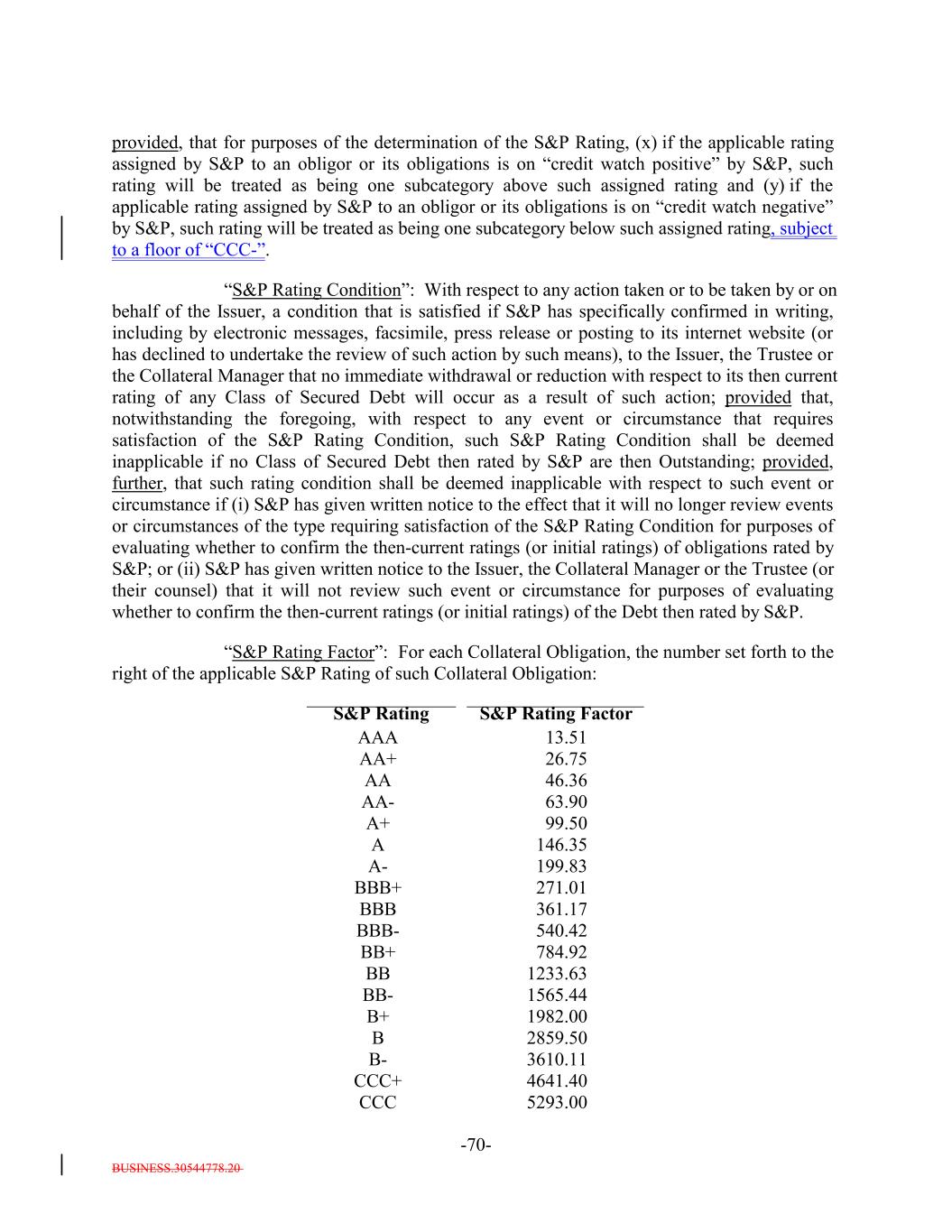 BUSINESS.30544778.20 -70- AA- 13.51 BBB- 63.90 540.42 S&P Rating BB+ 784.92 A+ BB 99.50 1233.63 AA+ BB- S&P Rating Factor 1565.44 A 26.75 B+ 146.35 1982.00 provided, that for purposes of the determination of the S&P Rating, (x) if the applicable rating assigned by S&P to an obligor or its obligations is on “credit watch positive” by S&P, such rating will be treated as being one subcategory above such assigned rating and (y) if the applicable rating assigned by S&P to an obligor or its obligations is on “credit watch negative” by S&P, such rating will be treated as being one subcategory below such assigned rating, subject to a floor of “CCC-”. “S&P Rating Condition”: With respect to any action taken or to be taken by or on behalf of the Issuer, a condition that is satisfied if S&P has specifically confirmed in writing, including by electronic messages, facsimile, press release or posting to its internet website (or has declined to undertake the review of such action by such means), to the Issuer, the Trustee or the Collateral Manager that no immediate withdrawal or reduction with respect to its then current rating of any Class of Secured Debt will occur as a result of such action; provided that, notwithstanding the foregoing, with respect to any event or circumstance that requires satisfaction of the S&P Rating Condition, such S&P Rating Condition shall be deemed inapplicable if no Class of Secured Debt then rated by S&P are then Outstanding; provided, further, that such rating condition shall be deemed inapplicable with respect to such event or circumstance if (i) S&P has given written notice to the effect that it will no longer review events or circumstances of the type requiring satisfaction of the S&P Rating Condition for purposes of evaluating whether to confirm the then-current ratings (or initial ratings) of obligations rated by S&P; or (ii) S&P has given written notice to the Issuer, the Collateral Manager or the Trustee (or their counsel) that it will not review such event or circumstance for purposes of evaluating whether to confirm the then-current ratings (or initial ratings) of the Debt then rated by S&P. “S&P Rating Factor”: For each Collateral Obligation, the number set forth to the right of the applicable S&P Rating of such Collateral Obligation: B 2859.50 A- B- 199.83 3610.11 AA CCC+ 4641.40 BBB+ 46.36 CCC 271.01 5293.00 AAA BBB 361.17