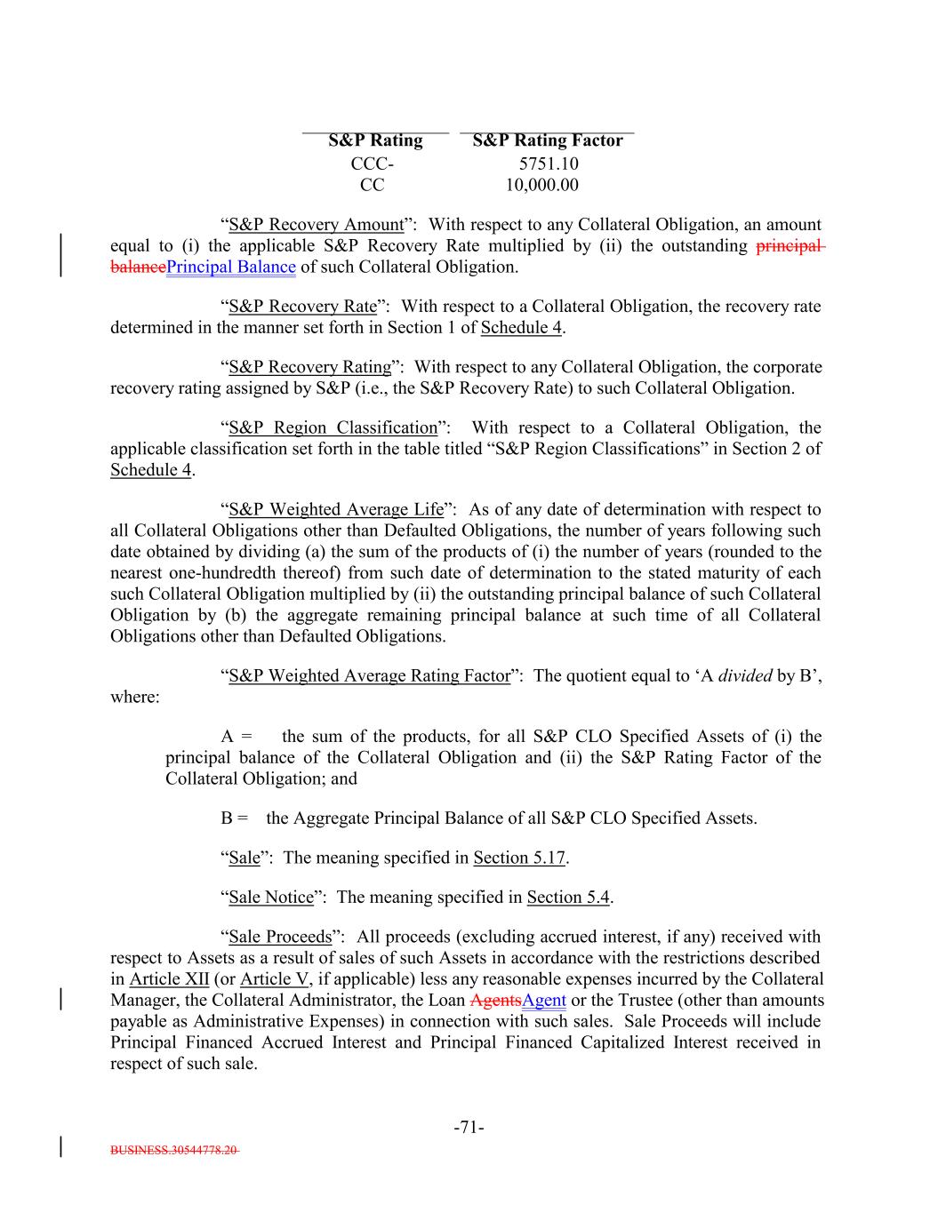 BUSINESS.30544778.20 -71- S&P Rating Factor CC 10,000.00 “S&P Recovery Amount”: With respect to any Collateral Obligation, an amount equal to (i) the applicable S&P Recovery Rate multiplied by (ii) the outstanding principal balancePrincipal Balance of such Collateral Obligation. “S&P Recovery Rate”: With respect to a Collateral Obligation, the recovery rate determined in the manner set forth in Section 1 of Schedule 4. “S&P Recovery Rating”: With respect to any Collateral Obligation, the corporate recovery rating assigned by S&P (i.e., the S&P Recovery Rate) to such Collateral Obligation. “S&P Region Classification”: With respect to a Collateral Obligation, the applicable classification set forth in the table titled “S&P Region Classifications” in Section 2 of Schedule 4. “S&P Weighted Average Life”: As of any date of determination with respect to all Collateral Obligations other than Defaulted Obligations, the number of years following such date obtained by dividing (a) the sum of the products of (i) the number of years (rounded to the nearest one-hundredth thereof) from such date of determination to the stated maturity of each such Collateral Obligation multiplied by (ii) the outstanding principal balance of such Collateral Obligation by (b) the aggregate remaining principal balance at such time of all Collateral Obligations other than Defaulted Obligations. “S&P Weighted Average Rating Factor”: The quotient equal to ‘A divided by B’, where: A = the sum of the products, for all S&P CLO Specified Assets of (i) the principal balance of the Collateral Obligation and (ii) the S&P Rating Factor of the Collateral Obligation; and B = the Aggregate Principal Balance of all S&P CLO Specified Assets. “Sale”: The meaning specified in Section 5.17. “Sale Notice”: The meaning specified in Section 5.4. “Sale Proceeds”: All proceeds (excluding accrued interest, if any) received with respect to Assets as a result of sales of such Assets in accordance with the restrictions described in Article XII (or Article V, if applicable) less any reasonable expenses incurred by the Collateral Manager, the Collateral Administrator, the Loan AgentsAgent or the Trustee (other than amounts payable as Administrative Expenses) in connection with such sales. Sale Proceeds will include Principal Financed Accrued Interest and Principal Financed Capitalized Interest received in respect of such sale. CCC- S&P Rating 5751.10