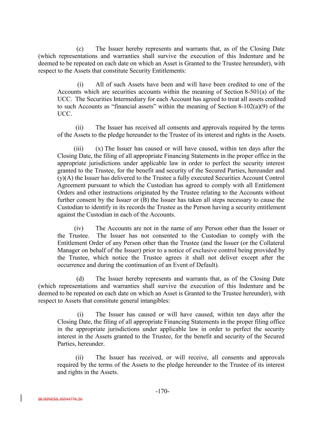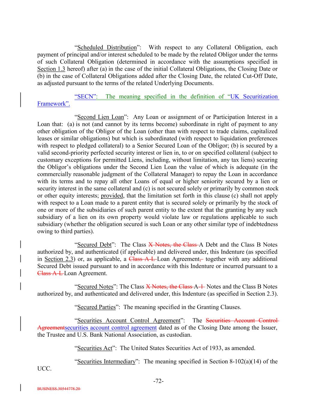 BUSINESS.30544778.20 -72- “Scheduled Distribution”: With respect to any Collateral Obligation, each payment of principal and/or interest scheduled to be made by the related Obligor under the terms of such Collateral Obligation (determined in accordance with the assumptions specified in Section 1.3 hereof) after (a) in the case of the initial Collateral Obligations, the Closing Date or (b) in the case of Collateral Obligations added after the Closing Date, the related Cut-Off Date, as adjusted pursuant to the terms of the related Underlying Documents. “SECN”: The meaning specified in the definition of “UK Securitization Framework”. “Second Lien Loan”: Any Loan or assignment of or Participation Interest in a Loan that: (a) is not (and cannot by its terms become) subordinate in right of payment to any other obligation of the Obligor of the Loan (other than with respect to trade claims, capitalized leases or similar obligations) but which is subordinated (with respect to liquidation preferences with respect to pledged collateral) to a Senior Secured Loan of the Obligor; (b) is secured by a valid second-priority perfected security interest or lien in, to or on specified collateral (subject to customary exceptions for permitted Liens, including, without limitation, any tax liens) securing the Obligor’s obligations under the Second Lien Loan the value of which is adequate (in the commercially reasonable judgment of the Collateral Manager) to repay the Loan in accordance with its terms and to repay all other Loans of equal or higher seniority secured by a lien or security interest in the same collateral and (c) is not secured solely or primarily by common stock or other equity interests; provided, that the limitation set forth in this clause (c) shall not apply with respect to a Loan made to a parent entity that is secured solely or primarily by the stock of one or more of the subsidiaries of such parent entity to the extent that the granting by any such subsidiary of a lien on its own property would violate law or regulations applicable to such subsidiary (whether the obligation secured is such Loan or any other similar type of indebtedness owing to third parties). “Secured Debt”: The Class X Notes, the Class A Debt and the Class B Notes authorized by, and authenticated (if applicable) and delivered under, this Indenture (as specified in Section 2.3) or, as applicable, a Class A-L Loan Agreement, together with any additional Secured Debt issued pursuant to and in accordance with this Indenture or incurred pursuant to a Class A-L Loan Agreement. “Secured Notes”: The Class X Notes, the Class A-1 Notes and the Class B Notes authorized by, and authenticated and delivered under, this Indenture (as specified in Section 2.3). “Secured Parties”: The meaning specified in the Granting Clauses. “Securities Account Control Agreement”: The Securities Account Control Agreementsecurities account control agreement dated as of the Closing Date among the Issuer, the Trustee and U.S. Bank National Association, as custodian. “Securities Act”: The United States Securities Act of 1933, as amended. “Securities Intermediary”: The meaning specified in Section 8-102(a)(14) of the UCC.