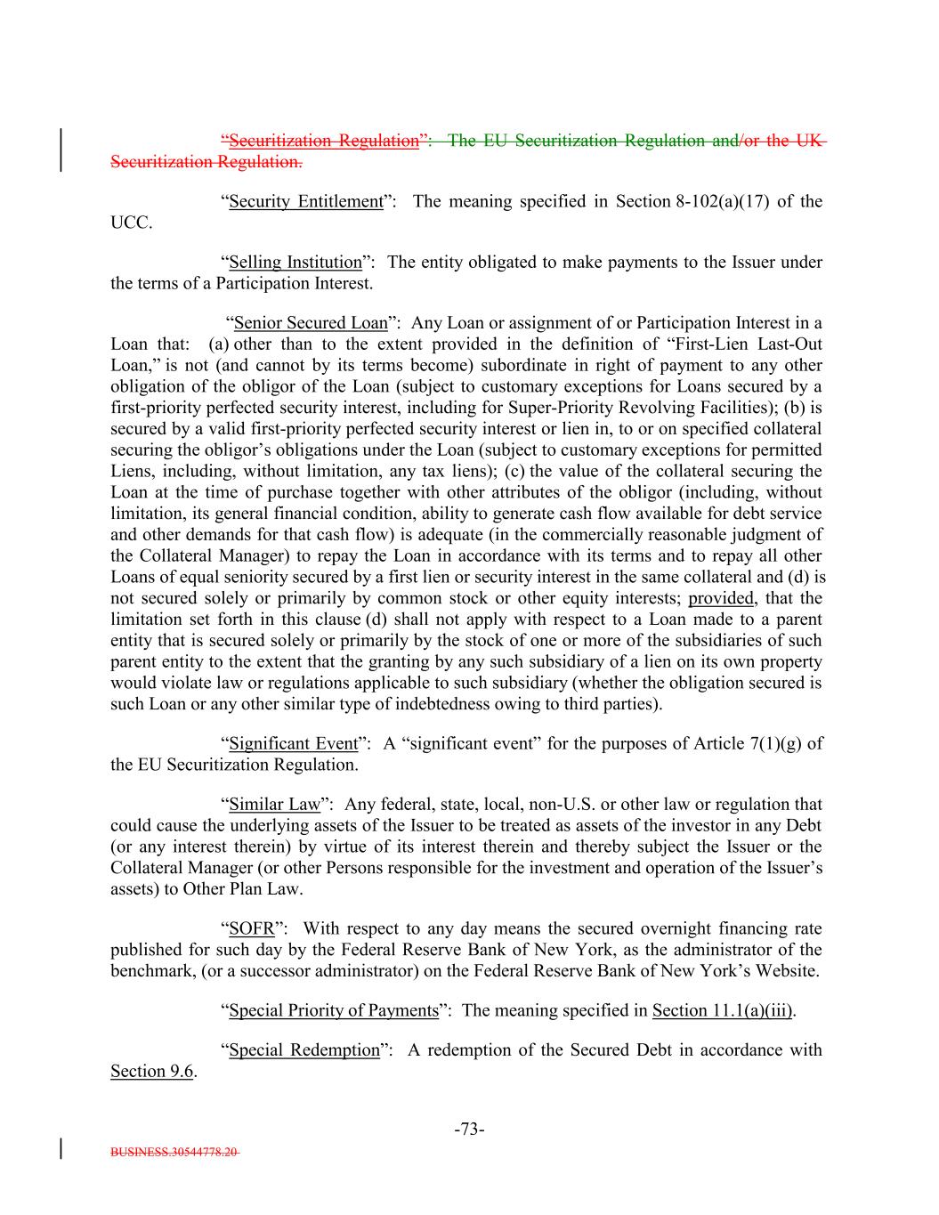 BUSINESS.30544778.20 -73- “Securitization Regulation”: The EU Securitization Regulation and/or the UK Securitization Regulation. “Security Entitlement”: The meaning specified in Section 8-102(a)(17) of the UCC. “Selling Institution”: The entity obligated to make payments to the Issuer under the terms of a Participation Interest. “Senior Secured Loan”: Any Loan or assignment of or Participation Interest in a Loan that: (a) other than to the extent provided in the definition of “First-Lien Last-Out Loan,” is not (and cannot by its terms become) subordinate in right of payment to any other obligation of the obligor of the Loan (subject to customary exceptions for Loans secured by a first-priority perfected security interest, including for Super-Priority Revolving Facilities); (b) is secured by a valid first-priority perfected security interest or lien in, to or on specified collateral securing the obligor’s obligations under the Loan (subject to customary exceptions for permitted Liens, including, without limitation, any tax liens); (c) the value of the collateral securing the Loan at the time of purchase together with other attributes of the obligor (including, without limitation, its general financial condition, ability to generate cash flow available for debt service and other demands for that cash flow) is adequate (in the commercially reasonable judgment of the Collateral Manager) to repay the Loan in accordance with its terms and to repay all other Loans of equal seniority secured by a first lien or security interest in the same collateral and (d) is not secured solely or primarily by common stock or other equity interests; provided, that the limitation set forth in this clause (d) shall not apply with respect to a Loan made to a parent entity that is secured solely or primarily by the stock of one or more of the subsidiaries of such parent entity to the extent that the granting by any such subsidiary of a lien on its own property would violate law or regulations applicable to such subsidiary (whether the obligation secured is such Loan or any other similar type of indebtedness owing to third parties). “Significant Event”: A “significant event” for the purposes of Article 7(1)(g) of the EU Securitization Regulation. “Similar Law”: Any federal, state, local, non-U.S. or other law or regulation that could cause the underlying assets of the Issuer to be treated as assets of the investor in any Debt (or any interest therein) by virtue of its interest therein and thereby subject the Issuer or the Collateral Manager (or other Persons responsible for the investment and operation of the Issuer’s assets) to Other Plan Law. “SOFR”: With respect to any day means the secured overnight financing rate published for such day by the Federal Reserve Bank of New York, as the administrator of the benchmark, (or a successor administrator) on the Federal Reserve Bank of New York’s Website. “Special Priority of Payments”: The meaning specified in Section 11.1(a)(iii). “Special Redemption”: A redemption of the Secured Debt in accordance with Section 9.6.