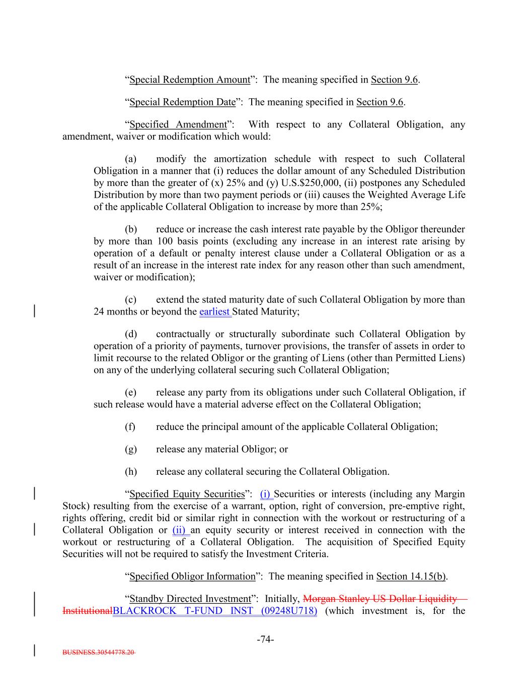BUSINESS.30544778.20 -74- “Special Redemption Amount”: The meaning specified in Section 9.6. “Special Redemption Date”: The meaning specified in Section 9.6. “Specified Amendment”: With respect to any Collateral Obligation, any amendment, waiver or modification which would: (a) modify the amortization schedule with respect to such Collateral Obligation in a manner that (i) reduces the dollar amount of any Scheduled Distribution by more than the greater of (x) 25% and (y) U.S.$250,000, (ii) postpones any Scheduled Distribution by more than two payment periods or (iii) causes the Weighted Average Life of the applicable Collateral Obligation to increase by more than 25%; (b) reduce or increase the cash interest rate payable by the Obligor thereunder by more than 100 basis points (excluding any increase in an interest rate arising by operation of a default or penalty interest clause under a Collateral Obligation or as a result of an increase in the interest rate index for any reason other than such amendment, waiver or modification); (c) extend the stated maturity date of such Collateral Obligation by more than 24 months or beyond the earliest Stated Maturity; (d) contractually or structurally subordinate such Collateral Obligation by operation of a priority of payments, turnover provisions, the transfer of assets in order to limit recourse to the related Obligor or the granting of Liens (other than Permitted Liens) on any of the underlying collateral securing such Collateral Obligation; (e) release any party from its obligations under such Collateral Obligation, if such release would have a material adverse effect on the Collateral Obligation; (f) reduce the principal amount of the applicable Collateral Obligation; (g) release any material Obligor; or (h) release any collateral securing the Collateral Obligation. “Specified Equity Securities”: (i) Securities or interests (including any Margin Stock) resulting from the exercise of a warrant, option, right of conversion, pre-emptive right, rights offering, credit bid or similar right in connection with the workout or restructuring of a Collateral Obligation or (ii) an equity security or interest received in connection with the workout or restructuring of a Collateral Obligation. The acquisition of Specified Equity Securities will not be required to satisfy the Investment Criteria. “Specified Obligor Information”: The meaning specified in Section 14.15(b). “Standby Directed Investment”: Initially, Morgan Stanley US Dollar Liquidity – InstitutionalBLACKROCK T-FUND INST (09248U718) (which investment is, for the