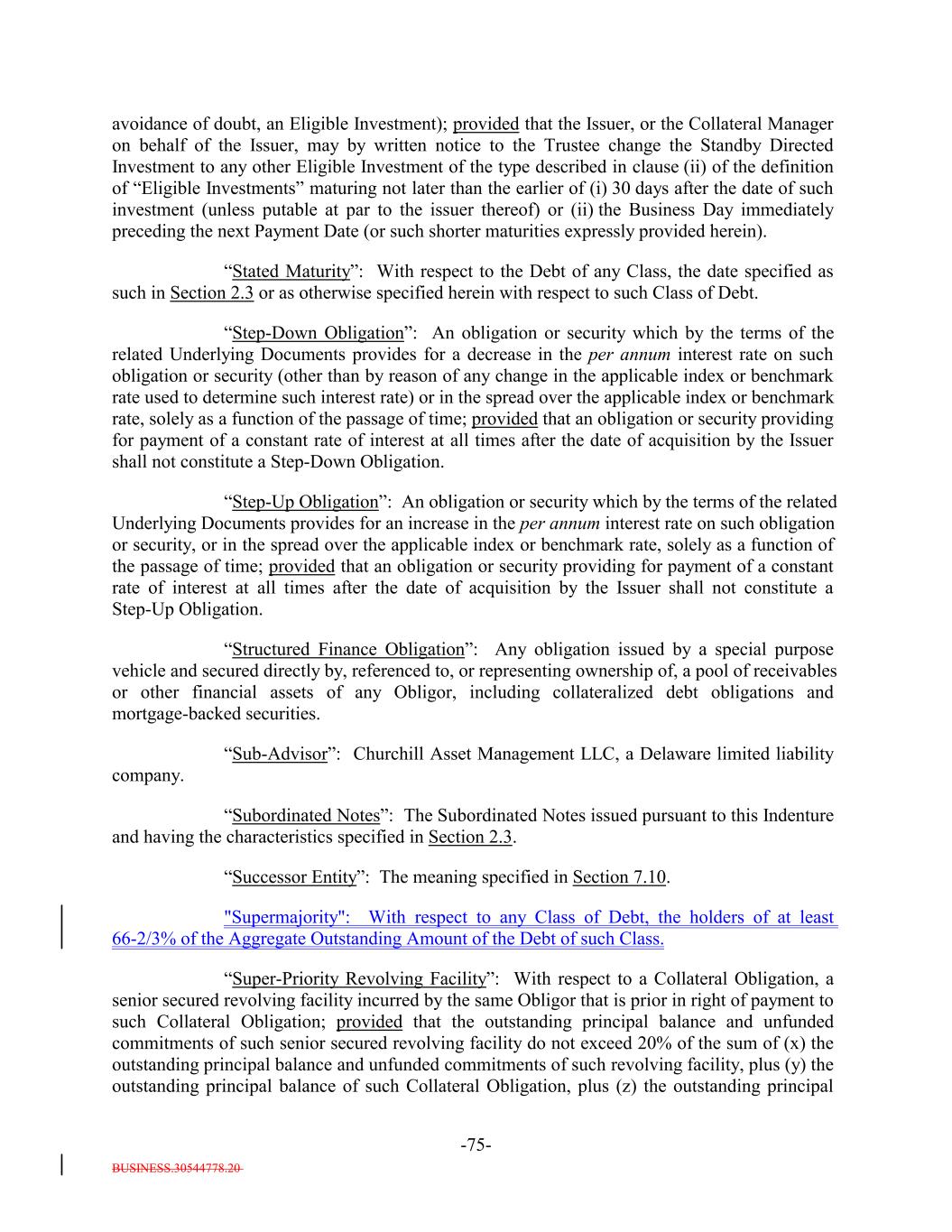 BUSINESS.30544778.20 -75- avoidance of doubt, an Eligible Investment); provided that the Issuer, or the Collateral Manager on behalf of the Issuer, may by written notice to the Trustee change the Standby Directed Investment to any other Eligible Investment of the type described in clause (ii) of the definition of “Eligible Investments” maturing not later than the earlier of (i) 30 days after the date of such investment (unless putable at par to the issuer thereof) or (ii) the Business Day immediately preceding the next Payment Date (or such shorter maturities expressly provided herein). “Stated Maturity”: With respect to the Debt of any Class, the date specified as such in Section 2.3 or as otherwise specified herein with respect to such Class of Debt. “Step-Down Obligation”: An obligation or security which by the terms of the related Underlying Documents provides for a decrease in the per annum interest rate on such obligation or security (other than by reason of any change in the applicable index or benchmark rate used to determine such interest rate) or in the spread over the applicable index or benchmark rate, solely as a function of the passage of time; provided that an obligation or security providing for payment of a constant rate of interest at all times after the date of acquisition by the Issuer shall not constitute a Step-Down Obligation. “Step-Up Obligation”: An obligation or security which by the terms of the related Underlying Documents provides for an increase in the per annum interest rate on such obligation or security, or in the spread over the applicable index or benchmark rate, solely as a function of the passage of time; provided that an obligation or security providing for payment of a constant rate of interest at all times after the date of acquisition by the Issuer shall not constitute a Step-Up Obligation. “Structured Finance Obligation”: Any obligation issued by a special purpose vehicle and secured directly by, referenced to, or representing ownership of, a pool of receivables or other financial assets of any Obligor, including collateralized debt obligations and mortgage-backed securities. “Sub-Advisor”: Churchill Asset Management LLC, a Delaware limited liability company. “Subordinated Notes”: The Subordinated Notes issued pursuant to this Indenture and having the characteristics specified in Section 2.3. “Successor Entity”: The meaning specified in Section 7.10. "Supermajority": With respect to any Class of Debt, the holders of at least 66-2/3% of the Aggregate Outstanding Amount of the Debt of such Class. “Super-Priority Revolving Facility”: With respect to a Collateral Obligation, a senior secured revolving facility incurred by the same Obligor that is prior in right of payment to such Collateral Obligation; provided that the outstanding principal balance and unfunded commitments of such senior secured revolving facility do not exceed 20% of the sum of (x) the outstanding principal balance and unfunded commitments of such revolving facility, plus (y) the outstanding principal balance of such Collateral Obligation, plus (z) the outstanding principal