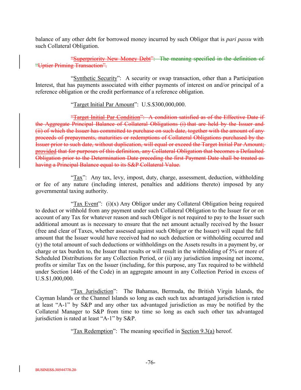 BUSINESS.30544778.20 -76- balance of any other debt for borrowed money incurred by such Obligor that is pari passu with such Collateral Obligation. “Superpriority New Money Debt”: The meaning specified in the definition of “Uptier Priming Transaction”. “Synthetic Security”: A security or swap transaction, other than a Participation Interest, that has payments associated with either payments of interest on and/or principal of a reference obligation or the credit performance of a reference obligation. “Target Initial Par Amount”: U.S.$300,000,000. “Target Initial Par Condition”: A condition satisfied as of the Effective Date if the Aggregate Principal Balance of Collateral Obligations (i) that are held by the Issuer and (ii) of which the Issuer has committed to purchase on such date, together with the amount of any proceeds of prepayments, maturities or redemptions of Collateral Obligations purchased by the Issuer prior to such date, without duplication, will equal or exceed the Target Initial Par Amount; provided that for purposes of this definition, any Collateral Obligation that becomes a Defaulted Obligation prior to the Determination Date preceding the first Payment Date shall be treated as having a Principal Balance equal to its S&P Collateral Value. “Tax”: Any tax, levy, impost, duty, charge, assessment, deduction, withholding or fee of any nature (including interest, penalties and additions thereto) imposed by any governmental taxing authority. “Tax Event”: (i)(x) Any Obligor under any Collateral Obligation being required to deduct or withhold from any payment under such Collateral Obligation to the Issuer for or on account of any Tax for whatever reason and such Obligor is not required to pay to the Issuer such additional amount as is necessary to ensure that the net amount actually received by the Issuer (free and clear of Taxes, whether assessed against such Obligor or the Issuer) will equal the full amount that the Issuer would have received had no such deduction or withholding occurred and (y) the total amount of such deductions or withholdings on the Assets results in a payment by, or charge or tax burden to, the Issuer that results or will result in the withholding of 5% or more of Scheduled Distributions for any Collection Period, or (ii) any jurisdiction imposing net income, profits or similar Tax on the Issuer (including, for this purpose, any Tax required to be withheld under Section 1446 of the Code) in an aggregate amount in any Collection Period in excess of U.S.$1,000,000. “Tax Jurisdiction”: The Bahamas, Bermuda, the British Virgin Islands, the Cayman Islands or the Channel Islands so long as each such tax advantaged jurisdiction is rated at least “A-1” by S&P and any other tax advantaged jurisdiction as may be notified by the Collateral Manager to S&P from time to time so long as each such other tax advantaged jurisdiction is rated at least “A-1” by S&P. “Tax Redemption”: The meaning specified in Section 9.3(a) hereof.