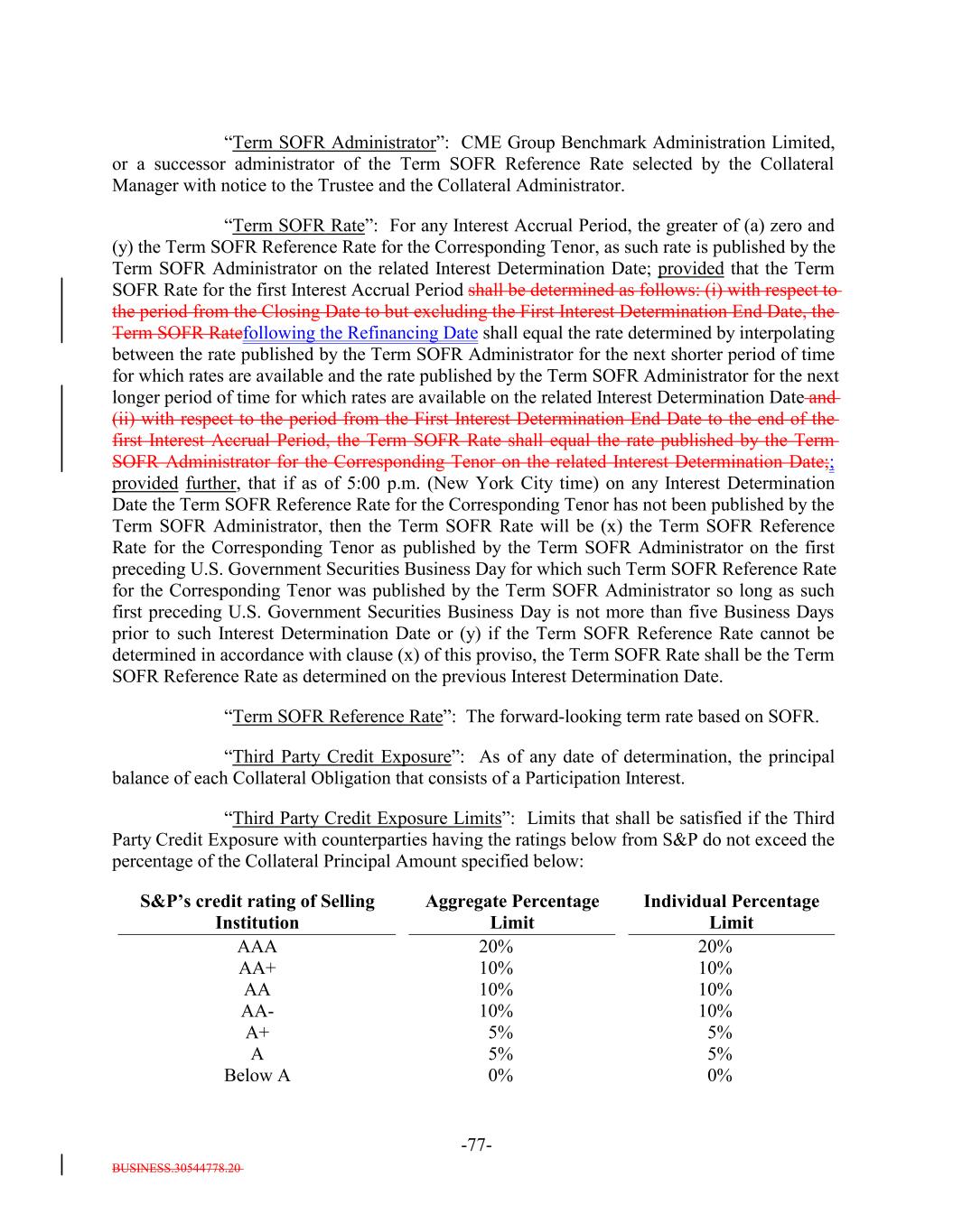 BUSINESS.30544778.20 -77- AA- 20% 10% Aggregate Percentage Limit 10% “Term SOFR Administrator”: CME Group Benchmark Administration Limited, or a successor administrator of the Term SOFR Reference Rate selected by the Collateral Manager with notice to the Trustee and the Collateral Administrator. “Term SOFR Rate”: For any Interest Accrual Period, the greater of (a) zero and (y) the Term SOFR Reference Rate for the Corresponding Tenor, as such rate is published by the Term SOFR Administrator on the related Interest Determination Date; provided that the Term SOFR Rate for the first Interest Accrual Period shall be determined as follows: (i) with respect to the period from the Closing Date to but excluding the First Interest Determination End Date, the Term SOFR Ratefollowing the Refinancing Date shall equal the rate determined by interpolating between the rate published by the Term SOFR Administrator for the next shorter period of time for which rates are available and the rate published by the Term SOFR Administrator for the next longer period of time for which rates are available on the related Interest Determination Date and (ii) with respect to the period from the First Interest Determination End Date to the end of the first Interest Accrual Period, the Term SOFR Rate shall equal the rate published by the Term SOFR Administrator for the Corresponding Tenor on the related Interest Determination Date;; provided further, that if as of 5:00 p.m. (New York City time) on any Interest Determination Date the Term SOFR Reference Rate for the Corresponding Tenor has not been published by the Term SOFR Administrator, then the Term SOFR Rate will be (x) the Term SOFR Reference Rate for the Corresponding Tenor as published by the Term SOFR Administrator on the first preceding U.S. Government Securities Business Day for which such Term SOFR Reference Rate for the Corresponding Tenor was published by the Term SOFR Administrator so long as such first preceding U.S. Government Securities Business Day is not more than five Business Days prior to such Interest Determination Date or (y) if the Term SOFR Reference Rate cannot be determined in accordance with clause (x) of this proviso, the Term SOFR Rate shall be the Term SOFR Reference Rate as determined on the previous Interest Determination Date. “Term SOFR Reference Rate”: The forward-looking term rate based on SOFR. “Third Party Credit Exposure”: As of any date of determination, the principal balance of each Collateral Obligation that consists of a Participation Interest. “Third Party Credit Exposure Limits”: Limits that shall be satisfied if the Third Party Credit Exposure with counterparties having the ratings below from S&P do not exceed the percentage of the Collateral Principal Amount specified below: A+ AA+ 5% Individual Percentage Limit 5% 10% A 10% 5% 5% Below A AA 0% AAA 0% 10% S&P’s credit rating of Selling Institution 10% 20%