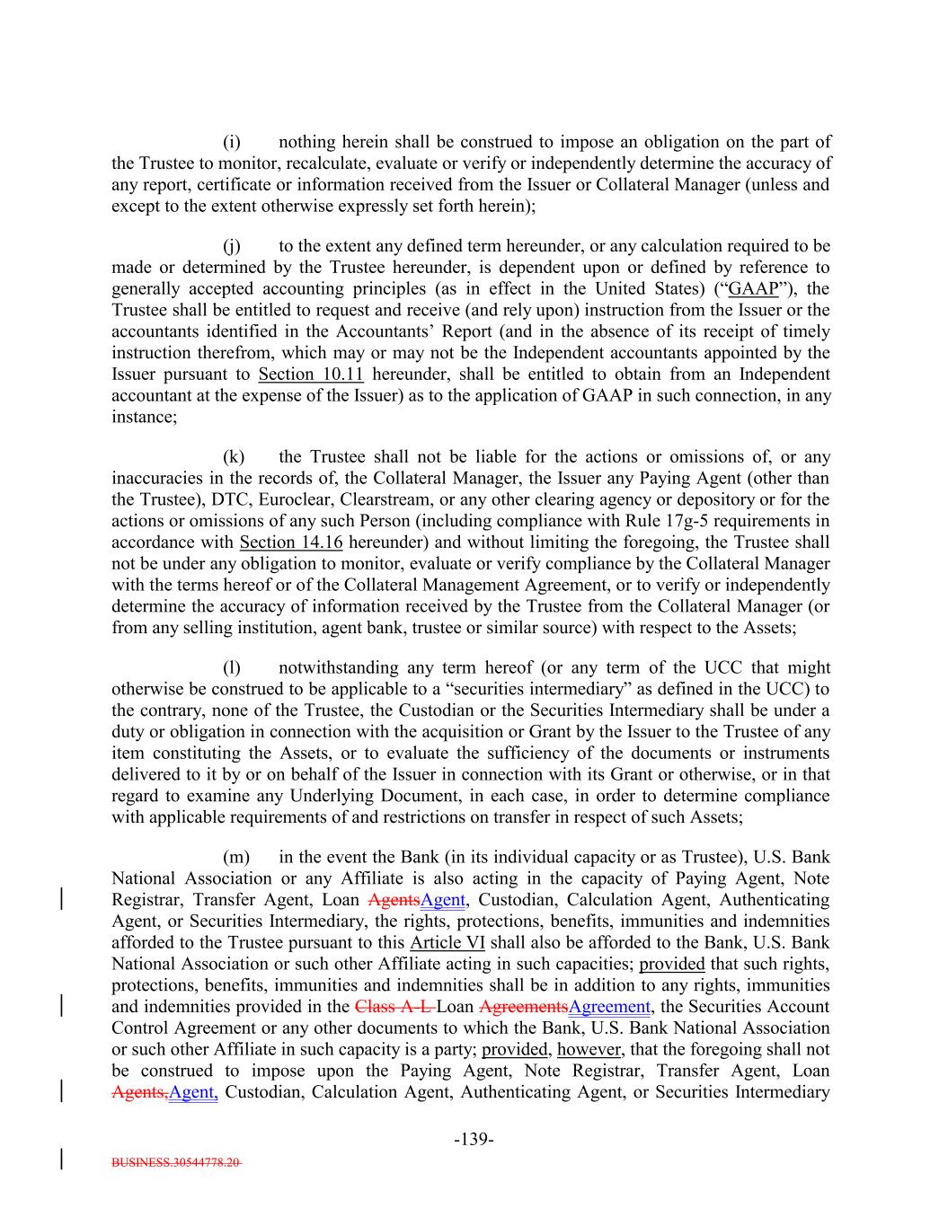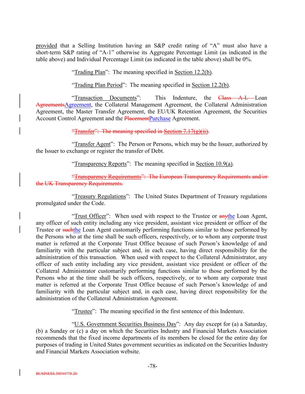 BUSINESS.30544778.20 -78- provided that a Selling Institution having an S&P credit rating of “A” must also have a short-term S&P rating of “A-1” otherwise its Aggregate Percentage Limit (as indicated in the table above) and Individual Percentage Limit (as indicated in the table above) shall be 0%. “Trading Plan”: The meaning specified in Section 12.2(b). “Trading Plan Period”: The meaning specified in Section 12.2(b). “Transaction Documents”: This Indenture, the Class A-L Loan AgreementsAgreement, the Collateral Management Agreement, the Collateral Administration Agreement, the Master Transfer Agreement, the EU/UK Retention Agreement, the Securities Account Control Agreement and the PlacementPurchase Agreement. “Transfer”: The meaning specified in Section 7.17(g)(ii). “Transfer Agent”: The Person or Persons, which may be the Issuer, authorized by the Issuer to exchange or register the transfer of Debt. “Transparency Reports”: The meaning specified in Section 10.9(a). “Transparency Requirements”: The European Transparency Requirements and/or the UK Transparency Requirements. “Treasury Regulations”: The United States Department of Treasury regulations promulgated under the Code. “Trust Officer”: When used with respect to the Trustee or anythe Loan Agent, any officer of such entity including any vice president, assistant vice president or officer of the Trustee or suchthe Loan Agent customarily performing functions similar to those performed by the Persons who at the time shall be such officers, respectively, or to whom any corporate trust matter is referred at the Corporate Trust Office because of such Person’s knowledge of and familiarity with the particular subject and, in each case, having direct responsibility for the administration of this transaction. When used with respect to the Collateral Administrator, any officer of such entity including any vice president, assistant vice president or officer of the Collateral Administrator customarily performing functions similar to those performed by the Persons who at the time shall be such officers, respectively, or to whom any corporate trust matter is referred at the Corporate Trust Office because of such Person’s knowledge of and familiarity with the particular subject and, in each case, having direct responsibility for the administration of the Collateral Administration Agreement. “Trustee”: The meaning specified in the first sentence of this Indenture. “U.S. Government Securities Business Day”: Any day except for (a) a Saturday, (b) a Sunday or (c) a day on which the Securities Industry and Financial Markets Association recommends that the fixed income departments of its members be closed for the entire day for purposes of trading in United States government securities as indicated on the Securities Industry and Financial Markets Association website.