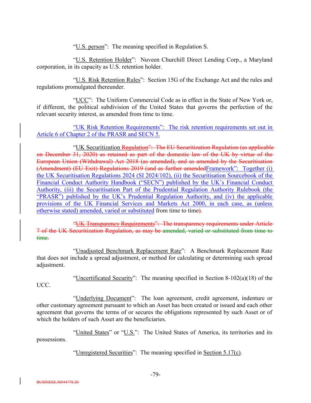 BUSINESS.30544778.20 -79- “U.S. person”: The meaning specified in Regulation S. “U.S. Retention Holder”: Nuveen Churchill Direct Lending Corp., a Maryland corporation, in its capacity as U.S. retention holder. “U.S. Risk Retention Rules”: Section 15G of the Exchange Act and the rules and regulations promulgated thereunder. “UCC”: The Uniform Commercial Code as in effect in the State of New York or, if different, the political subdivision of the United States that governs the perfection of the relevant security interest, as amended from time to time. “UK Risk Retention Requirements”: The risk retention requirements set out in Article 6 of Chapter 2 of the PRASR and SECN 5. “UK Securitization Regulation”: The EU Securitization Regulation (as applicable on December 31, 2020) as retained as part of the domestic law of the UK by virtue of the European Union (Withdrawal) Act 2018 (as amended), and as amended by the Securitisation (Amendment) (EU Exit) Regulations 2019 (and as further amendedFramework”: Together (i) the UK Securitisation Regulations 2024 (SI 2024/102), (ii) the Securitisation Sourcebook of the Financial Conduct Authority Handbook (“SECN”) published by the UK’s Financial Conduct Authority, (iii) the Securitisation Part of the Prudential Regulation Authority Rulebook (the “PRASR”) published by the UK’s Prudential Regulation Authority, and (iv) the applicable provisions of the UK Financial Services and Markets Act 2000, in each case, as (unless otherwise stated) amended, varied or substituted from time to time). “UK Transparency Requirements”: The transparency requirements under Article 7 of the UK Securitization Regulation, as may be amended, varied or substituted from time to time. “Unadjusted Benchmark Replacement Rate”: A Benchmark Replacement Rate that does not include a spread adjustment, or method for calculating or determining such spread adjustment. “Uncertificated Security”: The meaning specified in Section 8-102(a)(18) of the UCC. “Underlying Document”: The loan agreement, credit agreement, indenture or other customary agreement pursuant to which an Asset has been created or issued and each other agreement that governs the terms of or secures the obligations represented by such Asset or of which the holders of such Asset are the beneficiaries. “United States” or “U.S.”: The United States of America, its territories and its possessions. “Unregistered Securities”: The meaning specified in Section 5.17(c).
