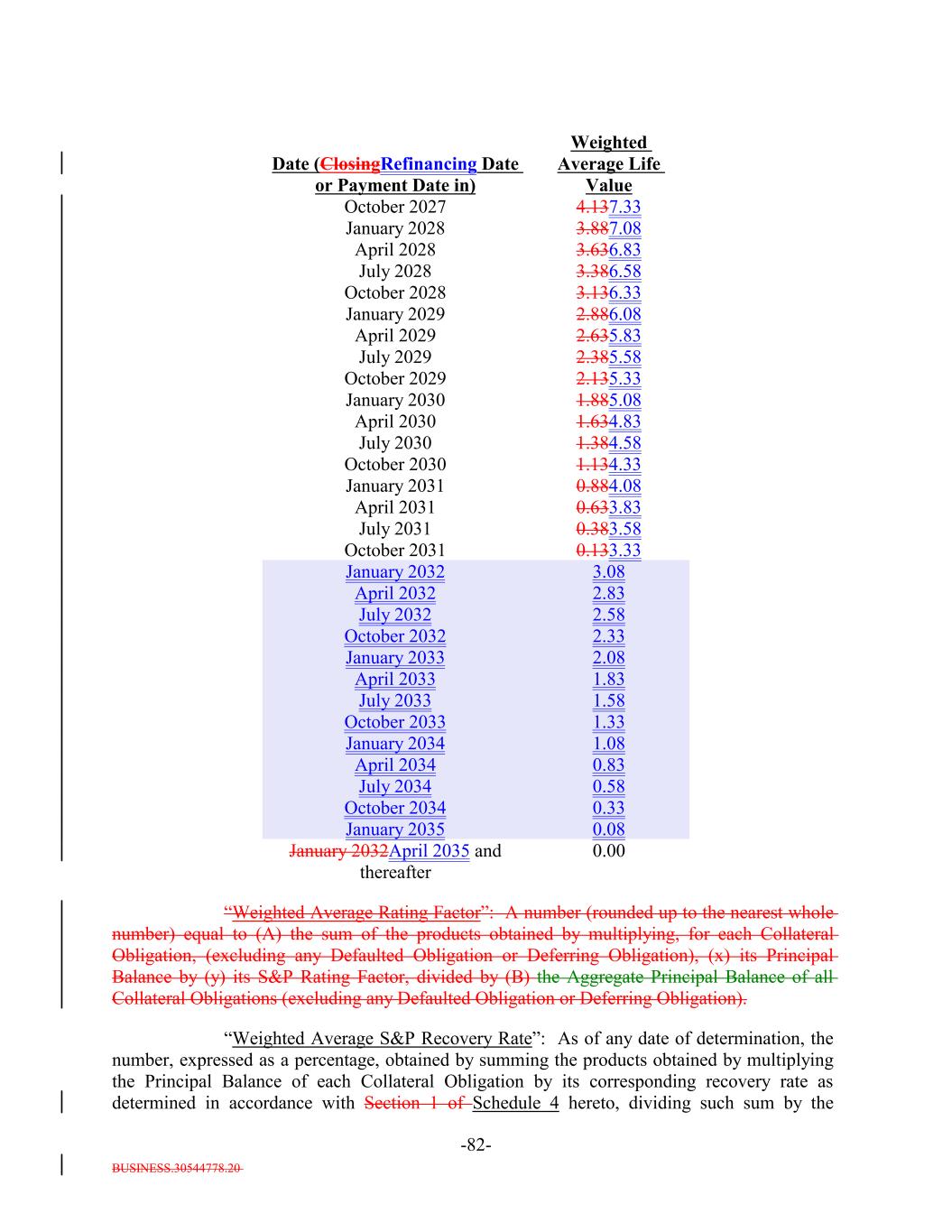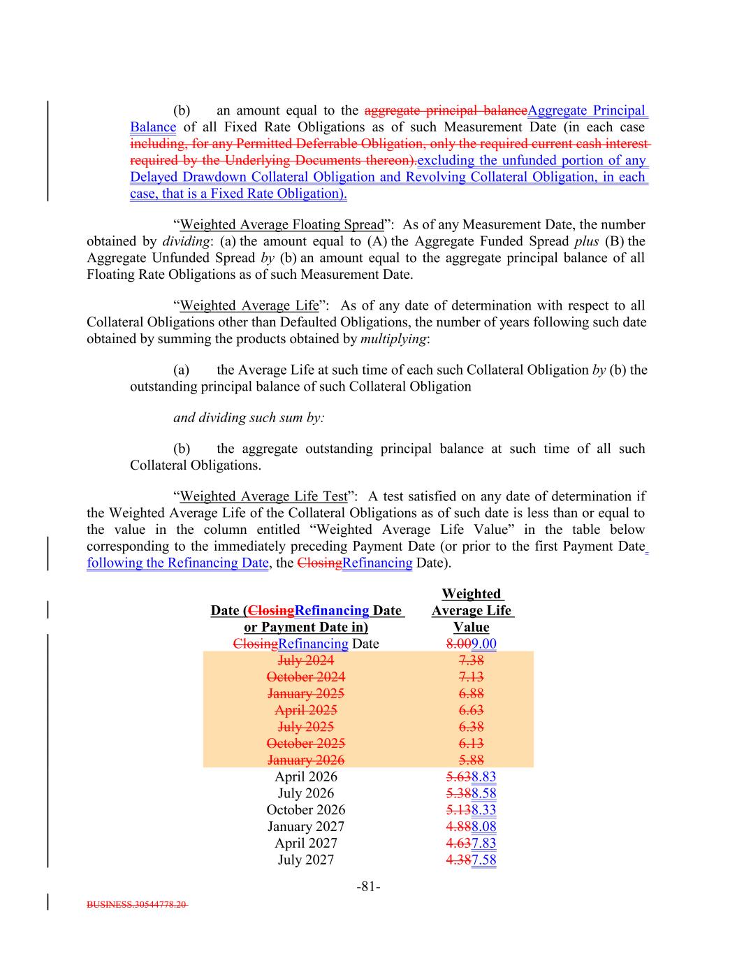 BUSINESS.30544778.20 -81- October 2024 January 2026 7.13 5.88 ClosingRefinancing Date April 2026 5.638.83 January 2025 8.009.00 July 2026 6.88 5.388.58 Date (ClosingRefinancing Date or Payment Date in) October 2026 5.138.33 April 2025 January 2027 6.63 4.888.08 July 2024 April 2027 Weighted Average Life Value 4.637.83 July 2025 7.38 July 2027 6.38 4.387.58 (b) an amount equal to the aggregate principal balanceAggregate Principal Balance of all Fixed Rate Obligations as of such Measurement Date (in each case including, for any Permitted Deferrable Obligation, only the required current cash interest required by the Underlying Documents thereon).excluding the unfunded portion of any Delayed Drawdown Collateral Obligation and Revolving Collateral Obligation, in each case, that is a Fixed Rate Obligation). “Weighted Average Floating Spread”: As of any Measurement Date, the number obtained by dividing: (a) the amount equal to (A) the Aggregate Funded Spread plus (B) the Aggregate Unfunded Spread by (b) an amount equal to the aggregate principal balance of all Floating Rate Obligations as of such Measurement Date. “Weighted Average Life”: As of any date of determination with respect to all Collateral Obligations other than Defaulted Obligations, the number of years following such date obtained by summing the products obtained by multiplying: (a) the Average Life at such time of each such Collateral Obligation by (b) the outstanding principal balance of such Collateral Obligation and dividing such sum by: (b) the aggregate outstanding principal balance at such time of all such Collateral Obligations. “Weighted Average Life Test”: A test satisfied on any date of determination if the Weighted Average Life of the Collateral Obligations as of such date is less than or equal to the value in the column entitled “Weighted Average Life Value” in the table below corresponding to the immediately preceding Payment Date (or prior to the first Payment Date following the Refinancing Date, the ClosingRefinancing Date). October 2025 6.13