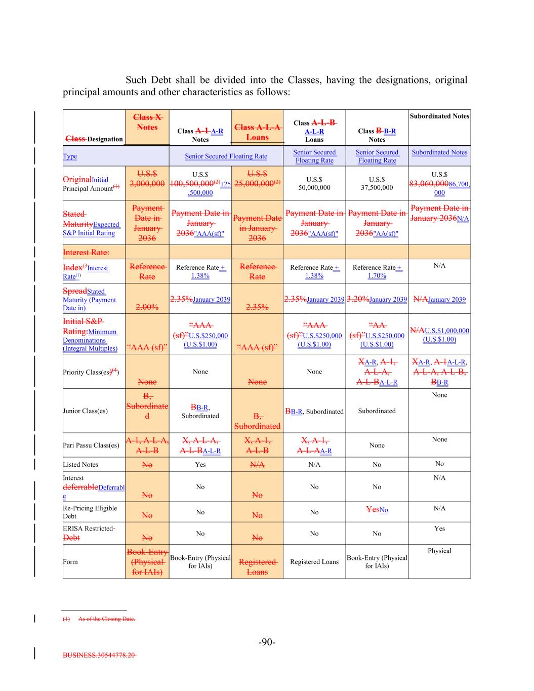 BUSINESS.30544778.20 -12- “Class”: In the case of (i) the Secured Debt, all of the Secured Debt having the same Interest Rate, Stated Maturity and class designation and (ii) the Subordinated Notes, all of the Subordinated Notes; provided that, solely for purposes of calculating the Interest Coverage Ratio and the Overcollateralization Ratio, the Class A Debt and the Class B Notes shall be treated as a single Class; provided further that, (x) except as provided in clause (y) of this provisoprovision, the Class A-1 Notes, the Class A-L-A Loans and the Class A-L-BA-L Loans shall constitute, and vote together as, a single Class and (y) the Class A-1 Notes, the Class A-L-A Loans and the Class A-L-BA-L Loans shall be treated as separate Classes, and shall vote separately, solely for the purposes of (1) any determination as to whether a proposed supplemental indenture or amendment would have a material adverse effect on such Debt and (2) a Refinancing or a Re-Pricing. Notwithstanding the foregoing, the Class X Notes constitute a separate Class from the Class A Debt, including for purposes of exercising any rights to consent, give direction or otherwise vote (and any determination relating to whether a proposed supplemental indenture would have a material and adverse effect on a Class). “Class A Debt”: The Class A-1 Notes, the Class A-L-A Loans and the Class A-L-BA-L Loans, collectively. “Class A Notes”: On and after the Refinancing Date, the Class A-R Senior Secured Floating Rate Notes issued pursuant to this Indenture and having the characteristics specified in Section 2.3. “Class A/B Coverage Tests”: The Overcollateralization Ratio Test and the Interest Coverage Test, each as applied with respect to the Class A Debt and the Class B Notes. “Class A-1 Notes”: The Class A-1 Senior Secured Floating Rate Notes issued pursuant to this Indenture and having the characteristics specified in Section 2.3. “Class A-L Lenders”: The Class A-L-A Lenders and the Class A-L-B Lenders, collectively. “Class A-L Loan Agreements”: The Class A-L-A Loan Agreement and the Class A-L-B Loan Agreement, collectively. “Class A-L-AA-L Lender”: Each lender under the Class A-L-A Loan Agreement with respect to the Class A-L-AA-L Loans. “Class A-L-A Loan Account”: The account established pursuant to the Class A-L-A Loan Agreement. “Class A-L-A Loan Agent”: U.S. Bank Trust Company, National Association, as loan agent under the Class A-L-A Loan Agreement, and any successor thereto. “Class A-L-A Loan Agreement”: The loan agreement entered into as of the Closing Date by the Issuer, as borrower, the Class A-L-A Lenders party thereto and the Class A-L-A Loan Agent.