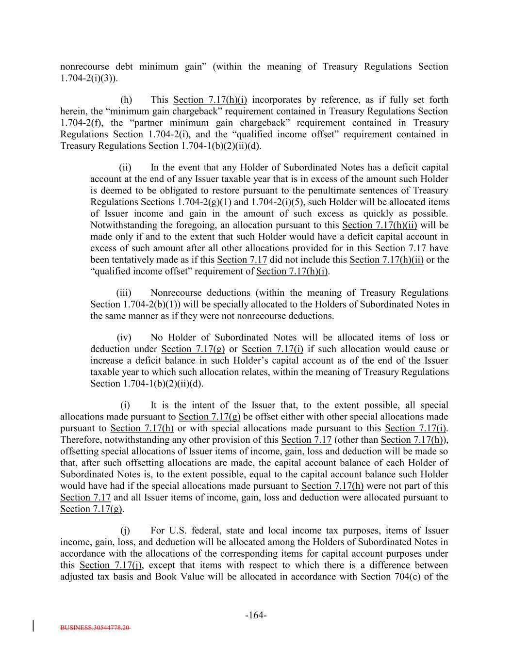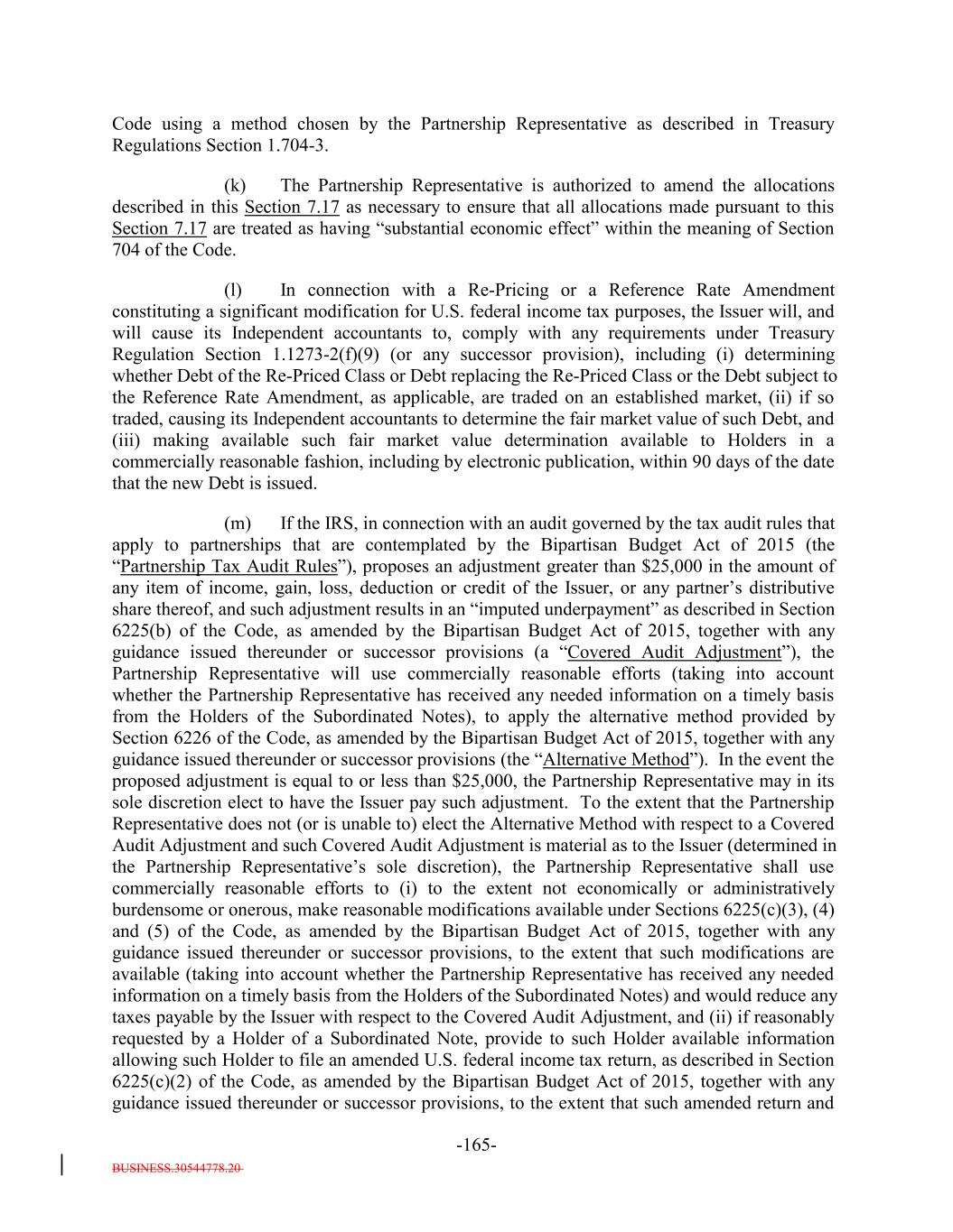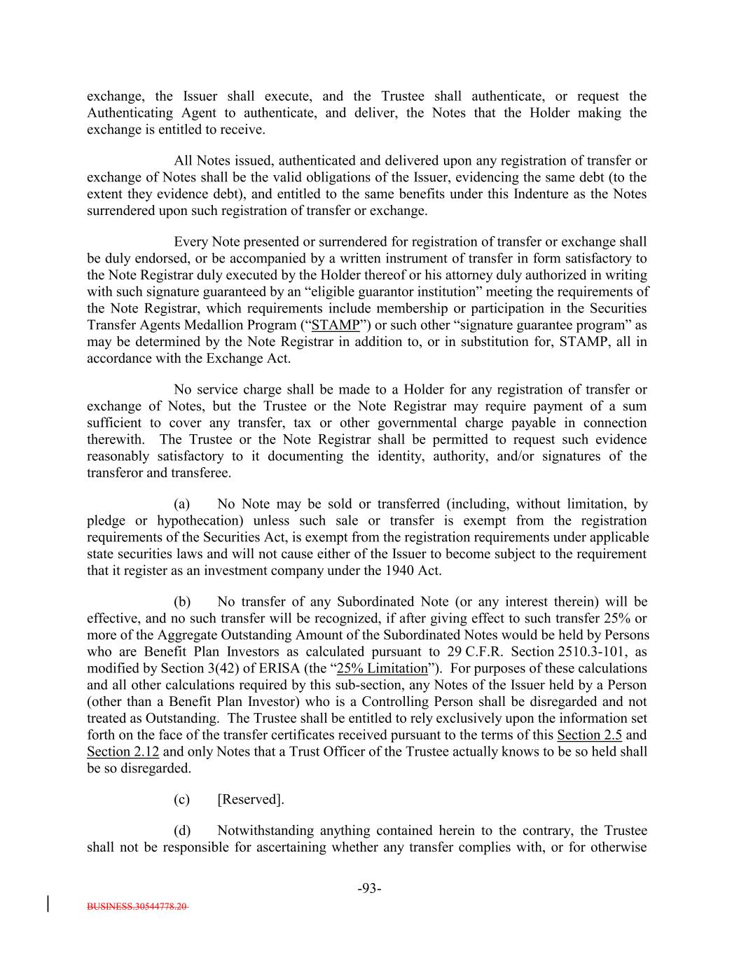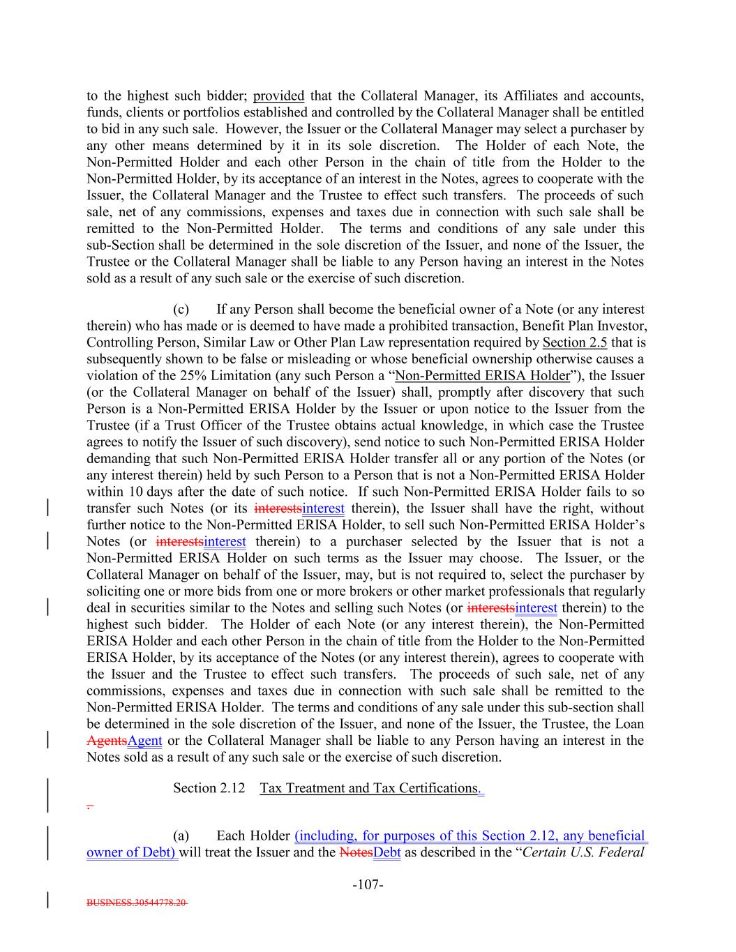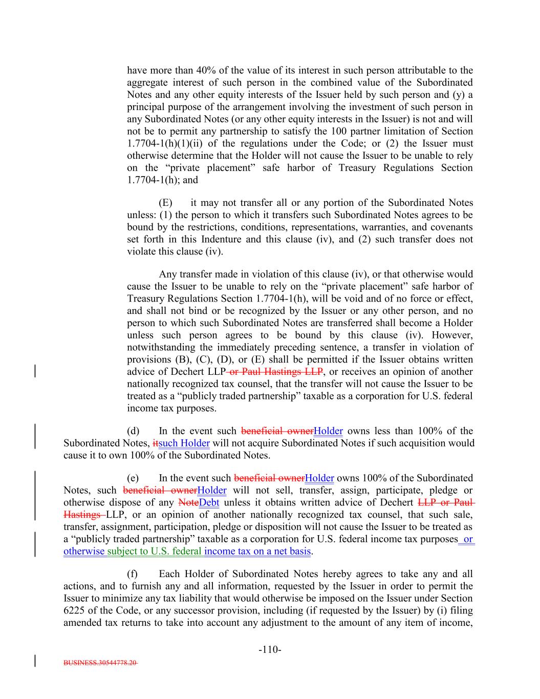 interdealer quotation system that regularly disseminates firm buy or sell quotations or (2) if such acquisition would cause the combined number of holders of Subordinated Notes and any equity interests in the Issuer to be held by more than 90 persons. 12. It acknowledges and agrees that it will not enter into any financial instrument the payments on which are, or the value of which is, determined in whole or in part by reference to the such Notes or other equity interests in the Issuer (including the amount of distributions on the such Notes or such equity interests, the value of the Issuer's assets, or the result of the Issuer's operations), or any contract that otherwise is described in Treasury Regulations Section 1.7704-1(a)(2)(i)(B). 13. It acknowledges and agrees that no Subordinated Note (or interest therein) may be acquired or owned by any person that is classified for U.S. federal income tax purposes as a partnership, subchapter S corporation or grantor trust unless (1)(x) none of the direct or indirect Holdersholders of any interest in such person have more than 40% of the value of its interest in such person attributable to the aggregate interest of such person in the combined value of the Subordinated Notes and any other equity interests of the Issuer held by such person and (y) a principal purpose of the arrangement involving the investment of such person in any Subordinated Notes (or any other equity interests in the Issuer) is not and will not be to permit any partnership to satisfy the 100 partner limitation of Section 1.7704-1(h)(1)(ii) of the regulations under the Code; or (2) the Issuer must otherwise determine that the holderAcquirer will not cause the Issuer to be unable to rely on the "private placement" safe harbor of Treasury Regulations Section 1.7704-1(h). 14. It may not transfer all or any portion of the Subordinated Notes unless: (1) the person to which it transfers such Subordinated Notes agrees to be bound by the restrictions, conditions, representations, warranties, and covenants set forth in the Indenture and Section 2.12(c)(iv) therein, and (2) such transfer does not violate Section 2.12(c)(iv) of the Indenture. 15. Any transfer made in violation of Section 2.12(c)(iv) of the Indenture, or that otherwise would cause the Issuer to be unable to rely on the "private placement" safe harbor of Treasury Regulations Section 1.7704-1(h), will be void and of no force or effect, and shall not bind or be recognized by the Issuer or any other person, and no person to which such Subordinated Notes are transferred shall become a holderan Acquirer unless such person agrees to be bound by Section 2.12(c)(iv) of the Indenture. However, notwithstanding the immediately preceding sentence, a transfer in violation of provisions (11), (12), (13), or (14), or (15) shall be permitted if the Issuer obtains written advice of Dechert LLP or Paul Hastings LLP, or receives an opinion of another nationally recognized tax counsel, that the transfer will not cause the Issuer to be treated as a "publicly traded partnership" taxable as a corporation for U.S. federal income tax purposes. 16. If it holds 100% of the Subordinated Notes (or any interest therein), it will not sell, transfer, assign, participate, pledge or otherwise dispose of any of its Notes, unless it obtains written advice of Dechert LLP or Paul Hastings LLP, or an opinion of another B-3-5