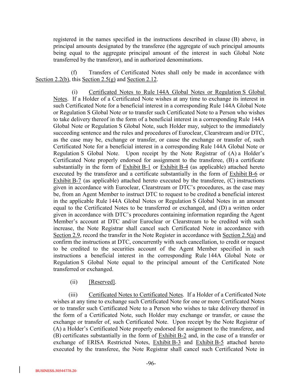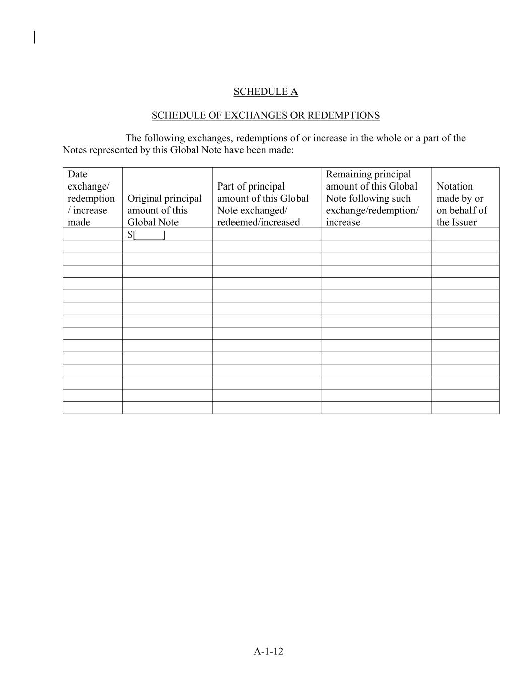A-1-12 Part of principal amount of this Global Note exchanged/ redeemed/increased Remaining principal amount of this Global Note following such exchange/redemption/ increase Notation made by or on behalf of the Issuer Date exchange/ redemption / increase made Original principal amount of this Global Note $[_____] SCHEDULE A SCHEDULE OF EXCHANGES OR REDEMPTIONS The following exchanges, redemptions of or increase in the whole or a part of the Notes represented by this Global Note have been made:
