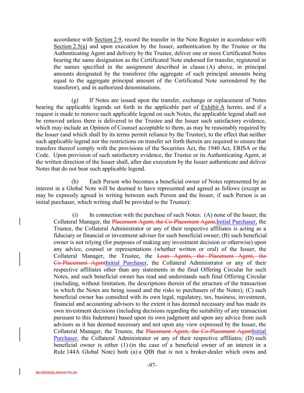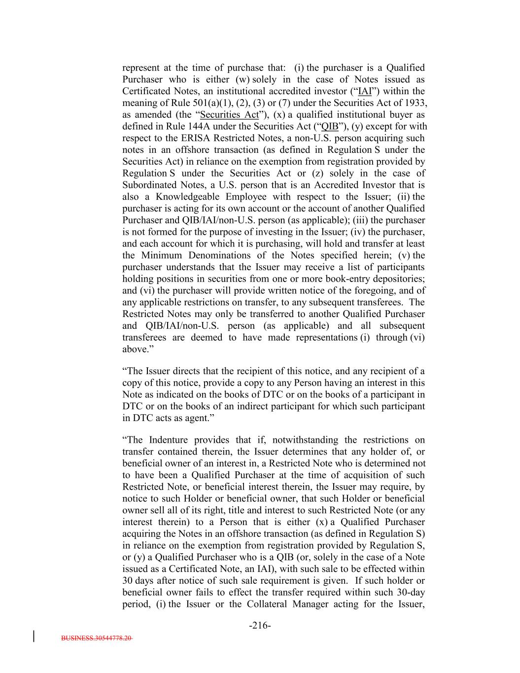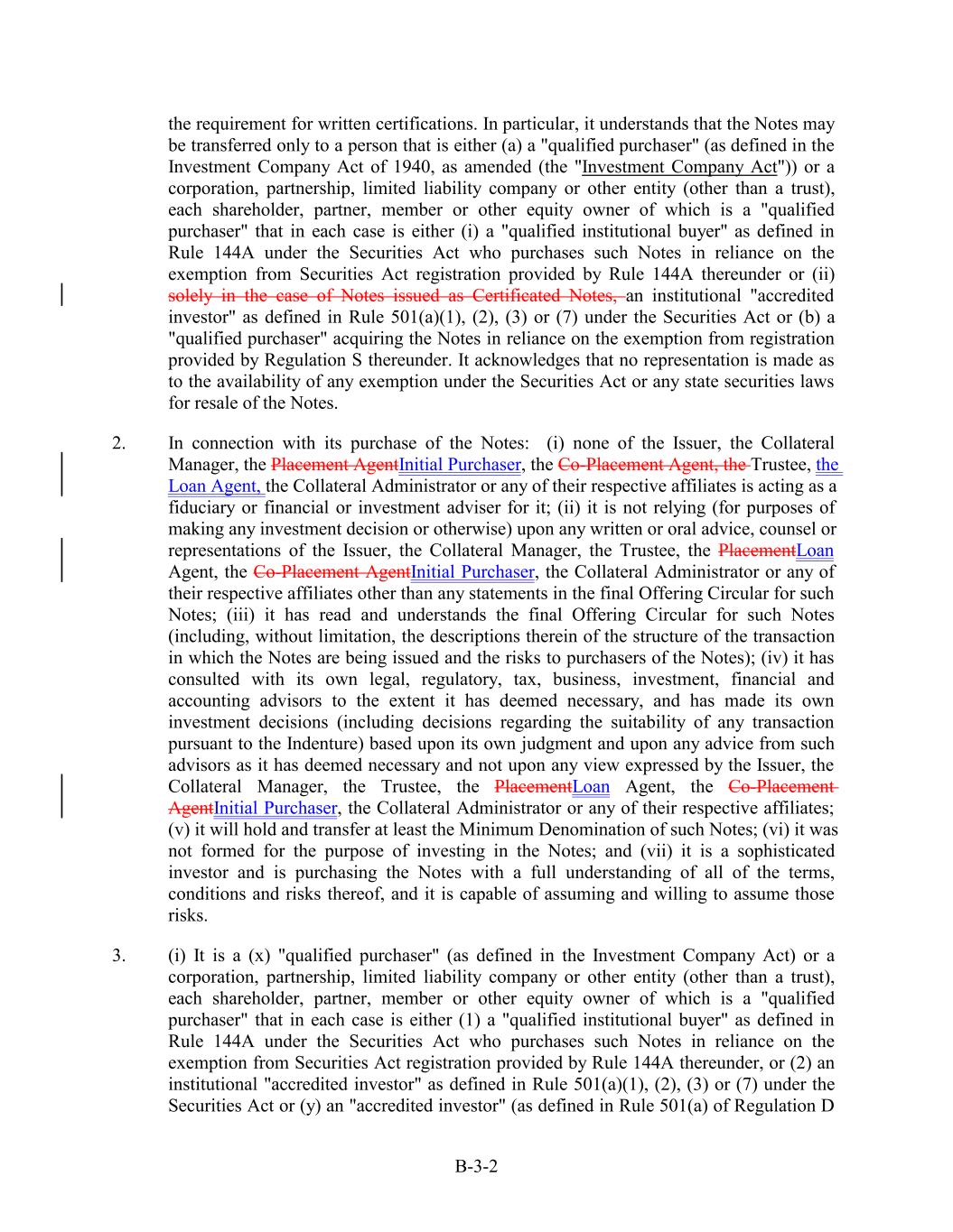 the requirement for written certifications. In particular, it understands that the Notes may be transferred only to a person that is either (a) a "qualified purchaser" (as defined in the Investment Company Act of 1940, as amended (the "Investment Company Act")) or a corporation, partnership, limited liability company or other entity (other than a trust), each shareholder, partner, member or other equity owner of which is a "qualified purchaser" that in each case is either (i) a "qualified institutional buyer" as defined in Rule 144A under the Securities Act who purchases such Notes in reliance on the exemption from Securities Act registration provided by Rule 144A thereunder or (ii) solely in the case of Notes issued as Certificated Notes, an institutional "accredited investor" as defined in Rule 501(a)(1), (2), (3) or (7) under the Securities Act or (b) a "qualified purchaser" acquiring the Notes in reliance on the exemption from registration provided by Regulation S thereunder. It acknowledges that no representation is made as to the availability of any exemption under the Securities Act or any state securities laws for resale of the Notes. 2. In connection with its purchase of the Notes: (i) none of the Issuer, the Collateral Manager, the Placement AgentInitial Purchaser, the Co-Placement Agent, the Trustee, the Loan Agent, the Collateral Administrator or any of their respective affiliates is acting as a fiduciary or financial or investment adviser for it; (ii) it is not relying (for purposes of making any investment decision or otherwise) upon any written or oral advice, counsel or representations of the Issuer, the Collateral Manager, the Trustee, the PlacementLoan Agent, the Co-Placement AgentInitial Purchaser, the Collateral Administrator or any of their respective affiliates other than any statements in the final Offering Circular for such Notes; (iii) it has read and understands the final Offering Circular for such Notes (including, without limitation, the descriptions therein of the structure of the transaction in which the Notes are being issued and the risks to purchasers of the Notes); (iv) it has consulted with its own legal, regulatory, tax, business, investment, financial and accounting advisors to the extent it has deemed necessary, and has made its own investment decisions (including decisions regarding the suitability of any transaction pursuant to the Indenture) based upon its own judgment and upon any advice from such advisors as it has deemed necessary and not upon any view expressed by the Issuer, the Collateral Manager, the Trustee, the PlacementLoan Agent, the Co-Placement AgentInitial Purchaser, the Collateral Administrator or any of their respective affiliates; (v) it will hold and transfer at least the Minimum Denomination of such Notes; (vi) it was not formed for the purpose of investing in the Notes; and (vii) it is a sophisticated investor and is purchasing the Notes with a full understanding of all of the terms, conditions and risks thereof, and it is capable of assuming and willing to assume those risks. 3. (i) It is a (x) "qualified purchaser" (as defined in the Investment Company Act) or a corporation, partnership, limited liability company or other entity (other than a trust), each shareholder, partner, member or other equity owner of which is a "qualified purchaser" that in each case is either (1) a "qualified institutional buyer" as defined in Rule 144A under the Securities Act who purchases such Notes in reliance on the exemption from Securities Act registration provided by Rule 144A thereunder, or (2) an institutional "accredited investor" as defined in Rule 501(a)(1), (2), (3) or (7) under the Securities Act or (y) an "accredited investor" (as defined in Rule 501(a) of Regulation D B-3-2