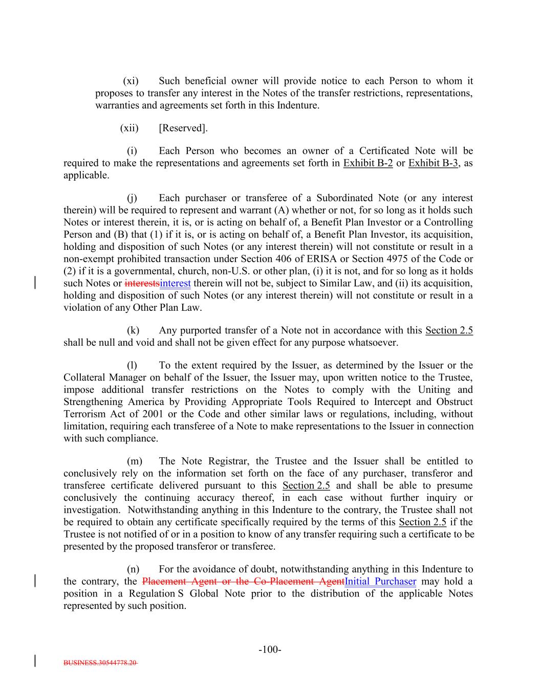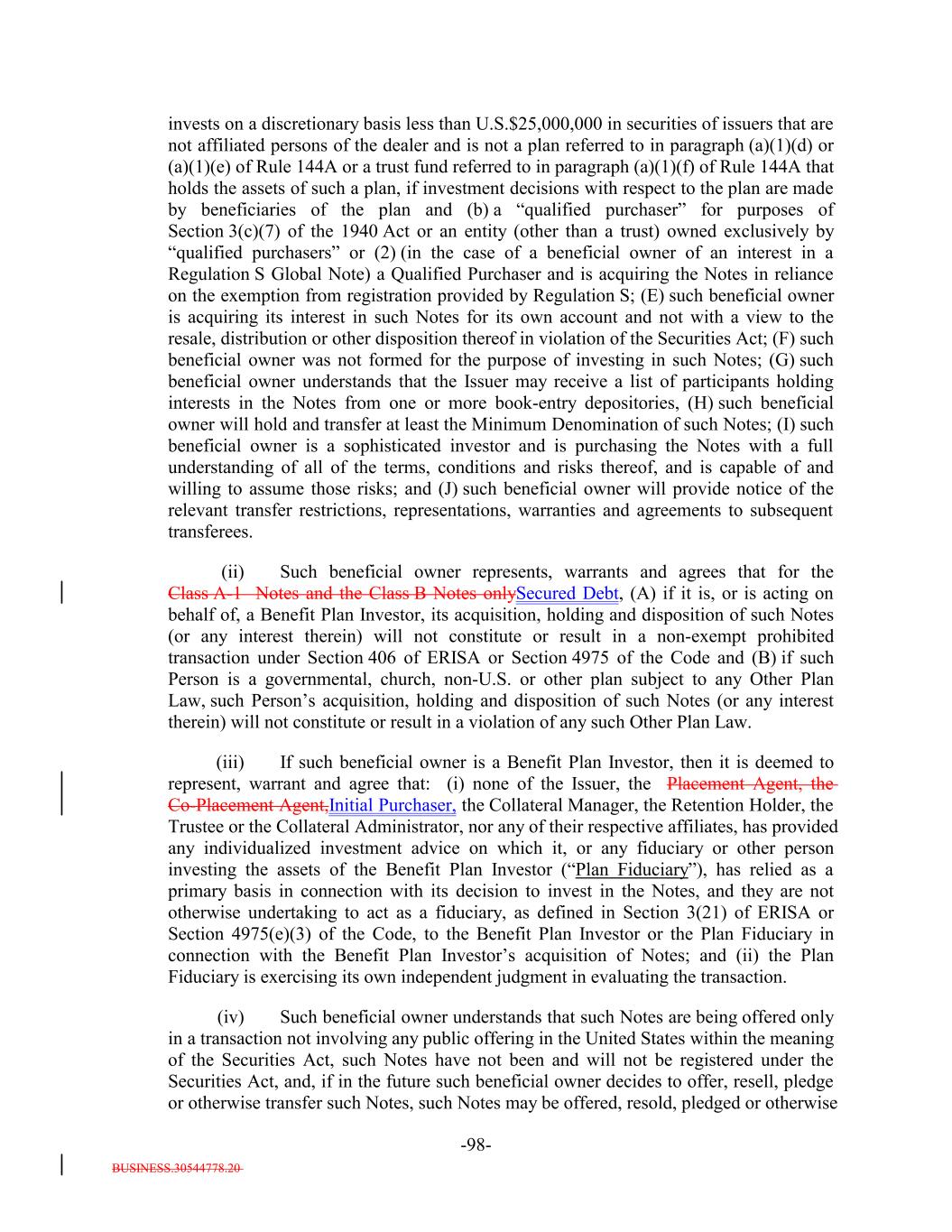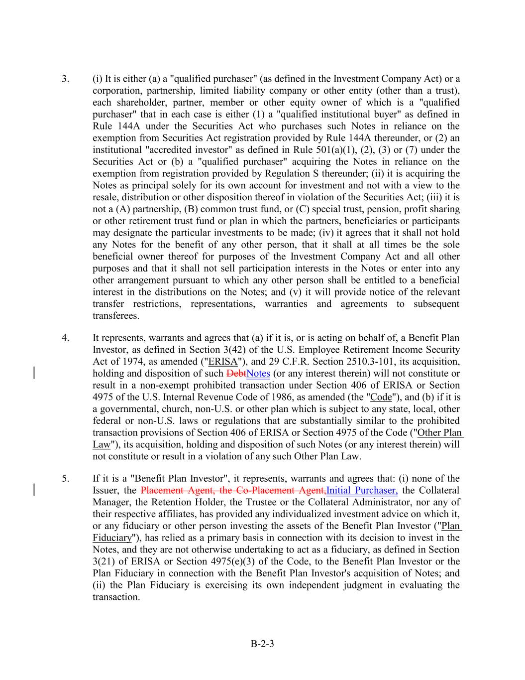 3. (i) It is either (a) a "qualified purchaser" (as defined in the Investment Company Act) or a corporation, partnership, limited liability company or other entity (other than a trust), each shareholder, partner, member or other equity owner of which is a "qualified purchaser" that in each case is either (1) a "qualified institutional buyer" as defined in Rule 144A under the Securities Act who purchases such Notes in reliance on the exemption from Securities Act registration provided by Rule 144A thereunder, or (2) an institutional "accredited investor" as defined in Rule 501(a)(1), (2), (3) or (7) under the Securities Act or (b) a "qualified purchaser" acquiring the Notes in reliance on the exemption from registration provided by Regulation S thereunder; (ii) it is acquiring the Notes as principal solely for its own account for investment and not with a view to the resale, distribution or other disposition thereof in violation of the Securities Act; (iii) it is not a (A) partnership, (B) common trust fund, or (C) special trust, pension, profit sharing or other retirement trust fund or plan in which the partners, beneficiaries or participants may designate the particular investments to be made; (iv) it agrees that it shall not hold any Notes for the benefit of any other person, that it shall at all times be the sole beneficial owner thereof for purposes of the Investment Company Act and all other purposes and that it shall not sell participation interests in the Notes or enter into any other arrangement pursuant to which any other person shall be entitled to a beneficial interest in the distributions on the Notes; and (v) it will provide notice of the relevant transfer restrictions, representations, warranties and agreements to subsequent transferees. 4. It represents, warrants and agrees that (a) if it is, or is acting on behalf of, a Benefit Plan Investor, as defined in Section 3(42) of the U.S. Employee Retirement Income Security Act of 1974, as amended ("ERISA"), and 29 C.F.R. Section 2510.3-101, its acquisition, holding and disposition of such DebtNotes (or any interest therein) will not constitute or result in a non-exempt prohibited transaction under Section 406 of ERISA or Section 4975 of the U.S. Internal Revenue Code of 1986, as amended (the "Code"), and (b) if it is a governmental, church, non-U.S. or other plan which is subject to any state, local, other federal or non-U.S. laws or regulations that are substantially similar to the prohibited transaction provisions of Section 406 of ERISA or Section 4975 of the Code ("Other Plan Law"), its acquisition, holding and disposition of such Notes (or any interest therein) will not constitute or result in a violation of any such Other Plan Law. 5. If it is a "Benefit Plan Investor", it represents, warrants and agrees that: (i) none of the Issuer, the Placement Agent, the Co-Placement Agent,Initial Purchaser, the Collateral Manager, the Retention Holder, the Trustee or the Collateral Administrator, nor any of their respective affiliates, has provided any individualized investment advice on which it, or any fiduciary or other person investing the assets of the Benefit Plan Investor ("Plan Fiduciary"), has relied as a primary basis in connection with its decision to invest in the Notes, and they are not otherwise undertaking to act as a fiduciary, as defined in Section 3(21) of ERISA or Section 4975(e)(3) of the Code, to the Benefit Plan Investor or the Plan Fiduciary in connection with the Benefit Plan Investor's acquisition of Notes; and (ii) the Plan Fiduciary is exercising its own independent judgment in evaluating the transaction. B-2-3