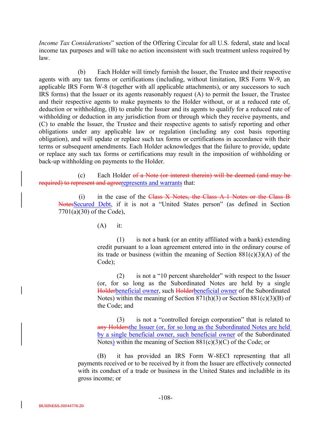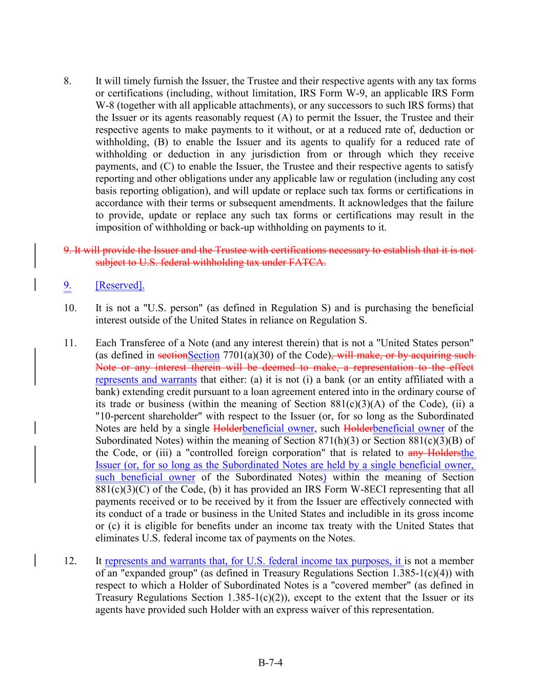 8. It will timely furnish the Issuer, the Trustee and their respective agents with any tax forms or certifications (including, without limitation, IRS Form W-9, an applicable IRS Form W-8 (together with all applicable attachments), or any successors to such IRS forms) that the Issuer or its agents reasonably request (A) to permit the Issuer, the Trustee and their respective agents to make payments to it without, or at a reduced rate of, deduction or withholding, (B) to enable the Issuer and its agents to qualify for a reduced rate of withholding or deduction in any jurisdiction from or through which they receive payments, and (C) to enable the Issuer, the Trustee and their respective agents to satisfy reporting and other obligations under any applicable law or regulation (including any cost basis reporting obligation), and will update or replace such tax forms or certifications in accordance with their terms or subsequent amendments. It acknowledges that the failure to provide, update or replace any such tax forms or certifications may result in the imposition of withholding or back-up withholding on payments to it. 9. It will provide the Issuer and the Trustee with certifications necessary to establish that it is not subject to U.S. federal withholding tax under FATCA. 9. [Reserved]. 10. It is not a "U.S. person" (as defined in Regulation S) and is purchasing the beneficial interest outside of the United States in reliance on Regulation S. 11. Each Transferee of a Note (and any interest therein) that is not a "United States person" (as defined in sectionSection 7701(a)(30) of the Code), will make, or by acquiring such Note or any interest therein will be deemed to make, a representation to the effect represents and warrants that either: (a) it is not (i) a bank (or an entity affiliated with a bank) extending credit pursuant to a loan agreement entered into in the ordinary course of its trade or business (within the meaning of Section 881(c)(3)(A) of the Code), (ii) a "10-percent shareholder" with respect to the Issuer (or, for so long as the Subordinated Notes are held by a single Holderbeneficial owner, such Holderbeneficial owner of the Subordinated Notes) within the meaning of Section 871(h)(3) or Section 881(c)(3)(B) of the Code, or (iii) a "controlled foreign corporation" that is related to any Holdersthe Issuer (or, for so long as the Subordinated Notes are held by a single beneficial owner, such beneficial owner of the Subordinated Notes) within the meaning of Section 881(c)(3)(C) of the Code, (b) it has provided an IRS Form W-8ECI representing that all payments received or to be received by it from the Issuer are effectively connected with its conduct of a trade or business in the United States and includible in its gross income or (c) it is eligible for benefits under an income tax treaty with the United States that eliminates U.S. federal income tax of payments on the Notes. 12. It represents and warrants that, for U.S. federal income tax purposes, it is not a member of an "expanded group" (as defined in Treasury Regulations Section 1.385-1(c)(4)) with respect to which a Holder of Subordinated Notes is a "covered member" (as defined in Treasury Regulations Section 1.385-1(c)(2)), except to the extent that the Issuer or its agents have provided such Holder with an express waiver of this representation. B-7-4