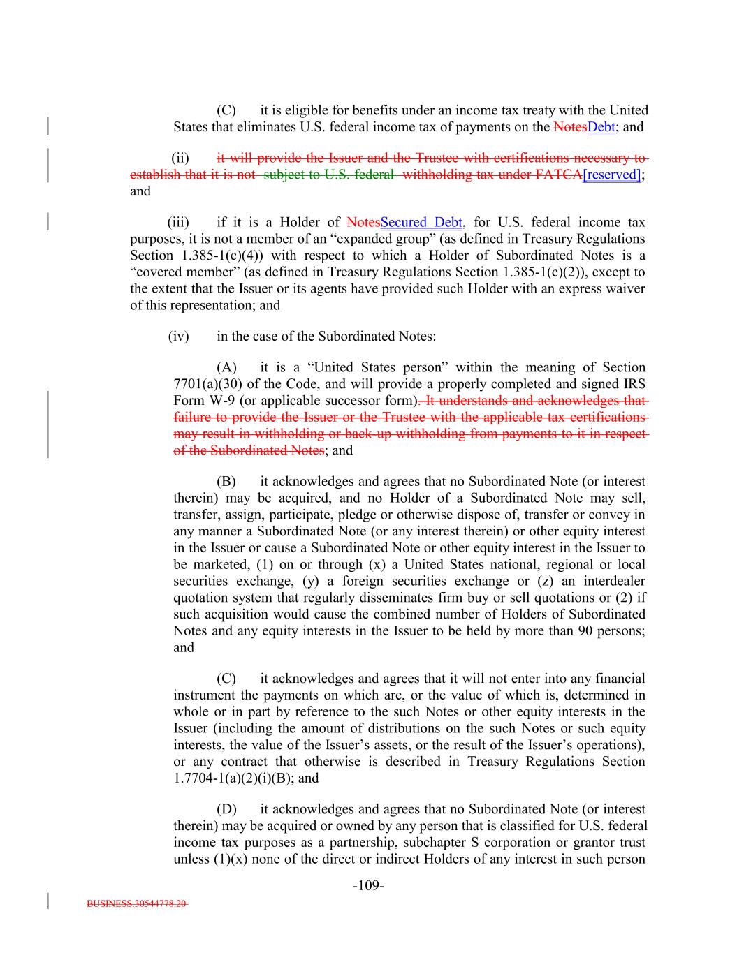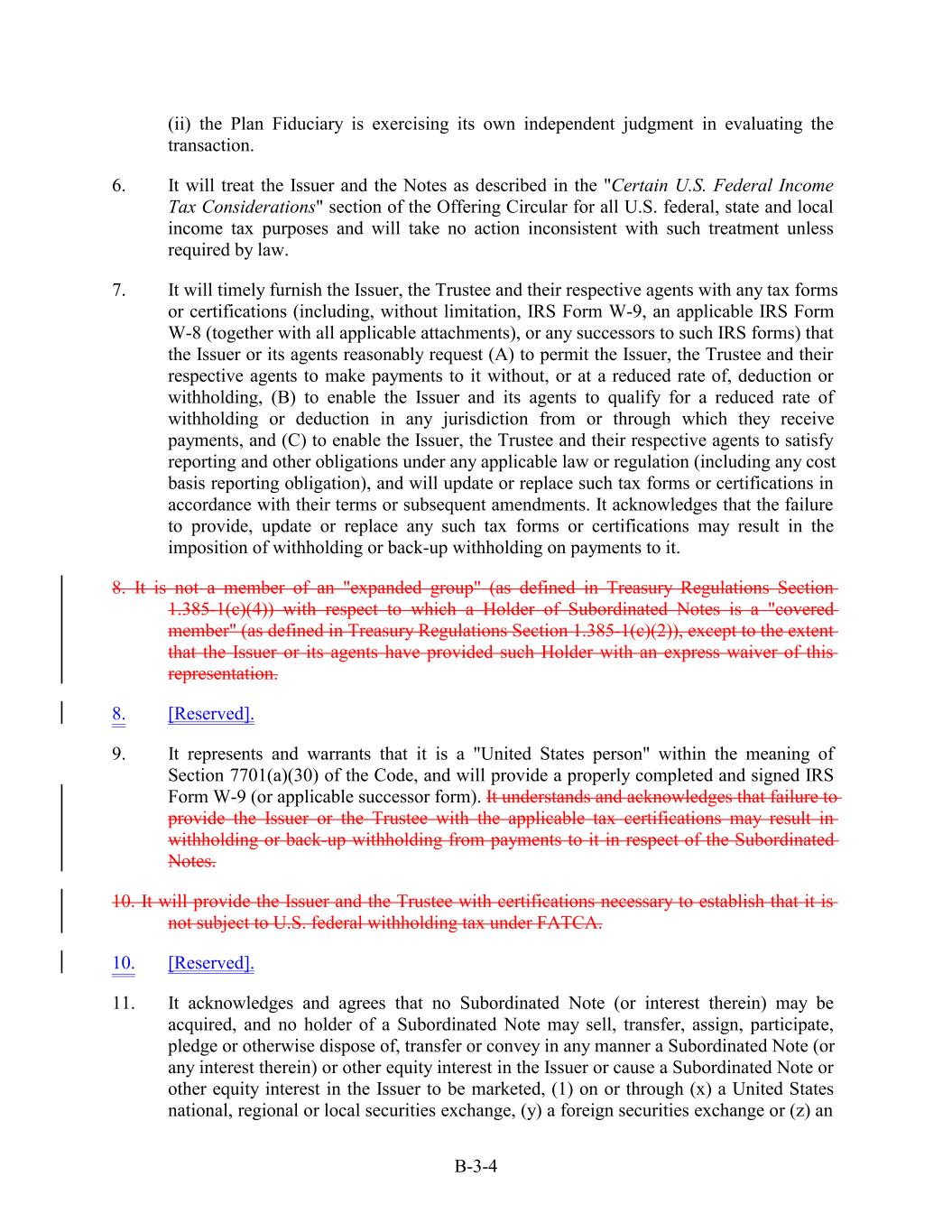 (ii) the Plan Fiduciary is exercising its own independent judgment in evaluating the transaction. 6. It will treat the Issuer and the Notes as described in the "Certain U.S. Federal Income Tax Considerations" section of the Offering Circular for all U.S. federal, state and local income tax purposes and will take no action inconsistent with such treatment unless required by law. 7. It will timely furnish the Issuer, the Trustee and their respective agents with any tax forms or certifications (including, without limitation, IRS Form W-9, an applicable IRS Form W-8 (together with all applicable attachments), or any successors to such IRS forms) that the Issuer or its agents reasonably request (A) to permit the Issuer, the Trustee and their respective agents to make payments to it without, or at a reduced rate of, deduction or withholding, (B) to enable the Issuer and its agents to qualify for a reduced rate of withholding or deduction in any jurisdiction from or through which they receive payments, and (C) to enable the Issuer, the Trustee and their respective agents to satisfy reporting and other obligations under any applicable law or regulation (including any cost basis reporting obligation), and will update or replace such tax forms or certifications in accordance with their terms or subsequent amendments. It acknowledges that the failure to provide, update or replace any such tax forms or certifications may result in the imposition of withholding or back-up withholding on payments to it. 8. It is not a member of an "expanded group" (as defined in Treasury Regulations Section 1.385-1(c)(4)) with respect to which a Holder of Subordinated Notes is a "covered member" (as defined in Treasury Regulations Section 1.385-1(c)(2)), except to the extent that the Issuer or its agents have provided such Holder with an express waiver of this representation. 8. [Reserved]. 9. It represents and warrants that it is a "United States person" within the meaning of Section 7701(a)(30) of the Code, and will provide a properly completed and signed IRS Form W-9 (or applicable successor form). It understands and acknowledges that failure to provide the Issuer or the Trustee with the applicable tax certifications may result in withholding or back-up withholding from payments to it in respect of the Subordinated Notes. 10. It will provide the Issuer and the Trustee with certifications necessary to establish that it is not subject to U.S. federal withholding tax under FATCA. 10. [Reserved]. 11. It acknowledges and agrees that no Subordinated Note (or interest therein) may be acquired, and no holder of a Subordinated Note may sell, transfer, assign, participate, pledge or otherwise dispose of, transfer or convey in any manner a Subordinated Note (or any interest therein) or other equity interest in the Issuer or cause a Subordinated Note or other equity interest in the Issuer to be marketed, (1) on or through (x) a United States national, regional or local securities exchange, (y) a foreign securities exchange or (z) an B-3-4