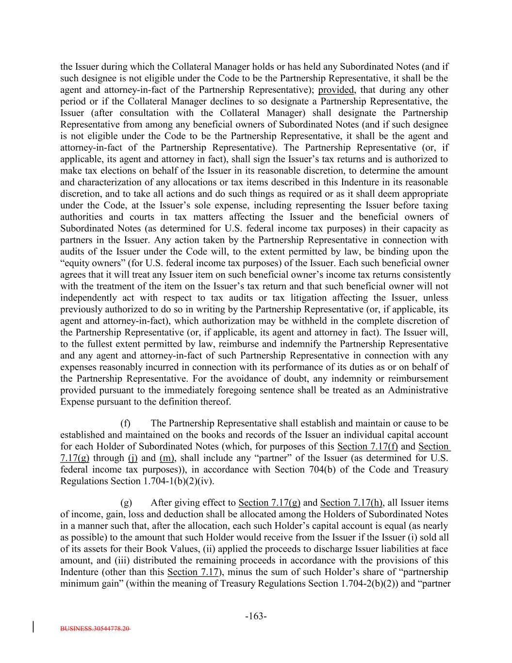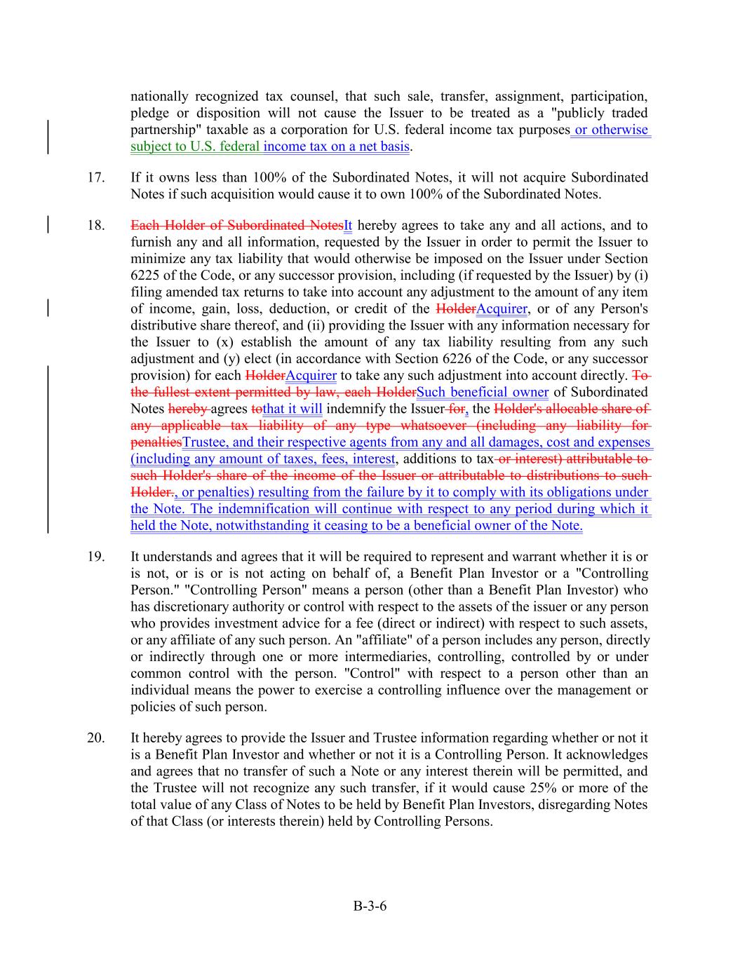 nationally recognized tax counsel, that such sale, transfer, assignment, participation, pledge or disposition will not cause the Issuer to be treated as a "publicly traded partnership" taxable as a corporation for U.S. federal income tax purposes or otherwise subject to U.S. federal income tax on a net basis. 17. If it owns less than 100% of the Subordinated Notes, it will not acquire Subordinated Notes if such acquisition would cause it to own 100% of the Subordinated Notes. 18. Each Holder of Subordinated NotesIt hereby agrees to take any and all actions, and to furnish any and all information, requested by the Issuer in order to permit the Issuer to minimize any tax liability that would otherwise be imposed on the Issuer under Section 6225 of the Code, or any successor provision, including (if requested by the Issuer) by (i) filing amended tax returns to take into account any adjustment to the amount of any item of income, gain, loss, deduction, or credit of the HolderAcquirer, or of any Person's distributive share thereof, and (ii) providing the Issuer with any information necessary for the Issuer to (x) establish the amount of any tax liability resulting from any such adjustment and (y) elect (in accordance with Section 6226 of the Code, or any successor provision) for each HolderAcquirer to take any such adjustment into account directly. To the fullest extent permitted by law, each HolderSuch beneficial owner of Subordinated Notes hereby agrees tothat it will indemnify the Issuer for, the Holder's allocable share of any applicable tax liability of any type whatsoever (including any liability for penaltiesTrustee, and their respective agents from any and all damages, cost and expenses (including any amount of taxes, fees, interest, additions to tax or interest) attributable to such Holder's share of the income of the Issuer or attributable to distributions to such Holder., or penalties) resulting from the failure by it to comply with its obligations under the Note. The indemnification will continue with respect to any period during which it held the Note, notwithstanding it ceasing to be a beneficial owner of the Note. 19. It understands and agrees that it will be required to represent and warrant whether it is or is not, or is or is not acting on behalf of, a Benefit Plan Investor or a "Controlling Person." "Controlling Person" means a person (other than a Benefit Plan Investor) who has discretionary authority or control with respect to the assets of the issuer or any person who provides investment advice for a fee (direct or indirect) with respect to such assets, or any affiliate of any such person. An "affiliate" of a person includes any person, directly or indirectly through one or more intermediaries, controlling, controlled by or under common control with the person. "Control" with respect to a person other than an individual means the power to exercise a controlling influence over the management or policies of such person. 20. It hereby agrees to provide the Issuer and Trustee information regarding whether or not it is a Benefit Plan Investor and whether or not it is a Controlling Person. It acknowledges and agrees that no transfer of such a Note or any interest therein will be permitted, and the Trustee will not recognize any such transfer, if it would cause 25% or more of the total value of any Class of Notes to be held by Benefit Plan Investors, disregarding Notes of that Class (or interests therein) held by Controlling Persons. B-3-6
