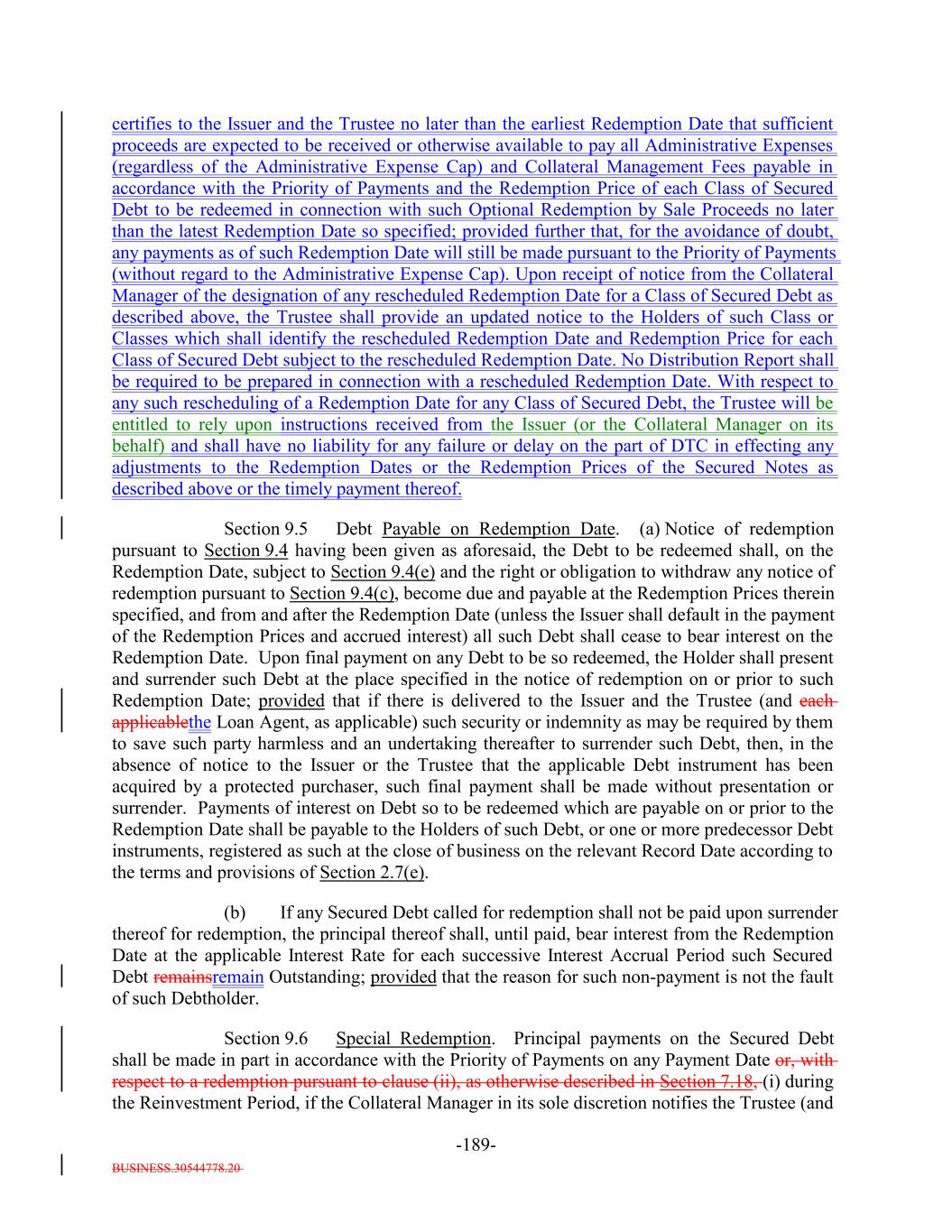 any Tax Redemption, Clean-Up Call Redemption or Optional Redemption of the Secured Debt in whole, holders of 100% of the aggregate outstanding principal amount of any Class of Secured Debt may elect to receive less than 100% of the Redemption Price that would otherwise be payable to the Holders of such Class of Secured Debt. If the Note Details indicate that this Note is Global Eligible, this Note may be transferred to a transferee acquiring Certificated Notes, to a transferee taking an interest in a Rule 144A Global Note or to a transferee taking an interest in a Regulation S Global Note, subject to and in accordance with the restrictions set forth in the Indenture. The Issuer, the Trustee, and any agent of the Issuer or the Trustee may treat the Person in whose name this Note is registered on the Note Register on the applicable Record Date as the owner of such Note for the purpose of receiving payments of principal of and interest on such Note and on any other date for all other purposes whatsoever (whether or not such Note is overdue), and neither the Issuer nor the Trustee nor any agent of the Issuer or the Trustee shall be affected by notice to the contrary. The Secured Notes shall be held in minimum denominations of U.S.$250,000 and integral multiples of U.S.$1 in excess thereof. If an Event of Default shall occur and be continuing, the DebtNotes may become or be declared due and payable in the manner and with the effect provided in the Indenture. Title to Notes shall pass by registration in the Note Register kept by the Trustee, acting through its Corporate Trust Office. No service charge shall be made for registration of transfer or exchange of this Note, but the Trustee or the Note Registrar may require payment of a sum sufficient to cover any tax or other governmental charge payable in connection therewith. Each holder and beneficial owner of this Note, by its acceptance of this Note, hereby agrees that they shall not institute against, or join any other Person in instituting against the Issuer any bankruptcy, reorganization, arrangement, insolvency, moratorium or liquidation Proceedings or other similar Proceedings under U.S. federal or state bankruptcy laws or any similar laws until at least one year and one day after payment in full of the NotesDebt, or, if longer, any applicable preference period then in effect plus one day following such payment in full. THIS NOTE MAY BE EXECUTED OR AUTHENTICATED IN ANY NUMBER OF COUNTERPARTS, EACH OF WHICH SO EXECUTED OR AUTHENTICATED SHALL BE DEEMED TO BE AN ORIGINAL, BUT ALL SUCH COUNTERPARTS SHALL TOGETHER CONSTITUTE BUT ONE AND THE SAME INSTRUMENT. DELIVERY OF AN EXECUTED OR AUTHENTICATED COUNTERPART OF THIS NOTE BY ELECTRONIC MEANS (INCLUDING EMAIL, PORTABLE DOCUMENT FORMAT (PDF) FILE OR FACSIMILE) WILL BE EFFECTIVE AS DELIVERY OF A MANUALLY EXECUTED OR AUTHENTICATED COUNTERPART OF THIS NOTE. A-2-8